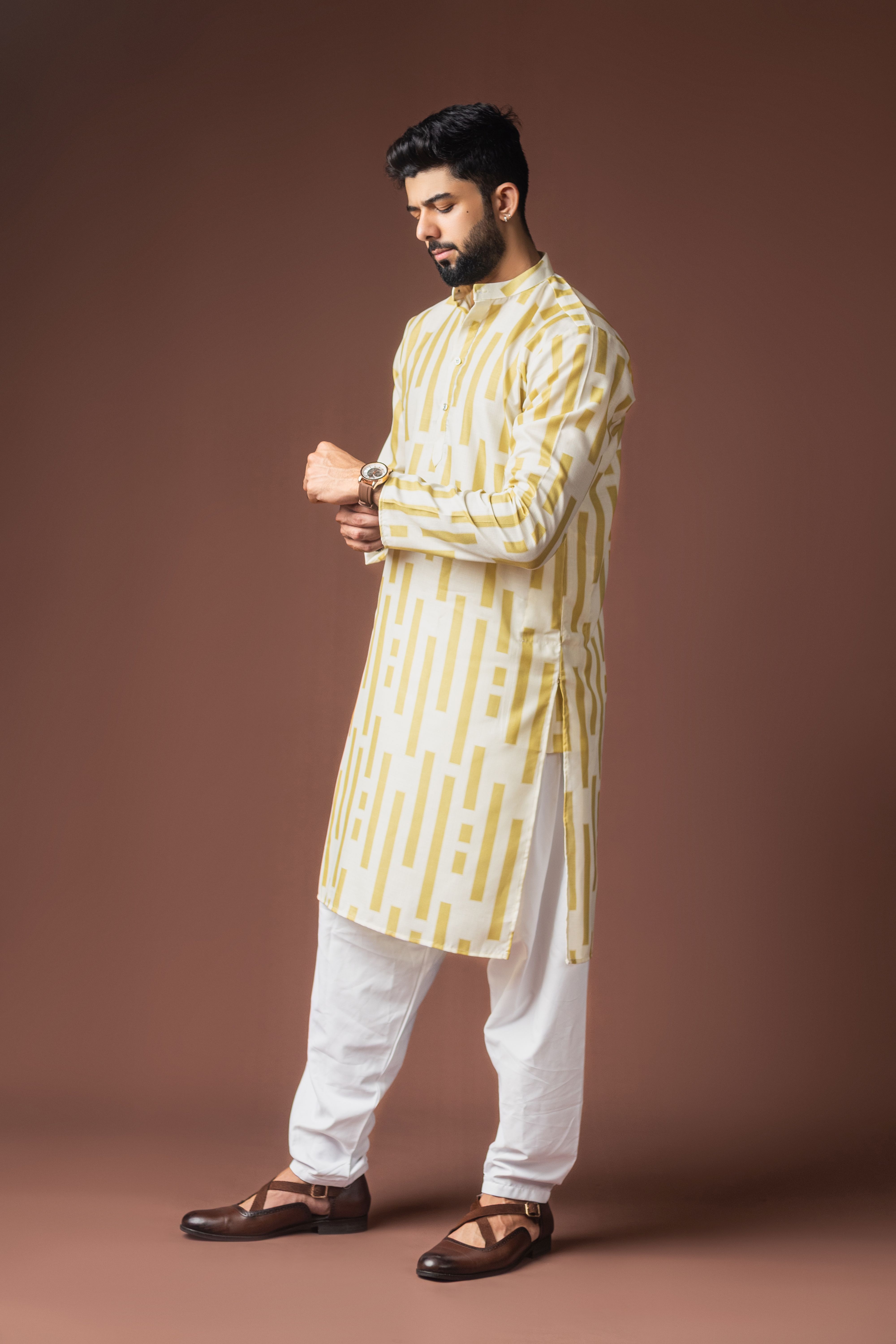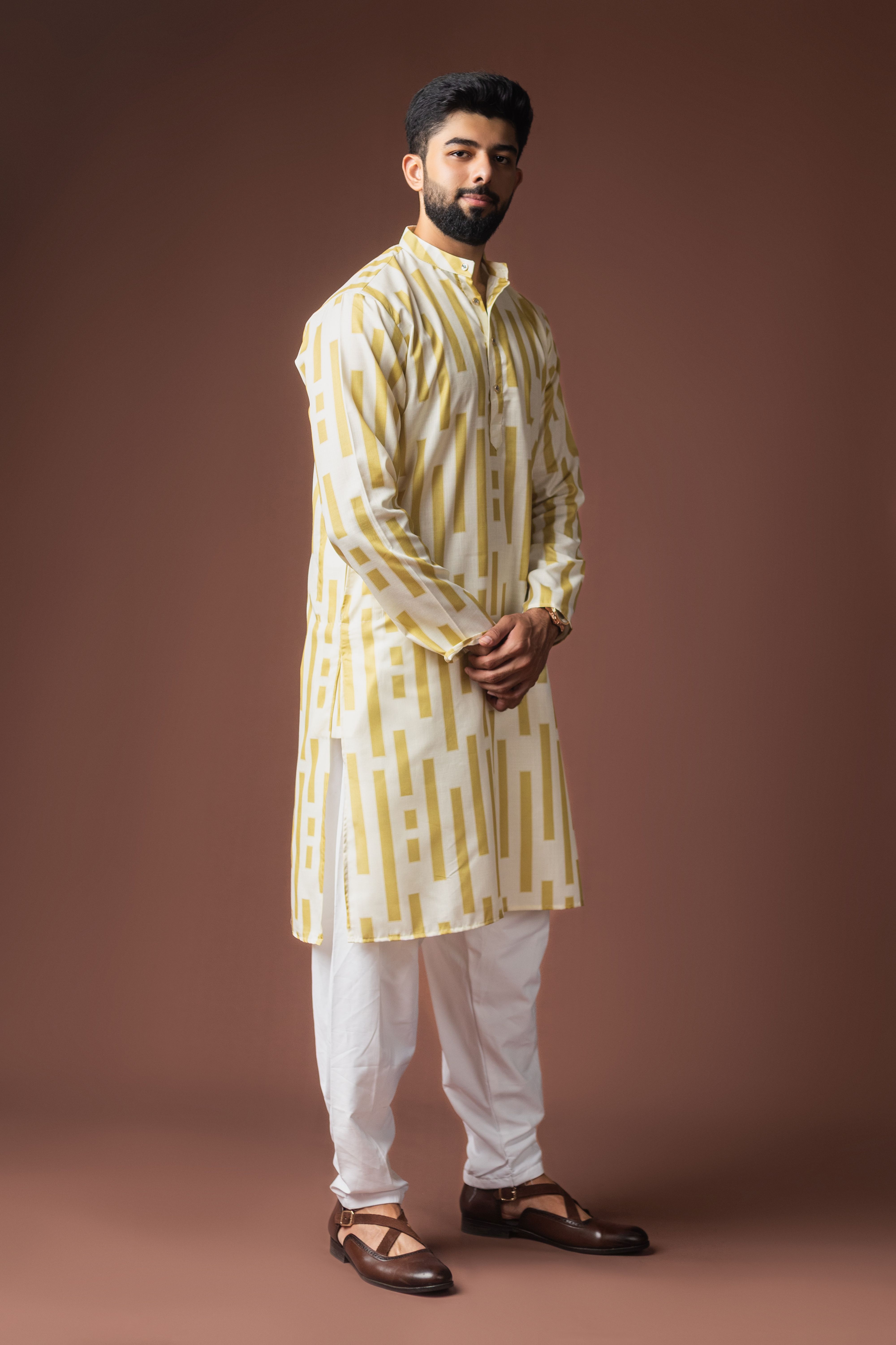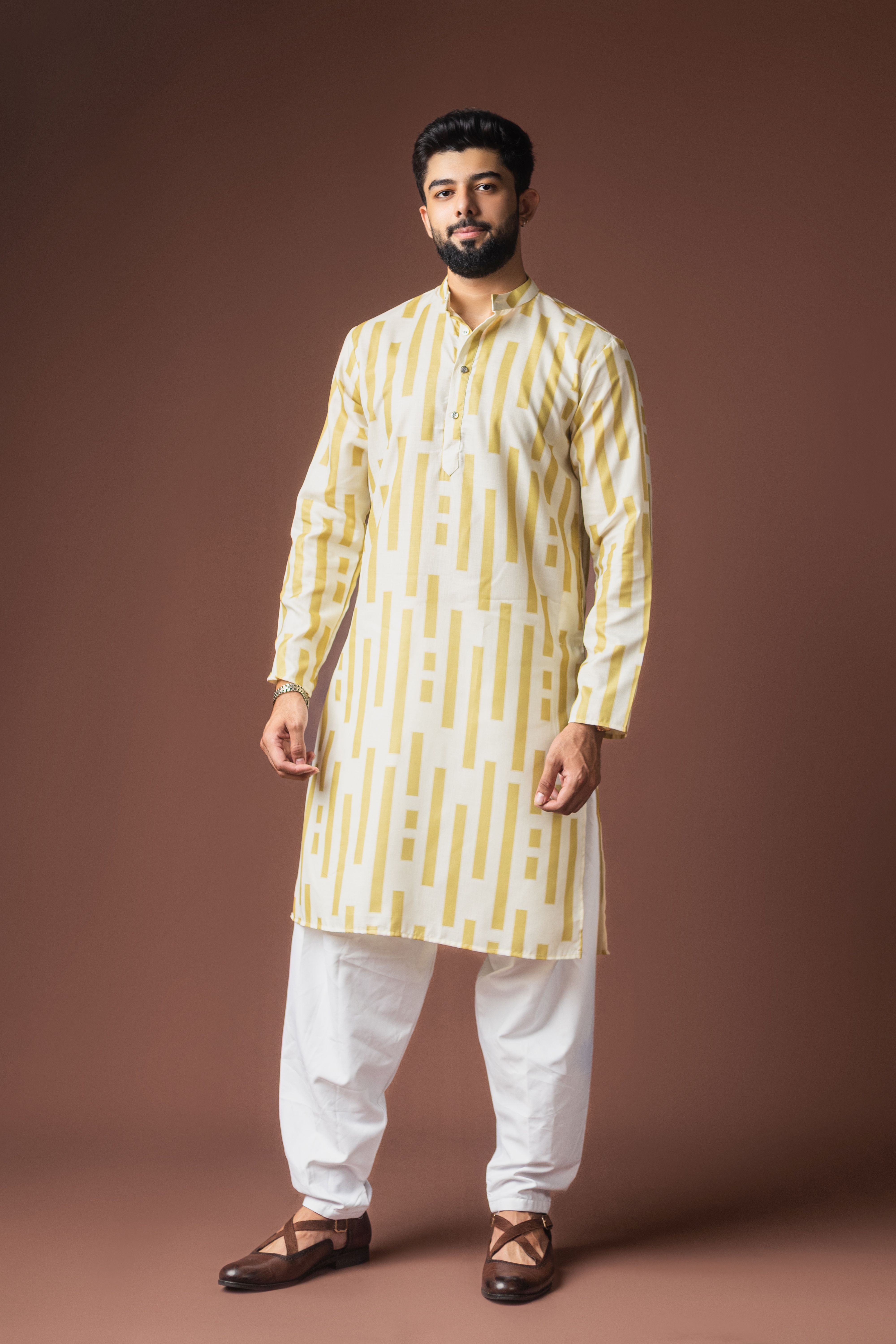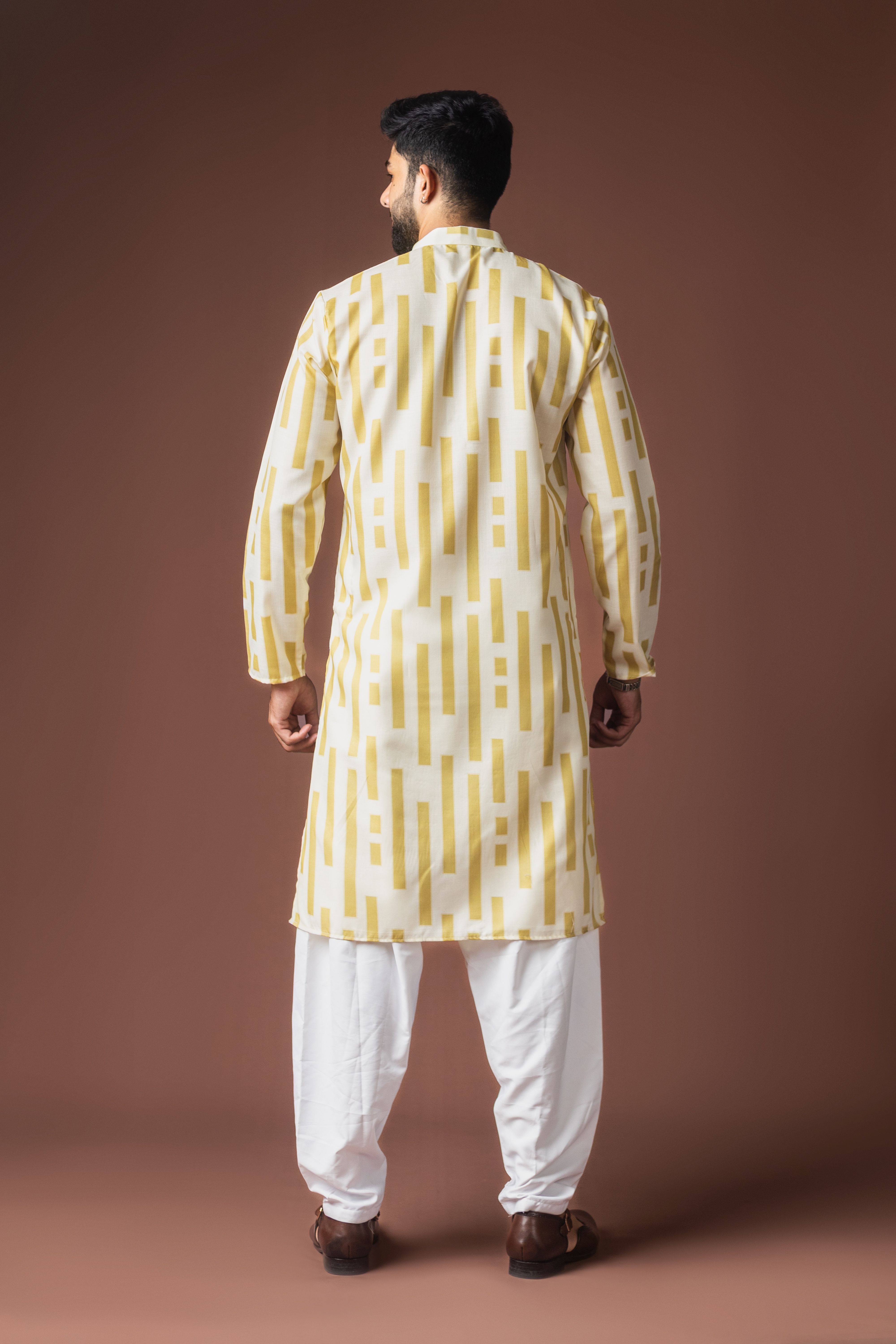 Mustard Color Blended Linen Fabric Designer Printed Festive Wear Men's Kurta Payjama