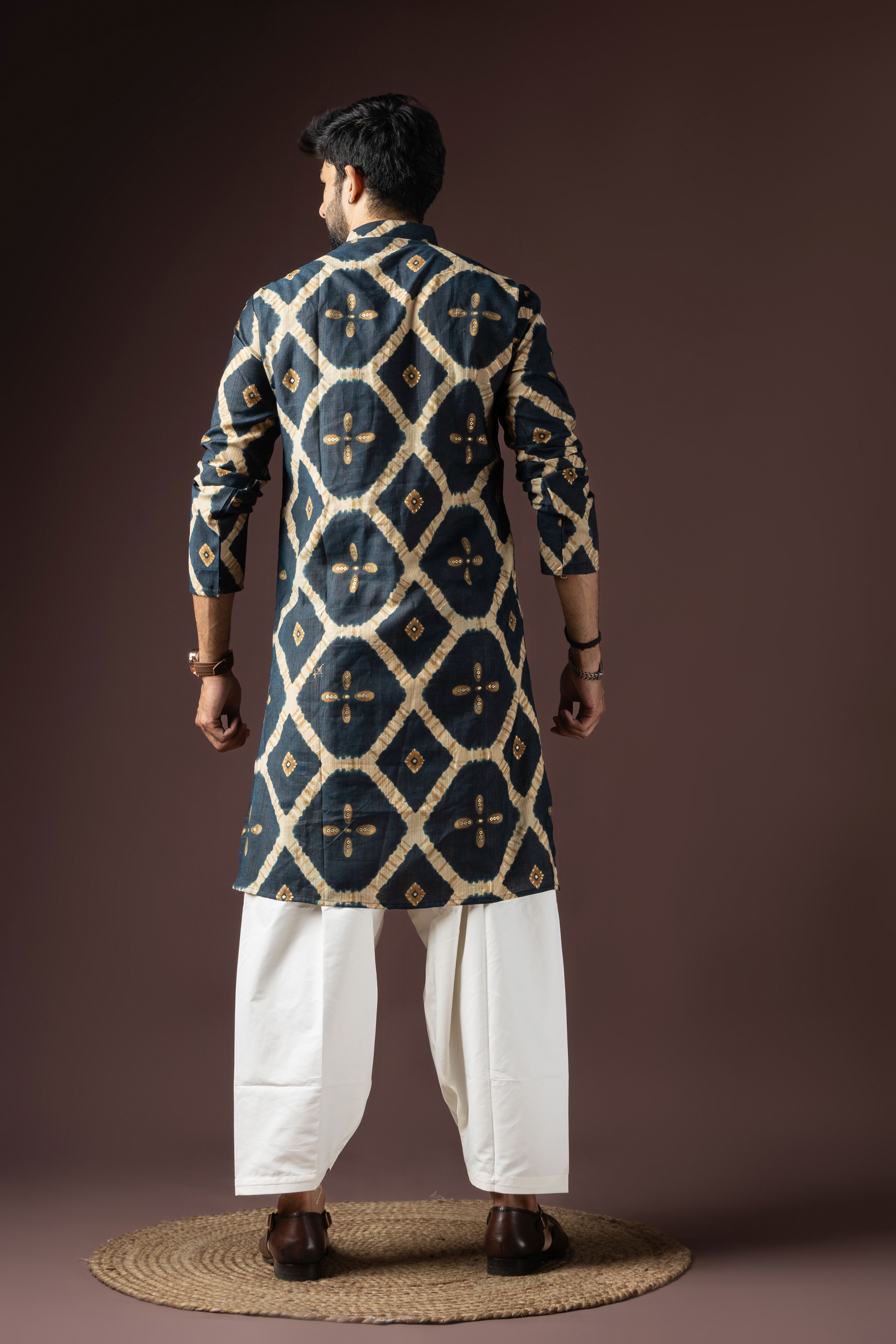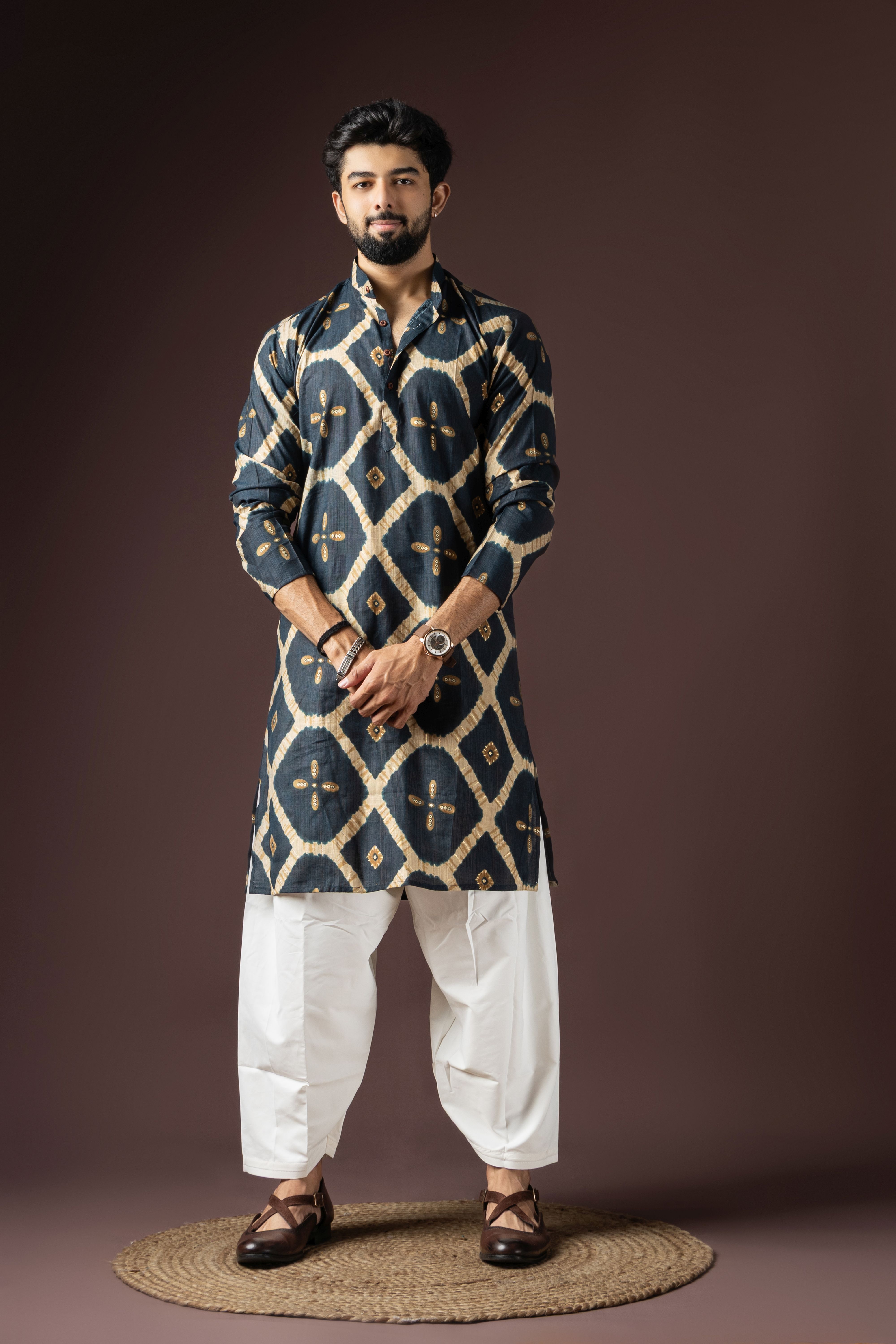 Navy Blue Color Beautiful Printed Rayon Fabric Ceremonial Men's Kurta Payjama