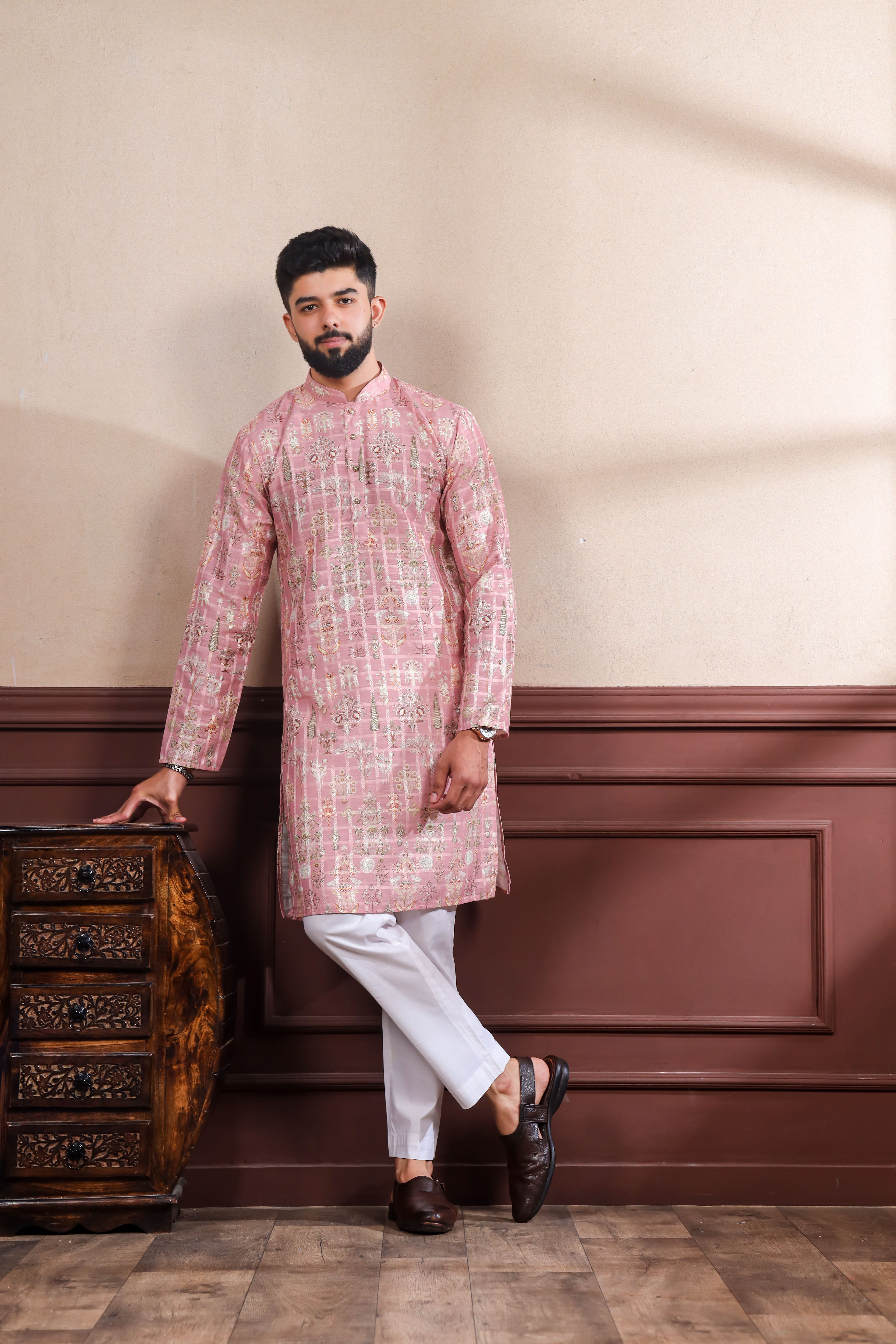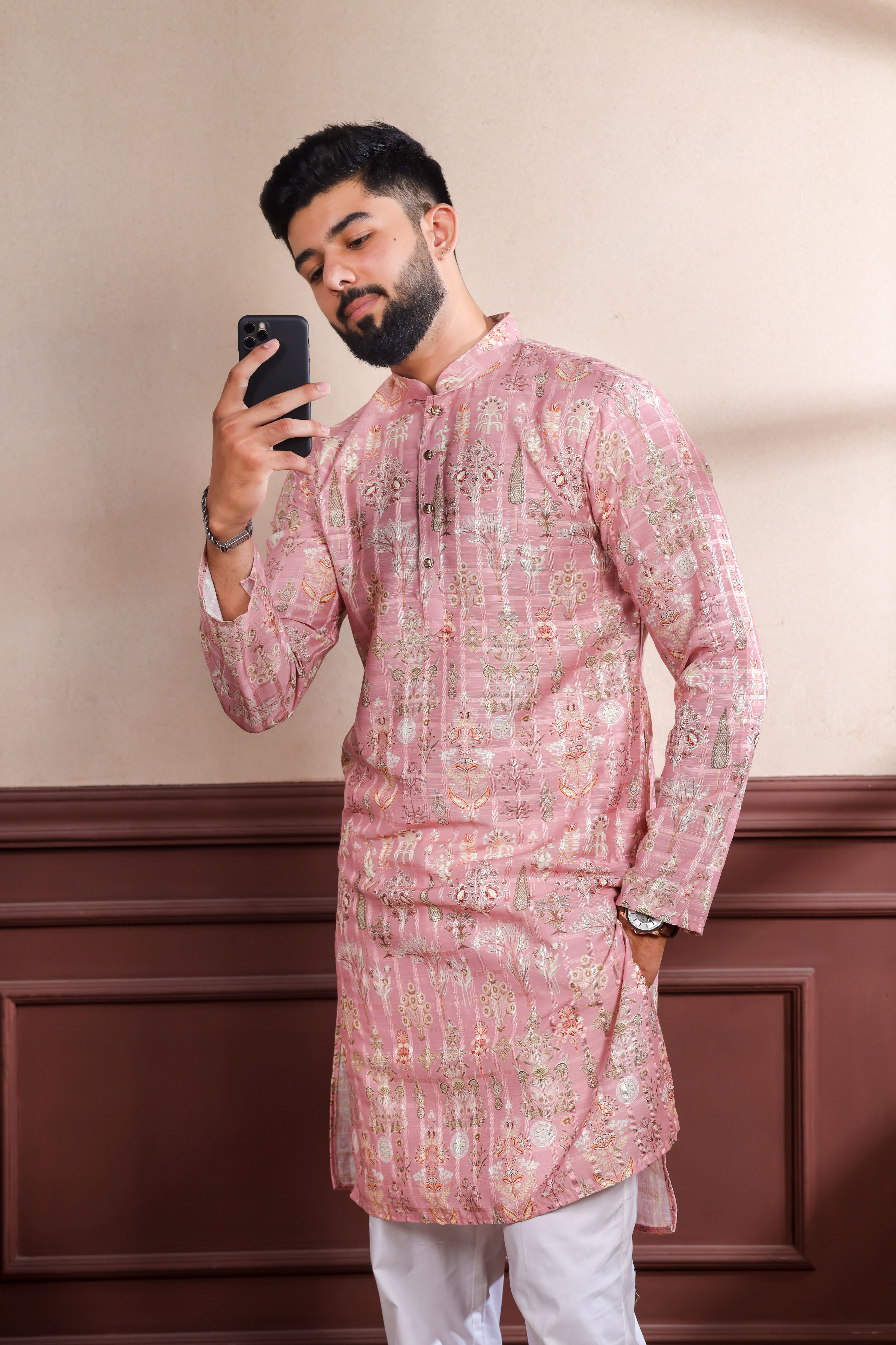Pink Color Ethnic Woven Patta With Digital Printed Ceremonial Kurta Payjama For Men's