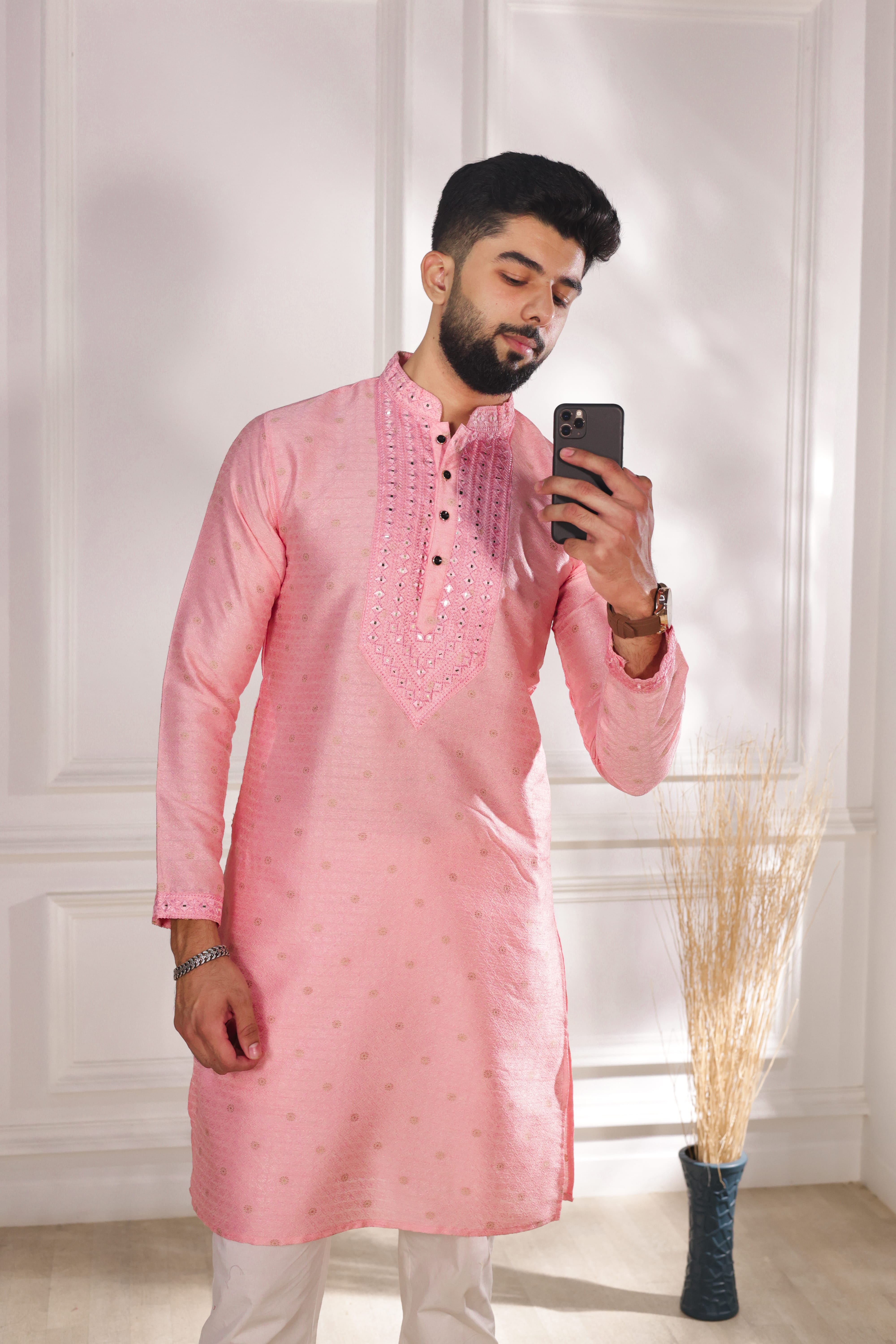 Pink Color Jacquard Silk Fabric Designer Embroidered Kurta Payjama For Men's