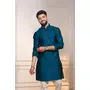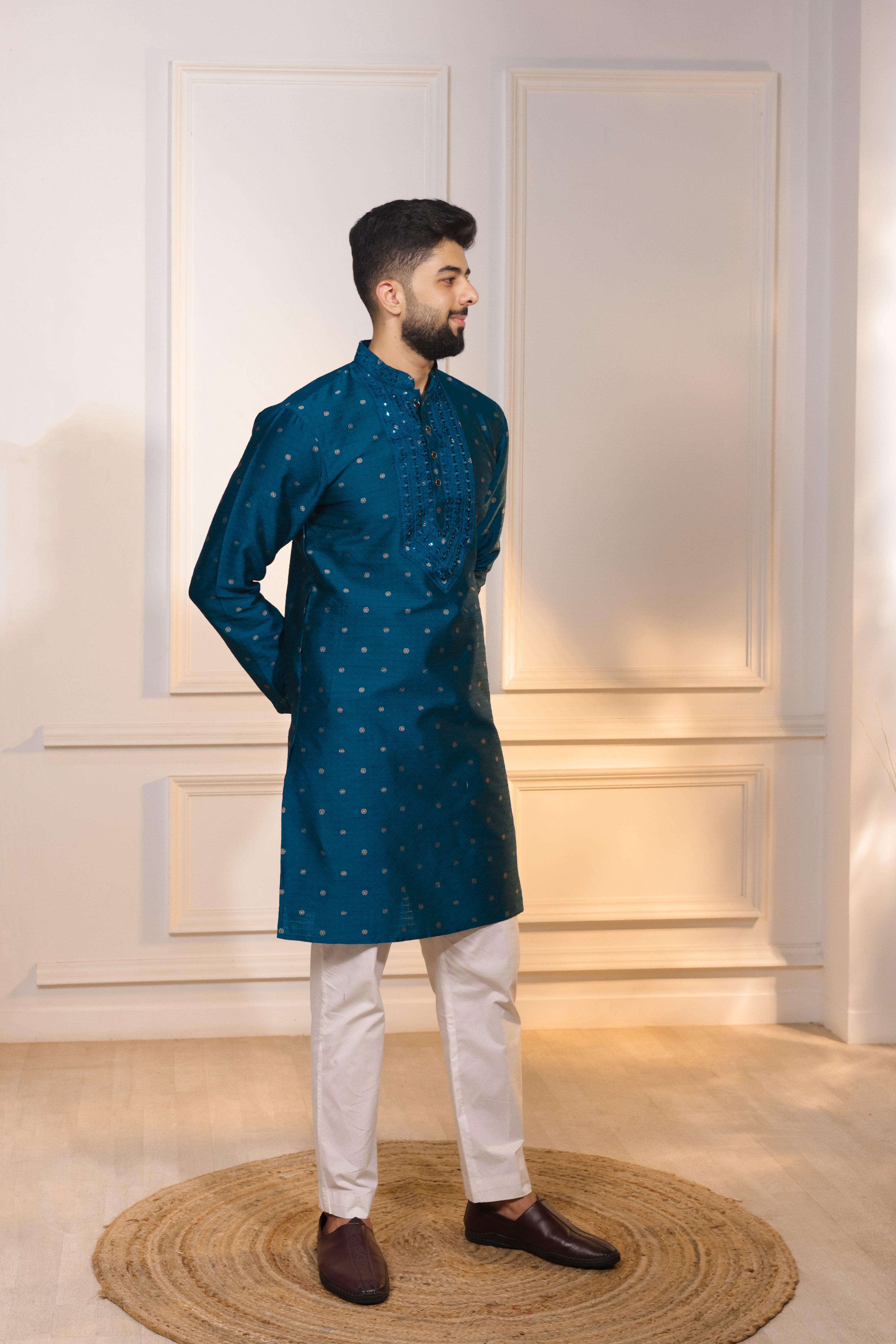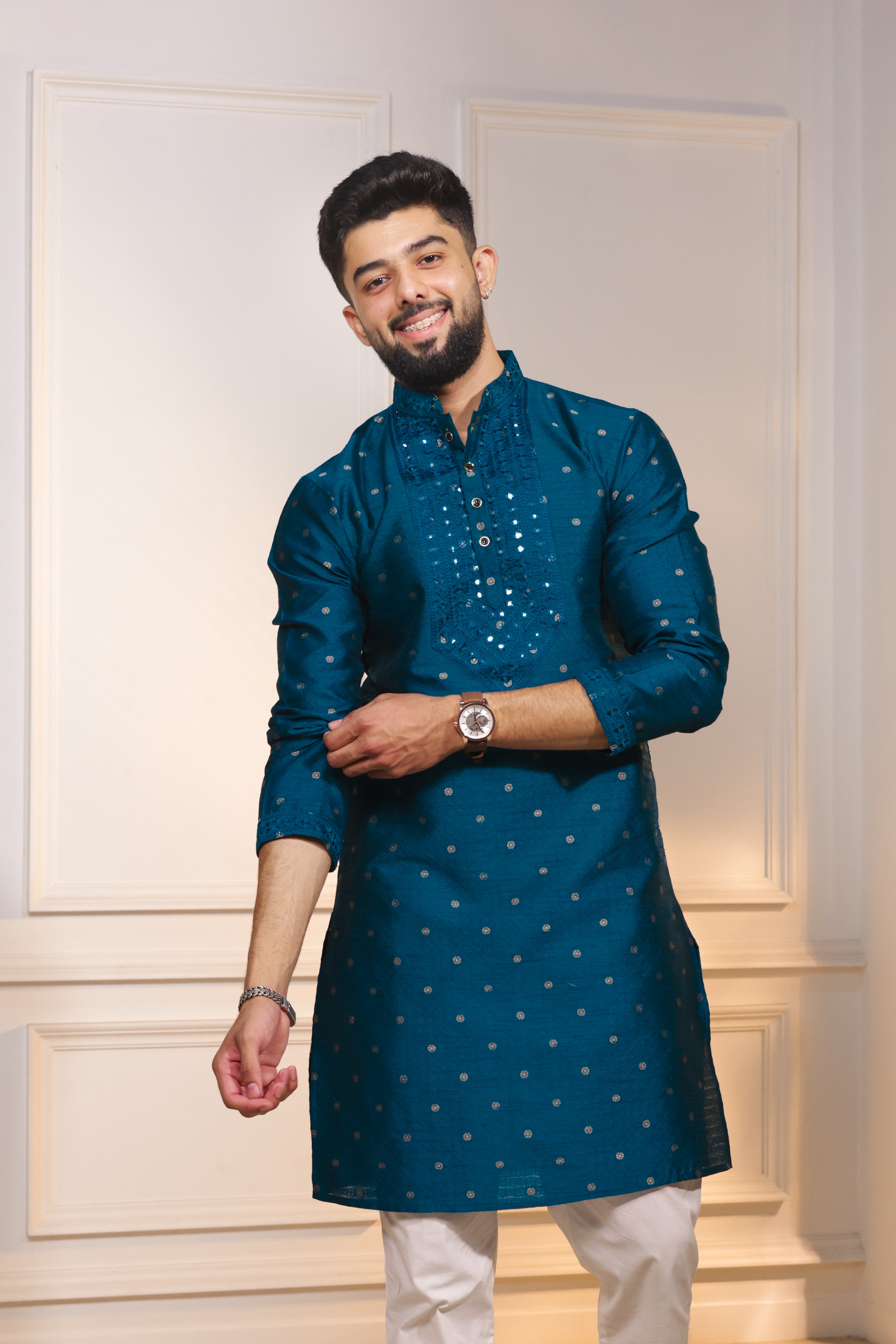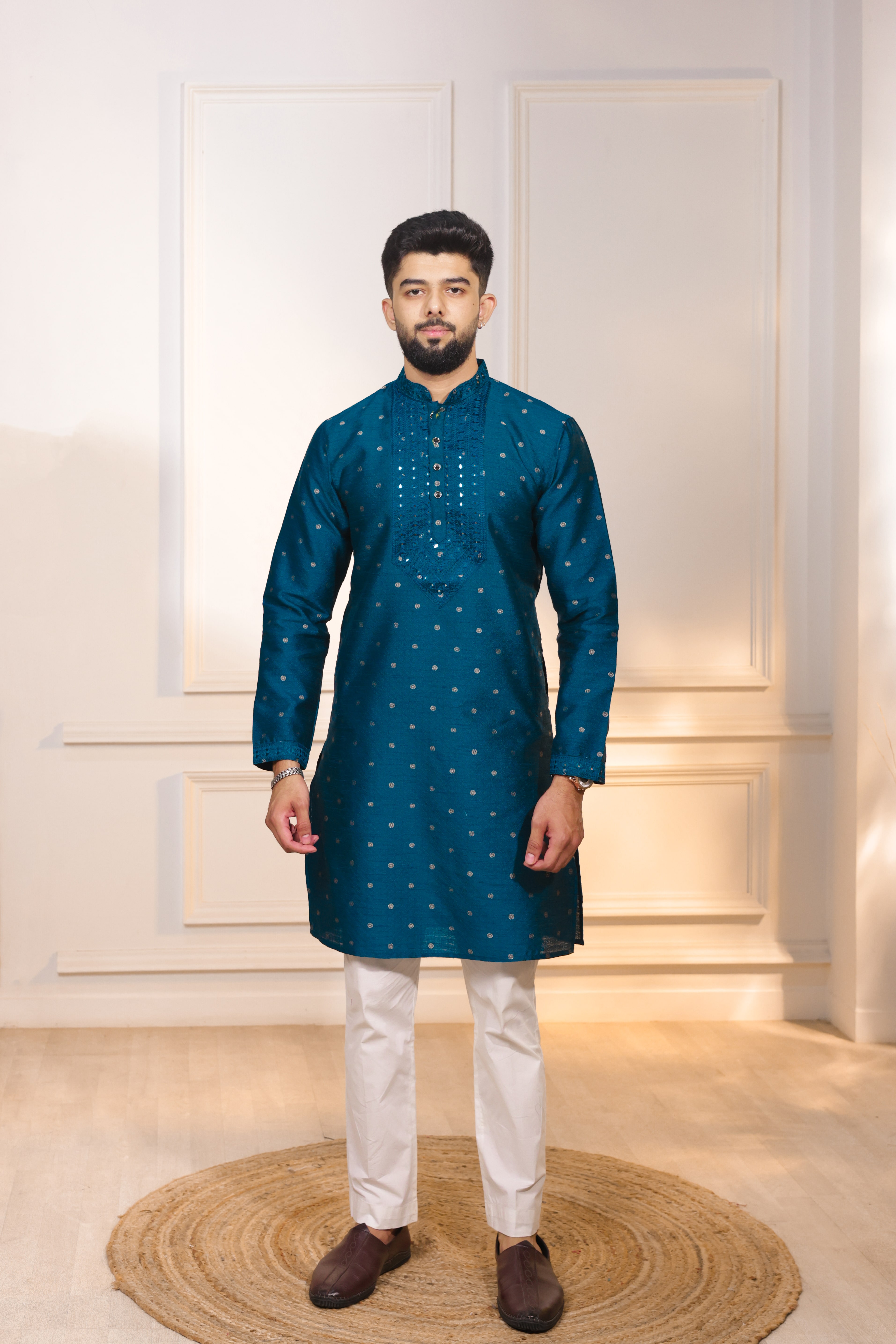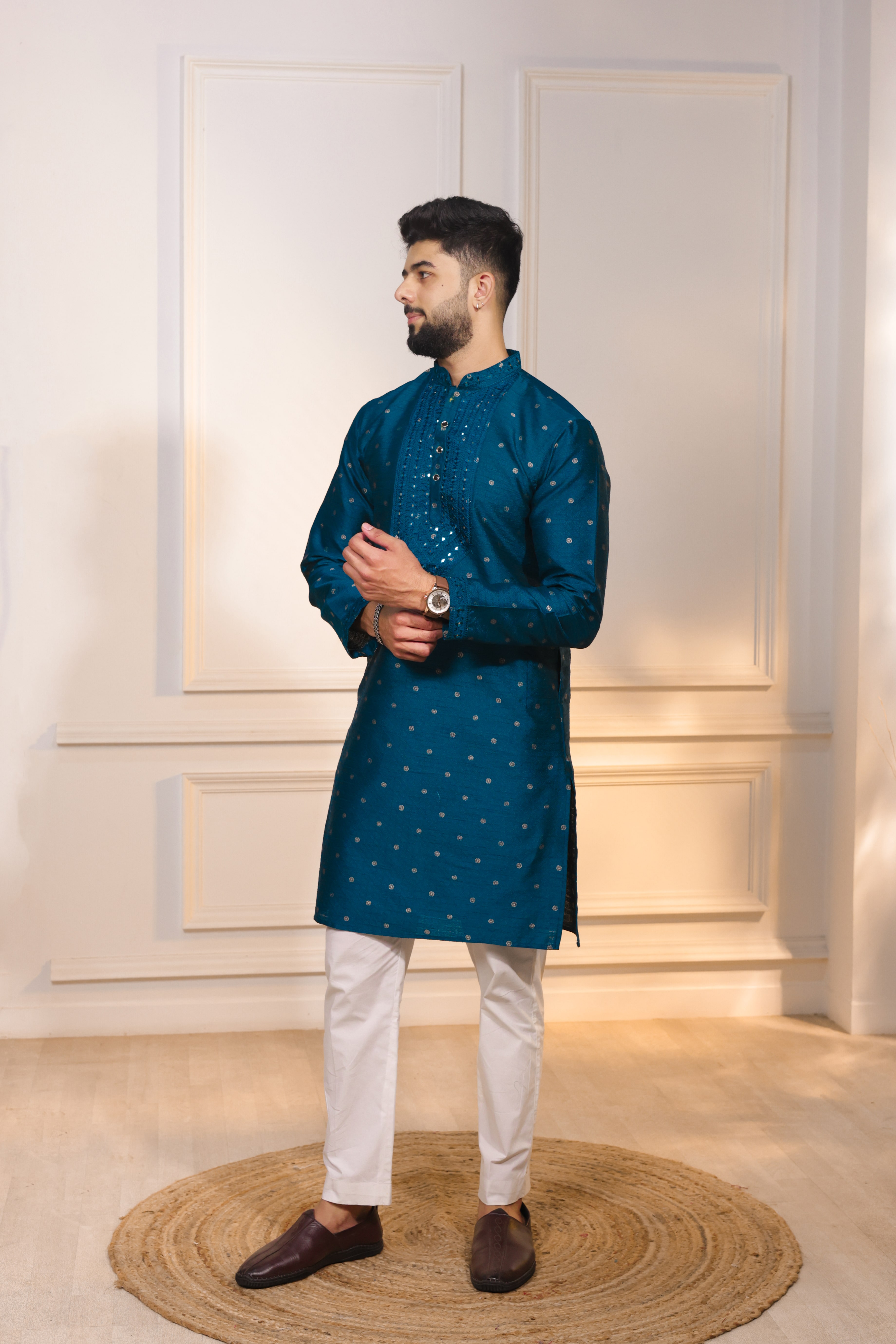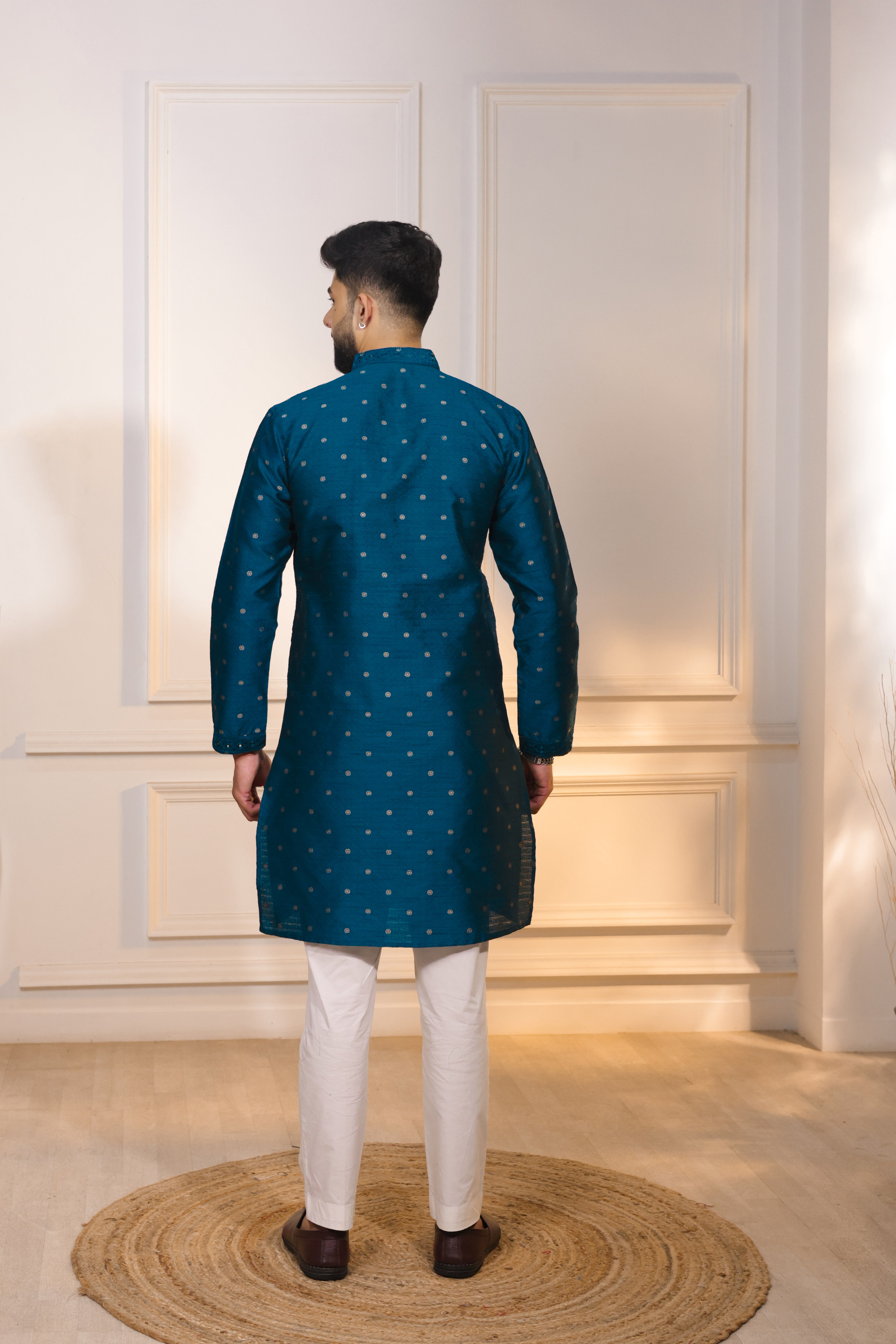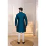 Teal Color Jacquard Silk Fabric Designer Embroidered Kurta Payjama For Men's