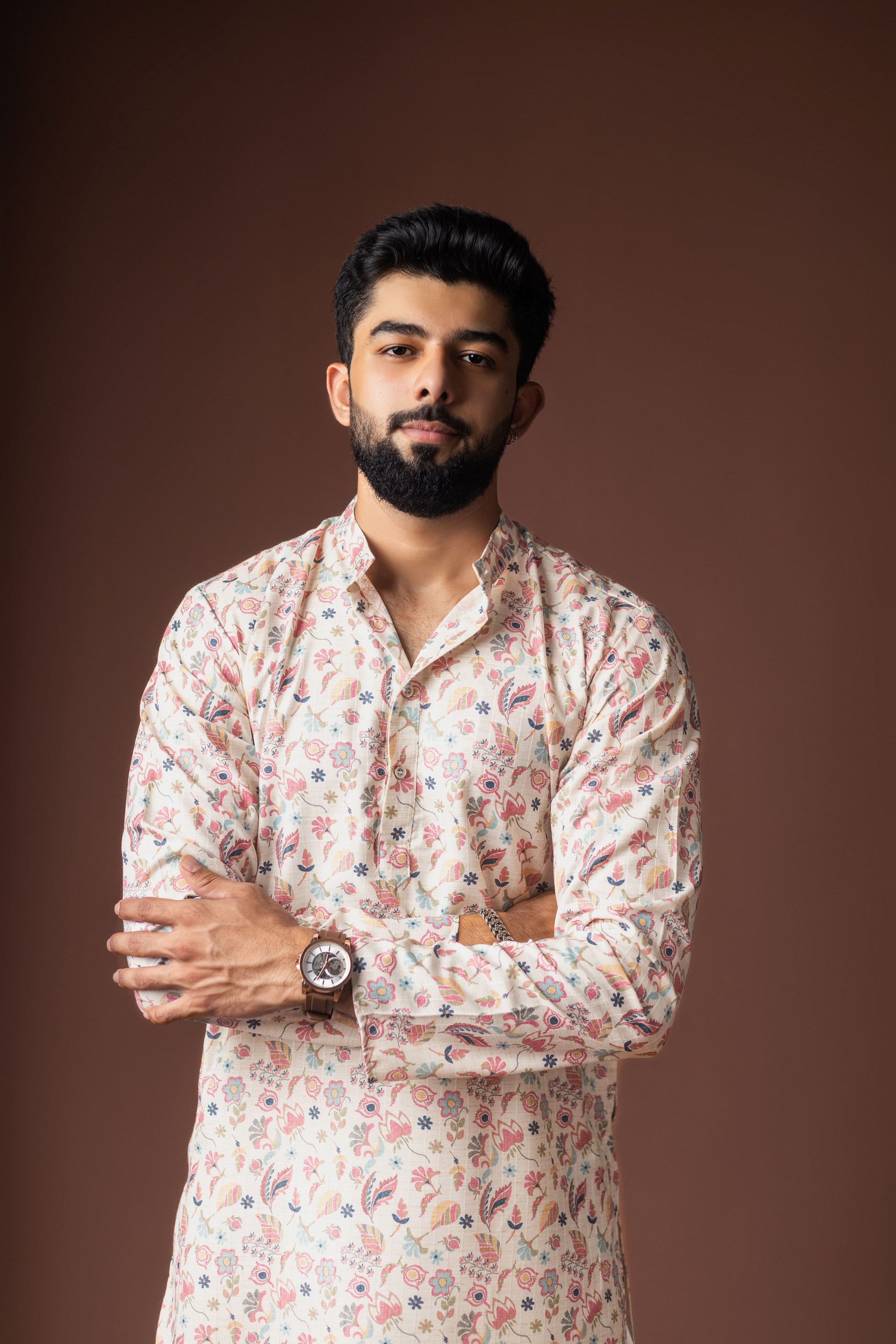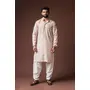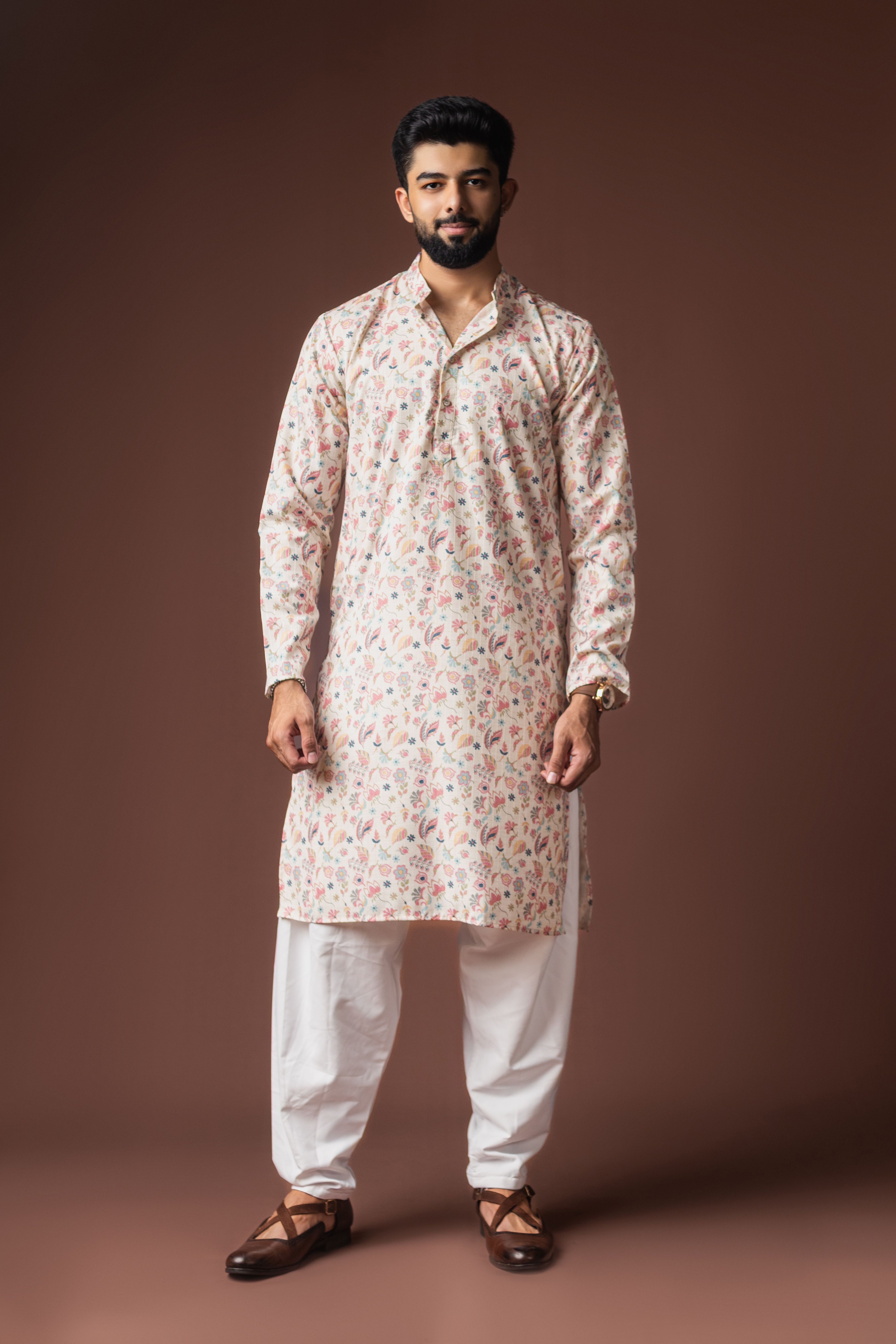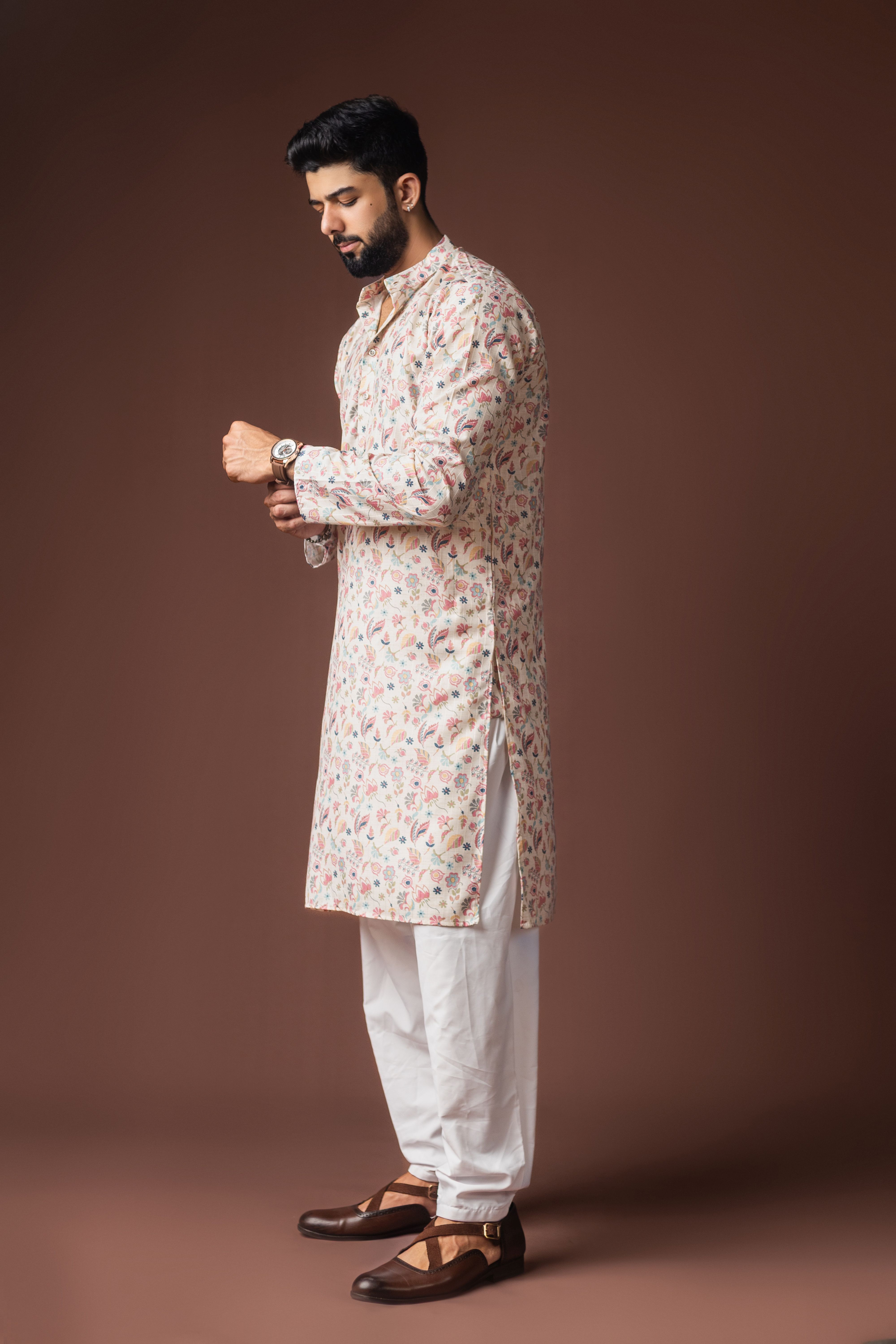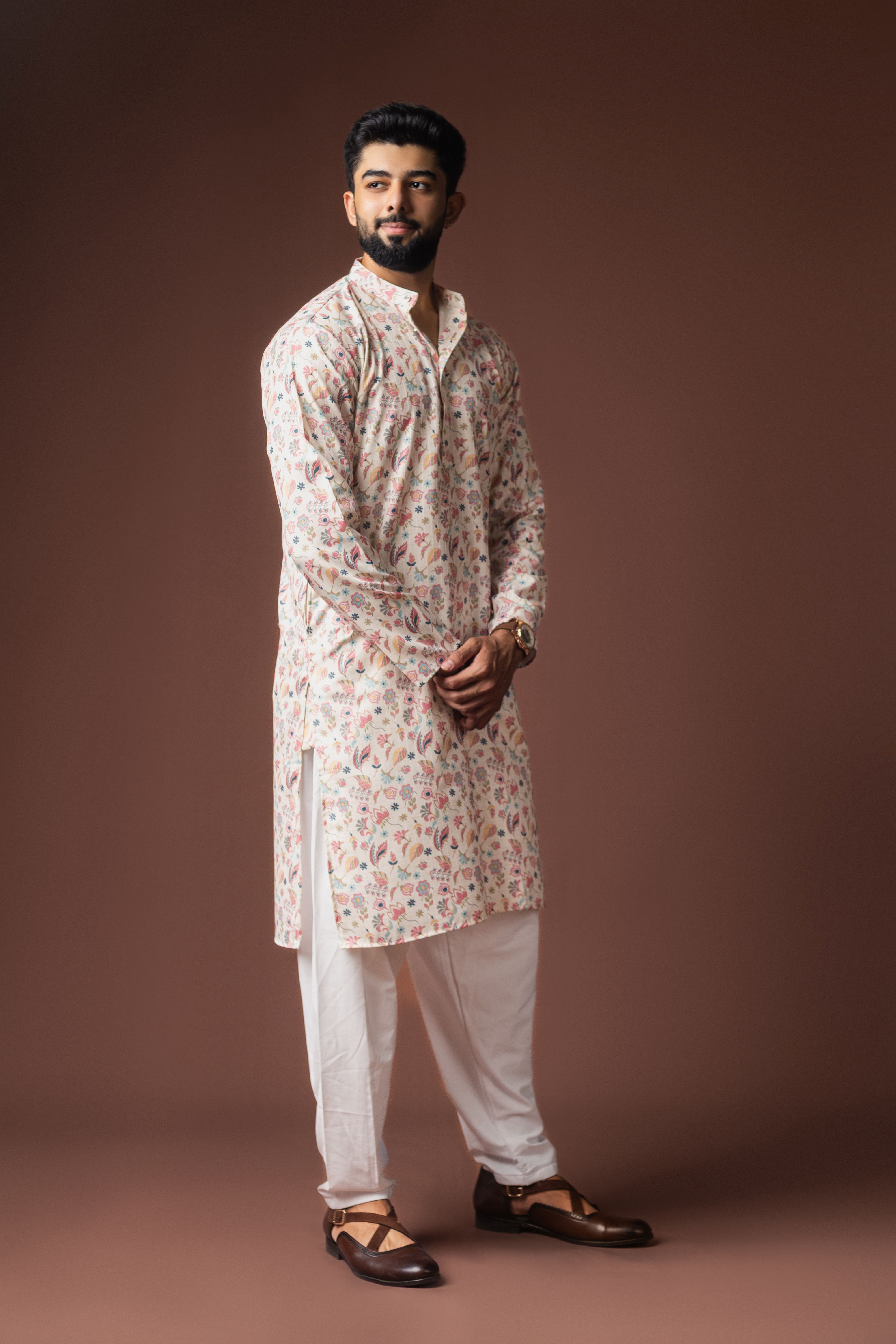 White Color Blended Linen Fabric Designer Printed Festive Wear Men's Kurta Payjama