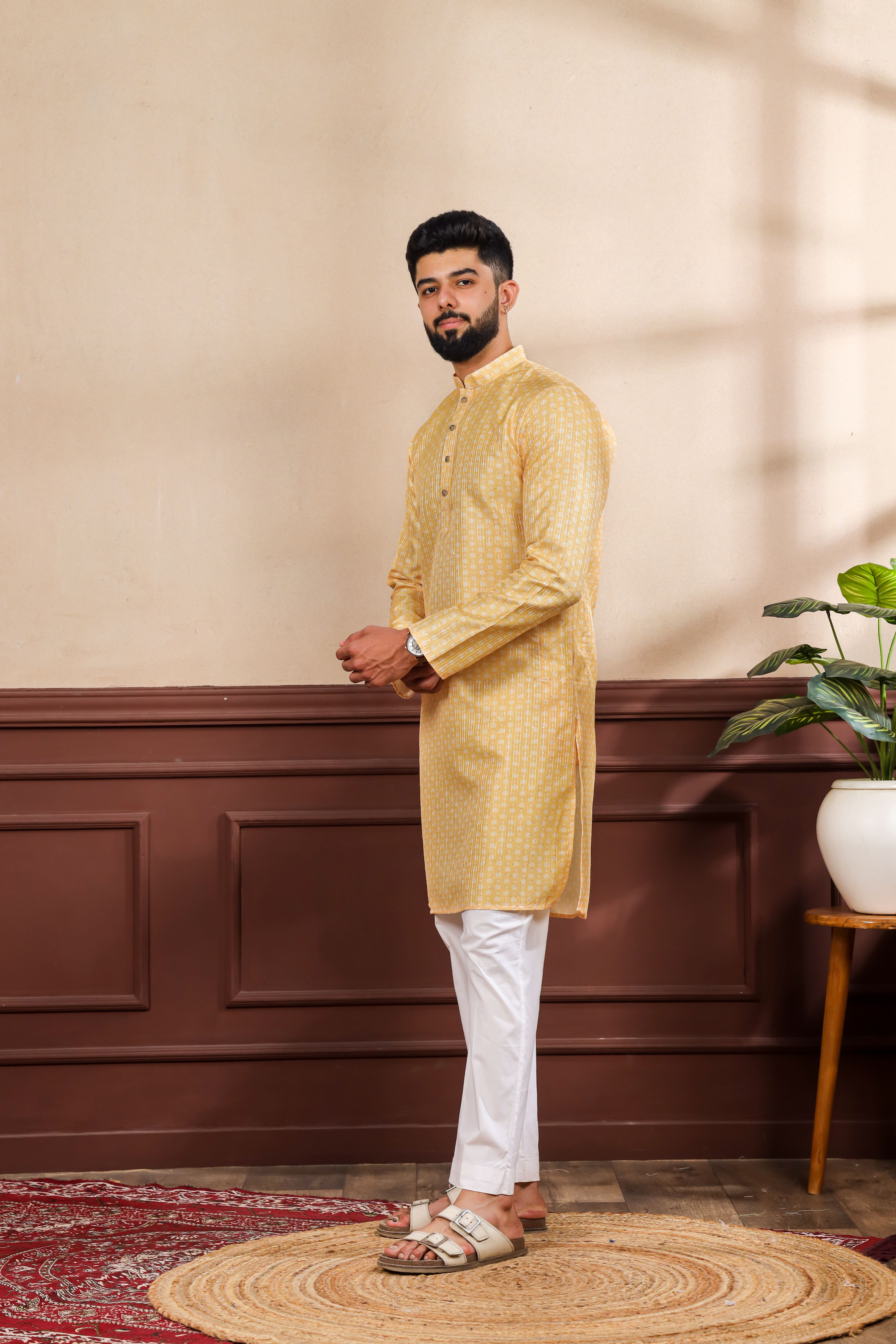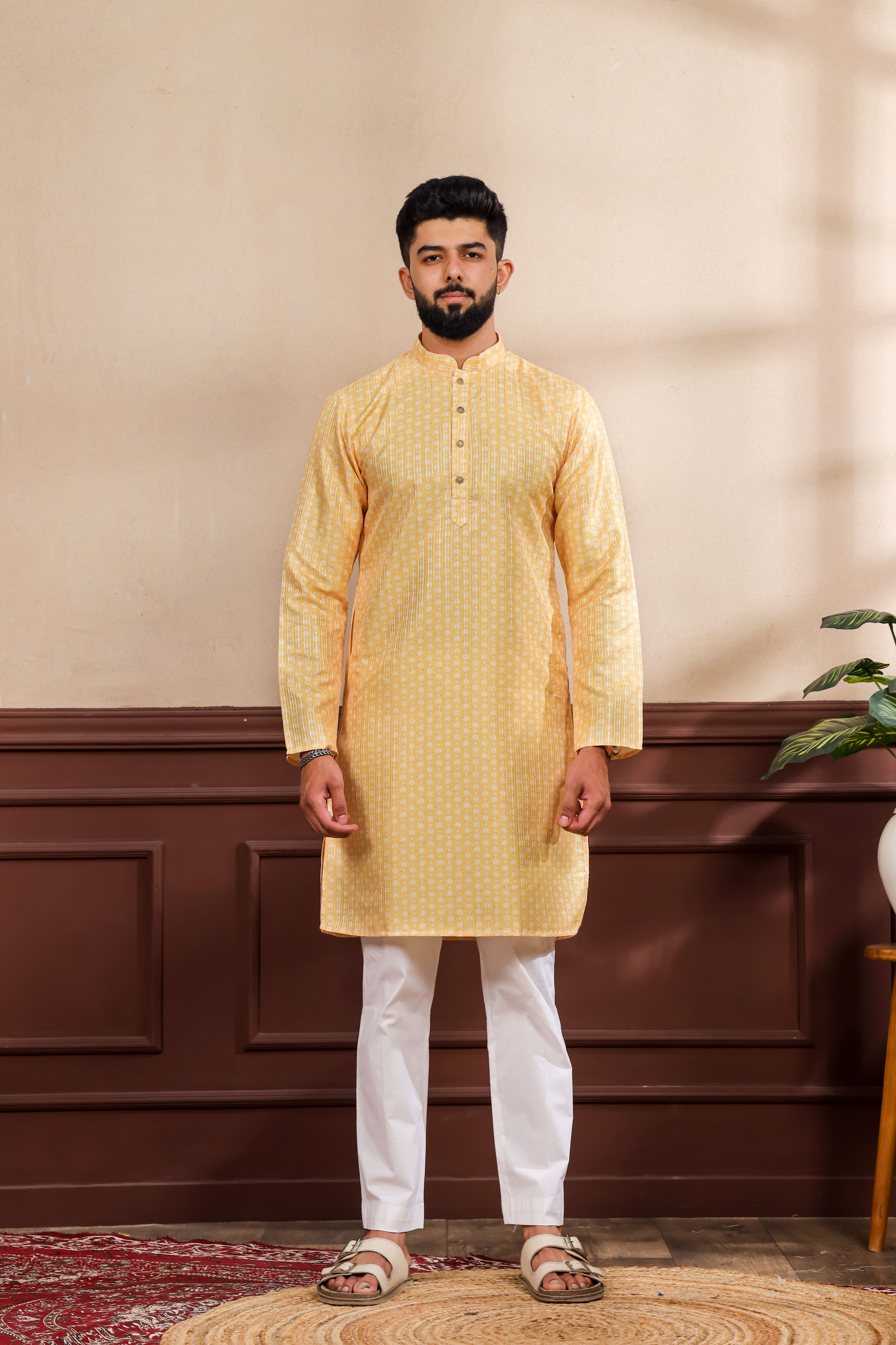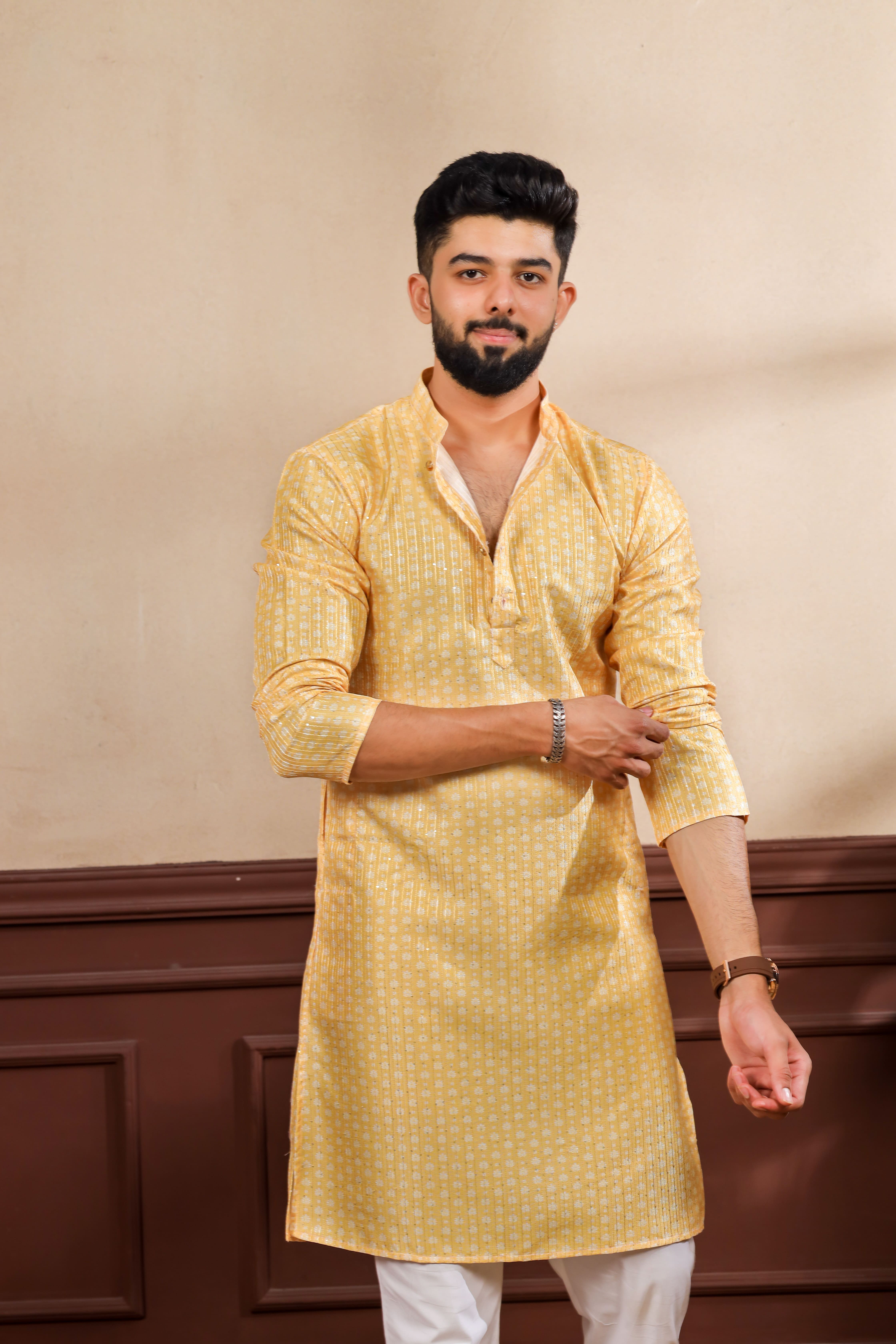 Yellow Color Beautiful Art Silk Fabric Smart Print Designer Kurta Payjama