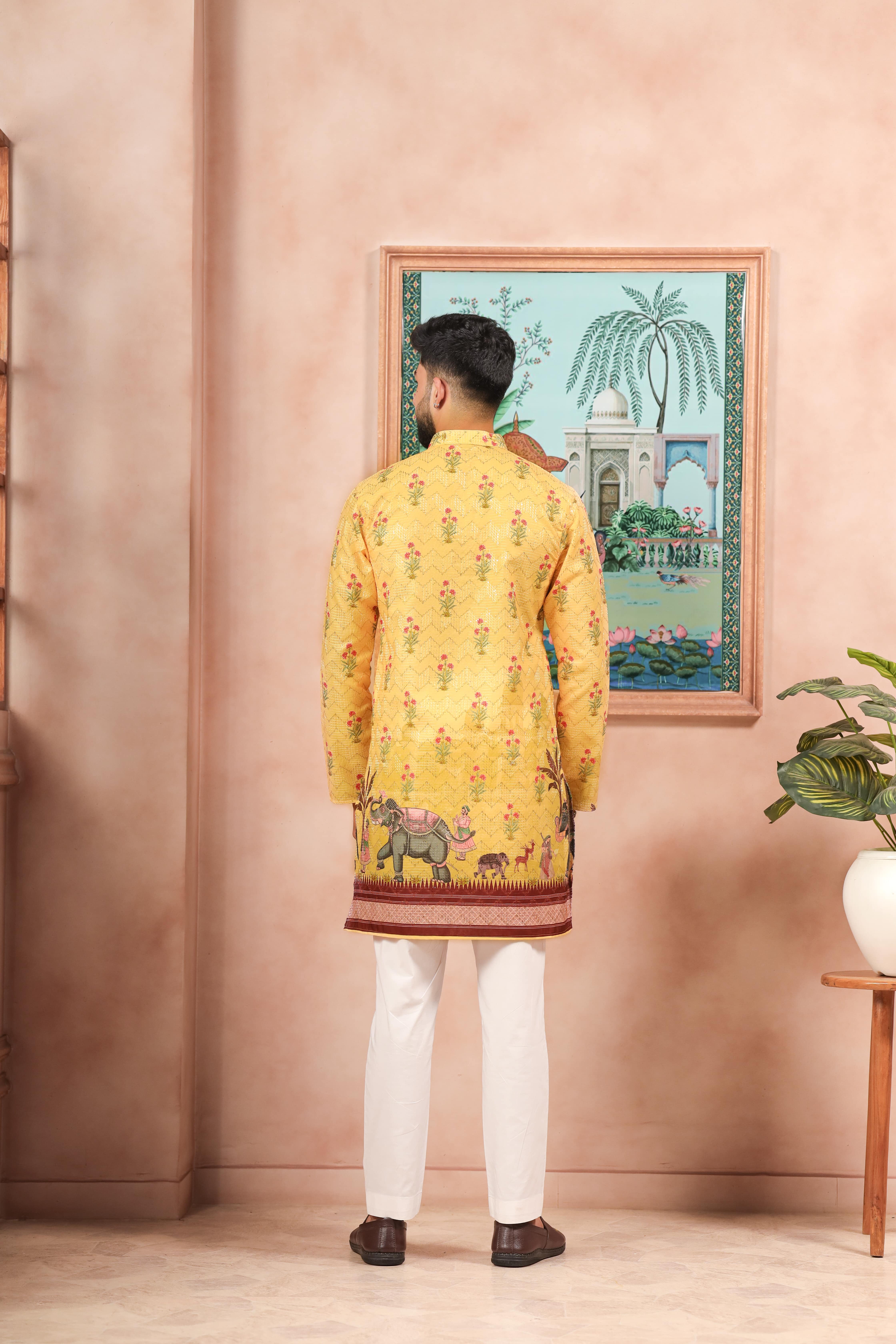 Yellow Color Beautiful Blended Cotton Fabric Ceremonial Kurta Pjyama