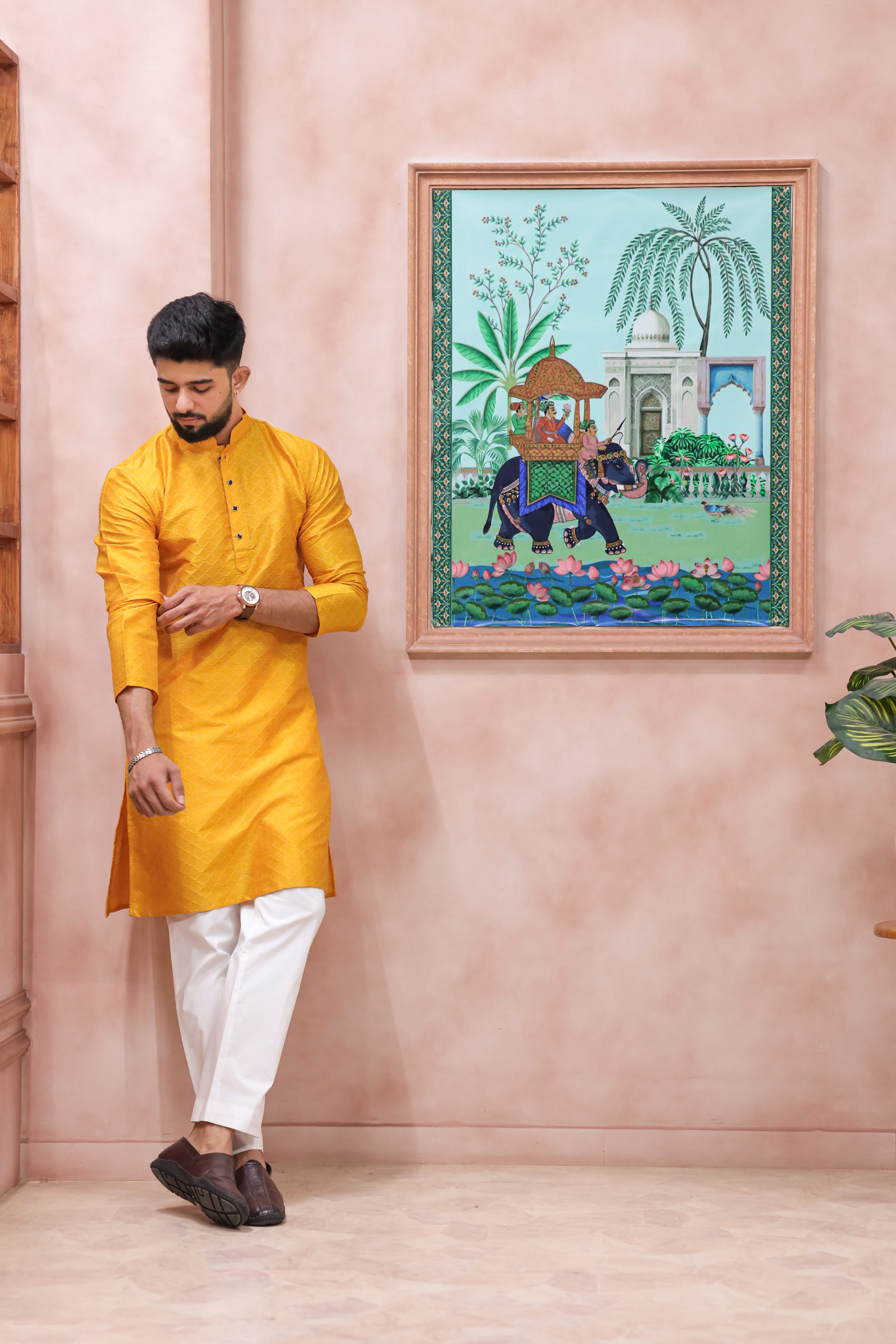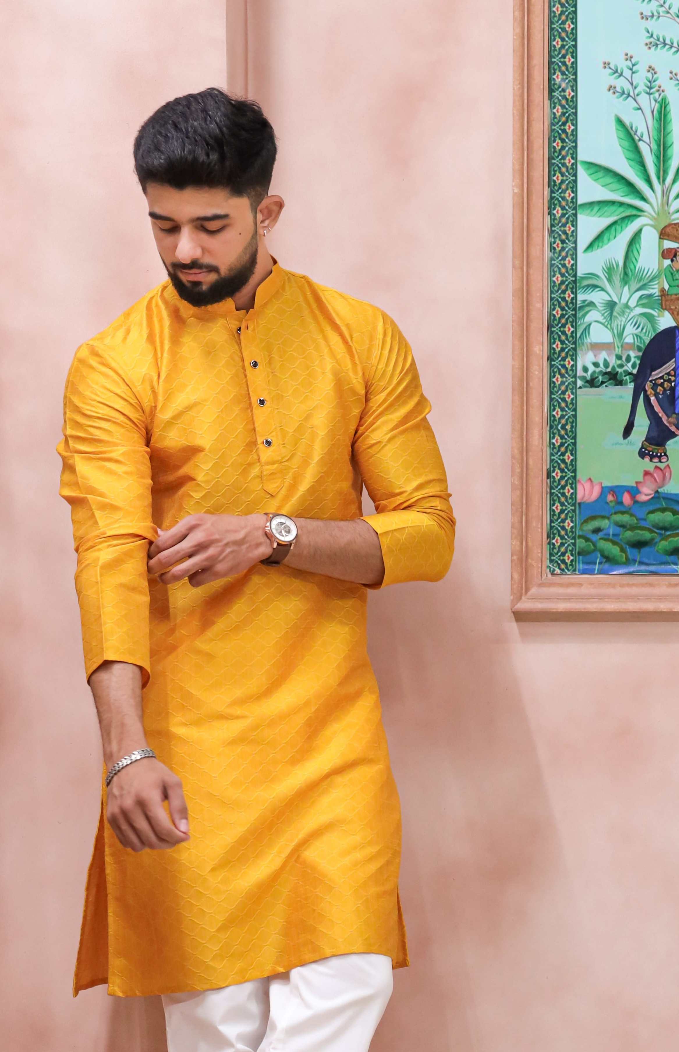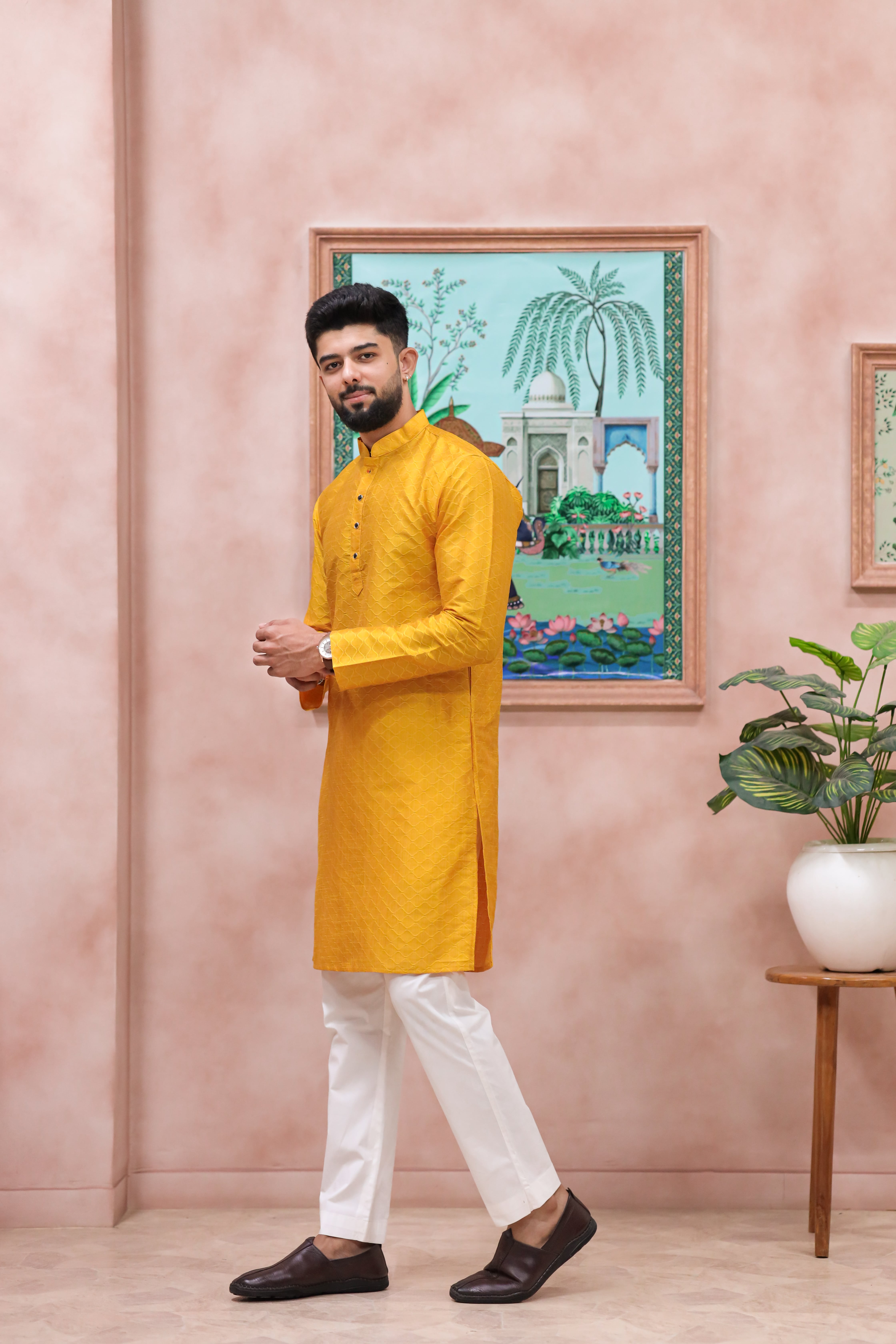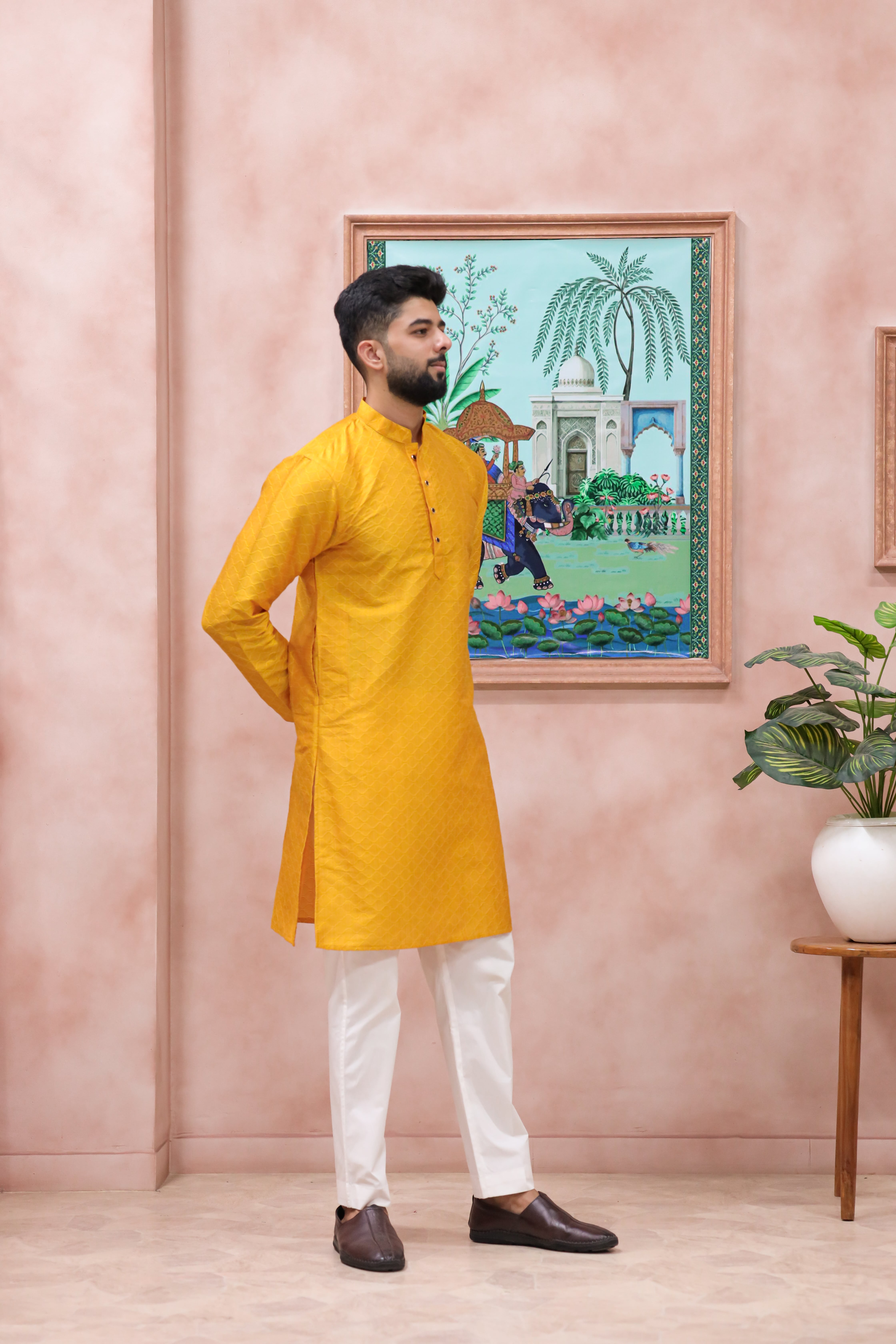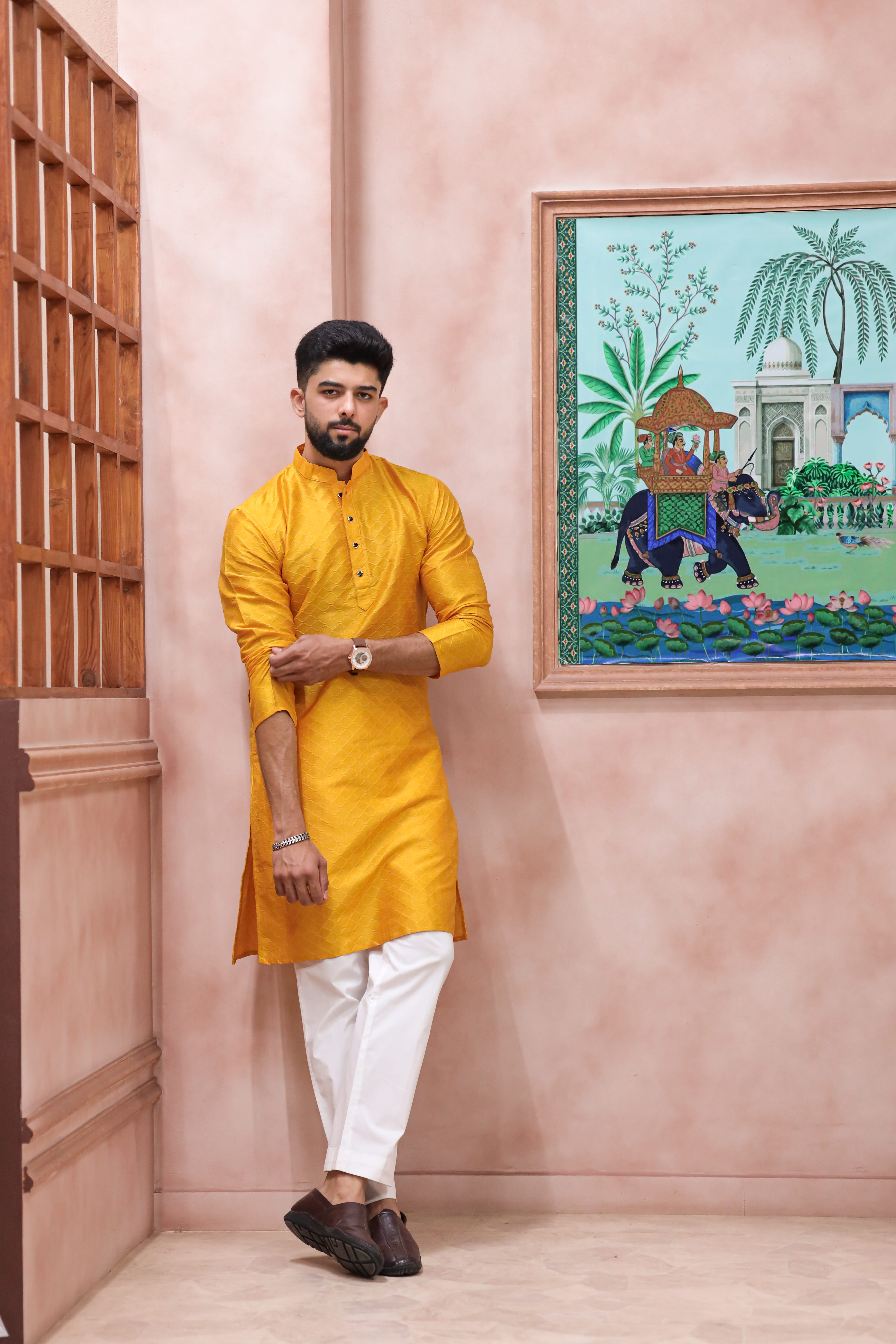Yellow Color Graceful Partywear Kurta Payjama For Mens Ceremonial Looks