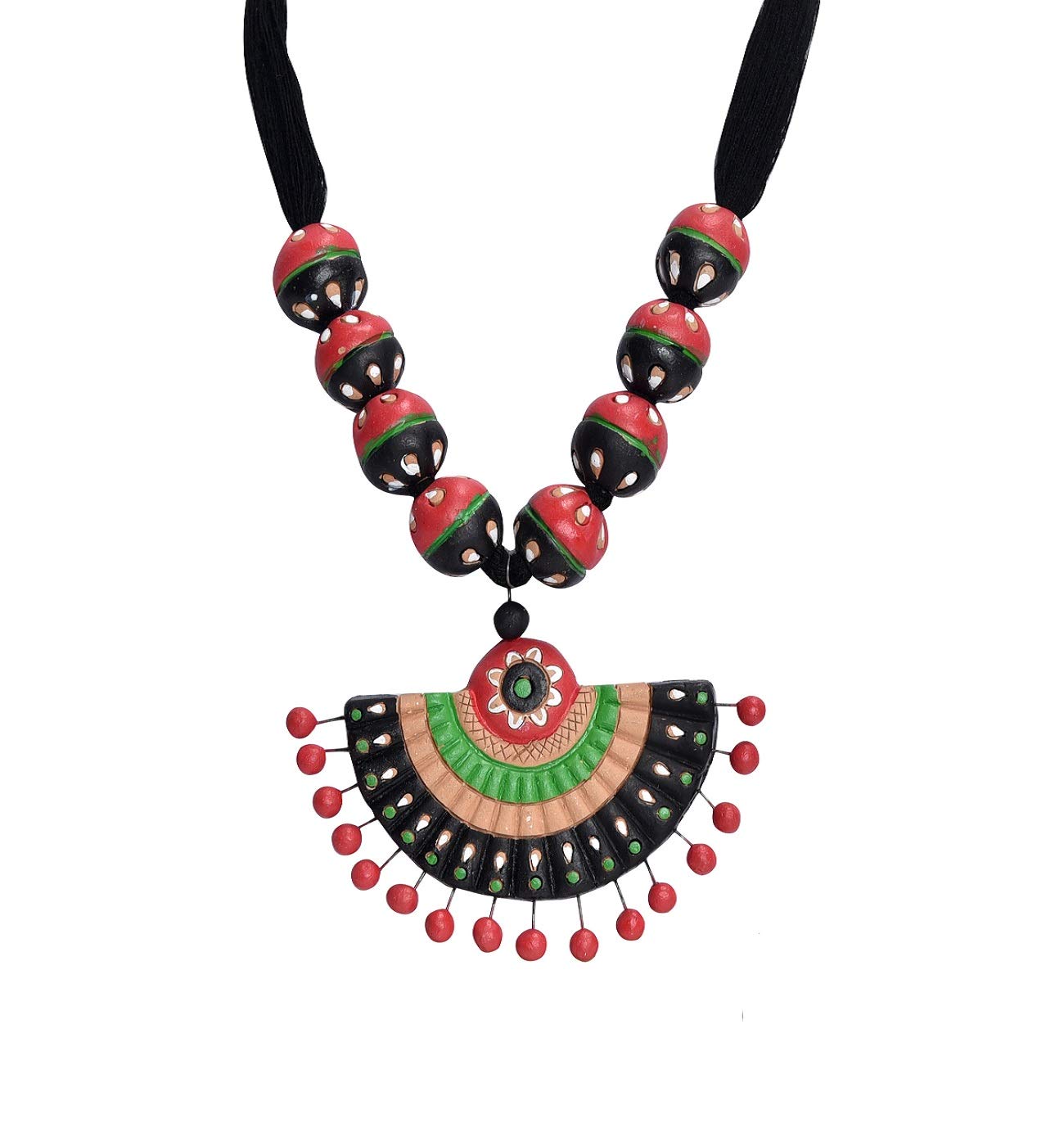 The product in display is made from terracotta material and is finished in an attractive black color. Furthermore this product features a strand shape and a design that renders it with the versatility to be worn as a festive occasion wear.