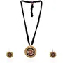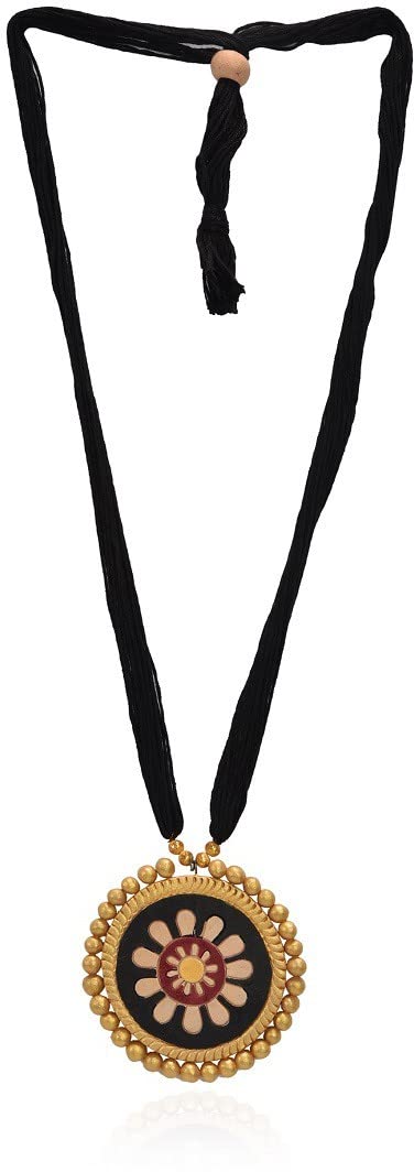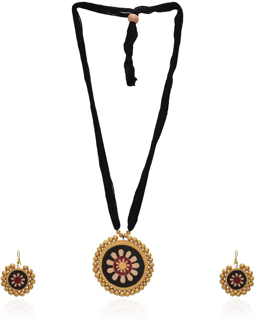 The product in display is made from terracotta material and is finished in an attractive black color. Furthermore this product features a strand shape and a design that renders it with the versatility to be worn as a festive occasion wear.
