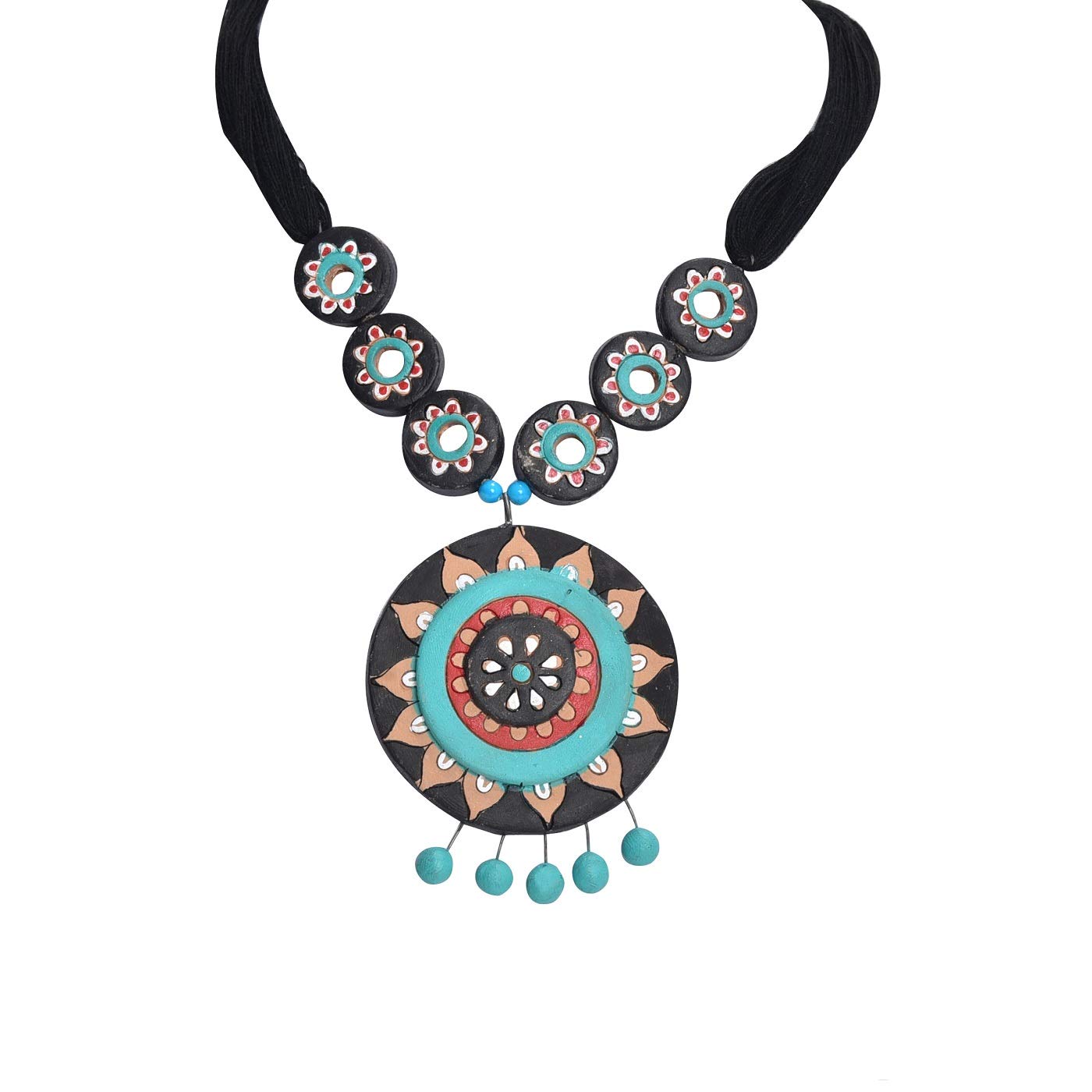 The product in display is made from terracotta material and is finished in an attractive black color. Furthermore this product features a strand shape and a design that renders it with the versatility to be worn as a festive occasion wear.
