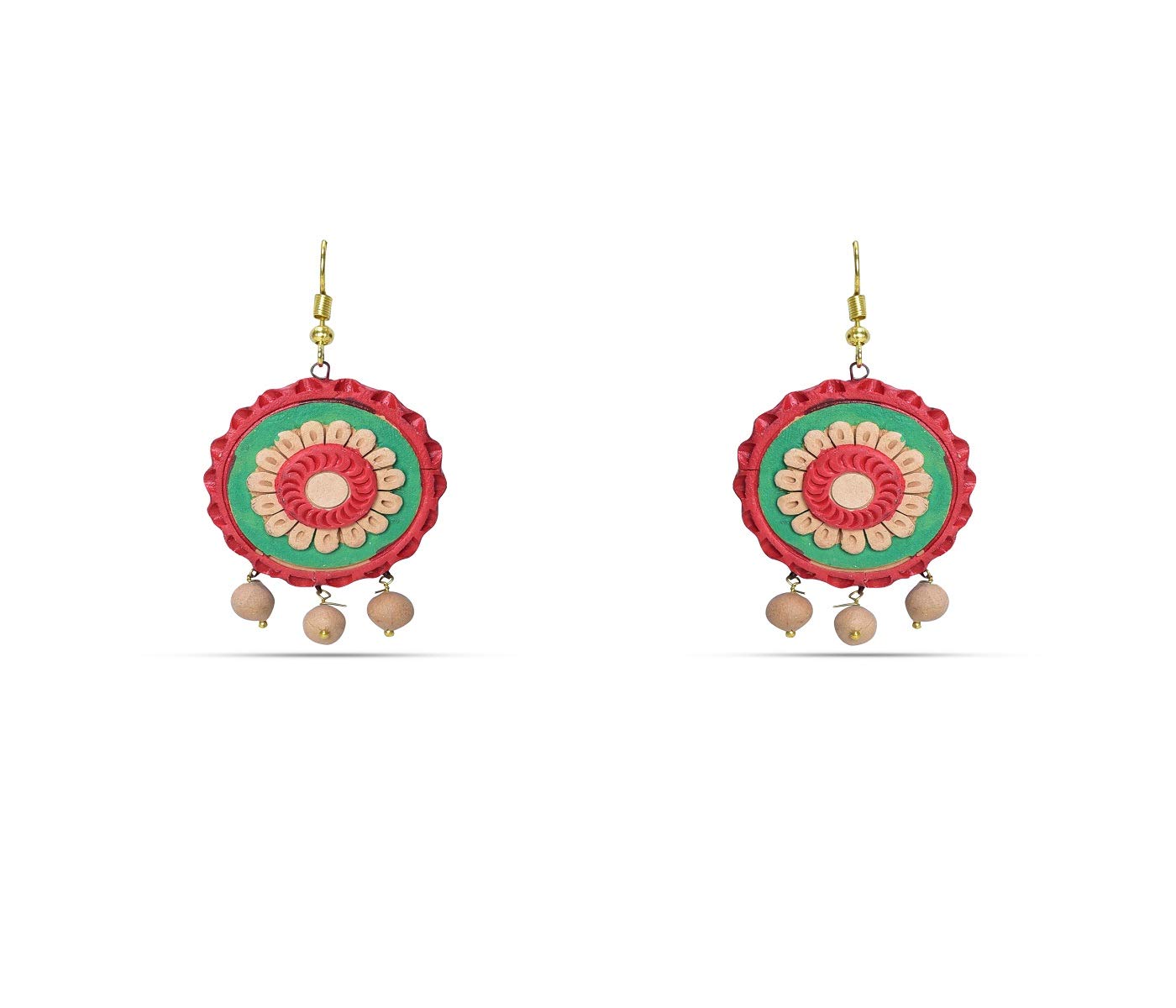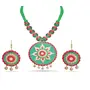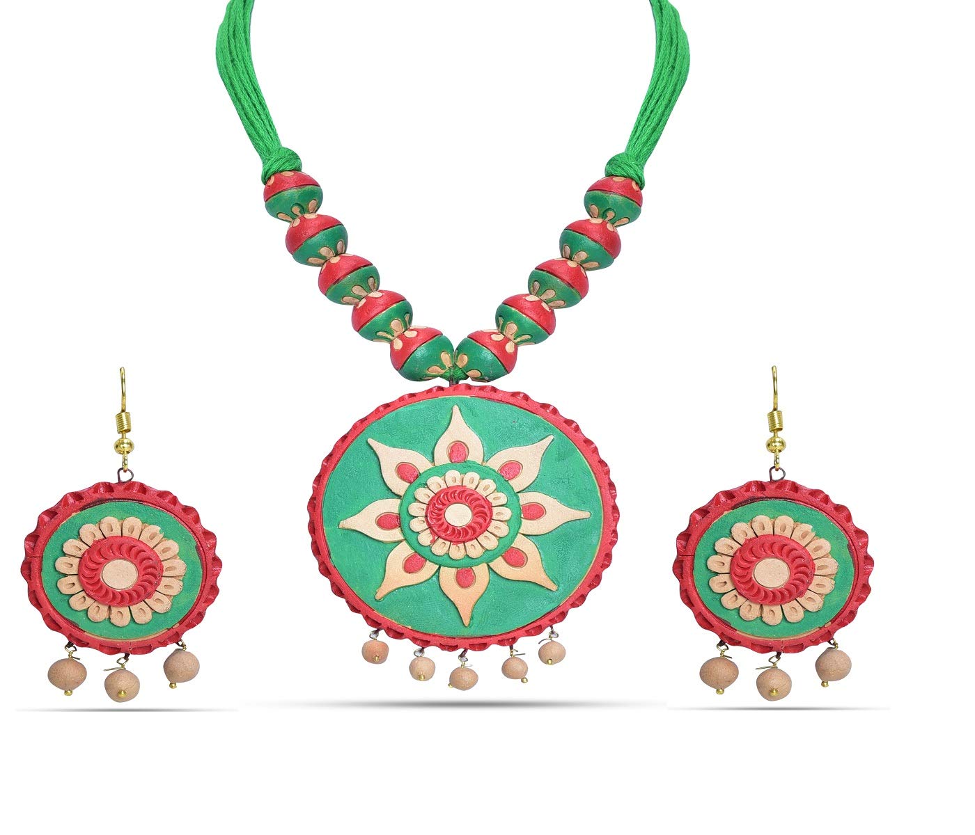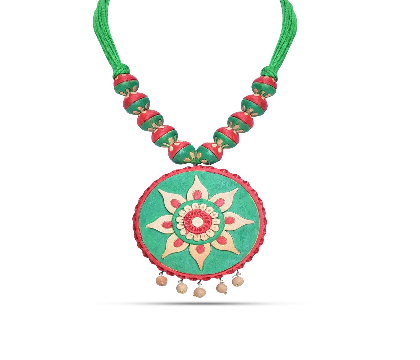 The product in display is made from terracotta material and is finished in an attractive green color. Furthermore this product features a strand shape and a design that renders it with the versatility to be worn as a festive occasion wear.