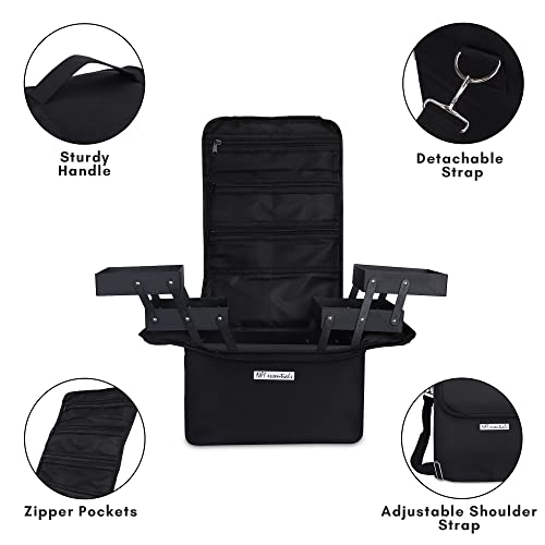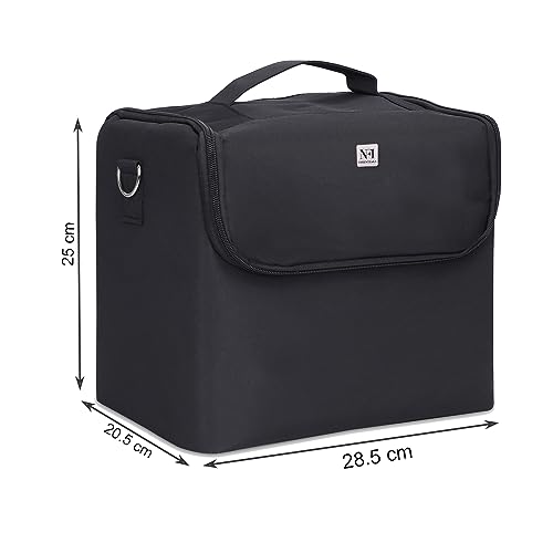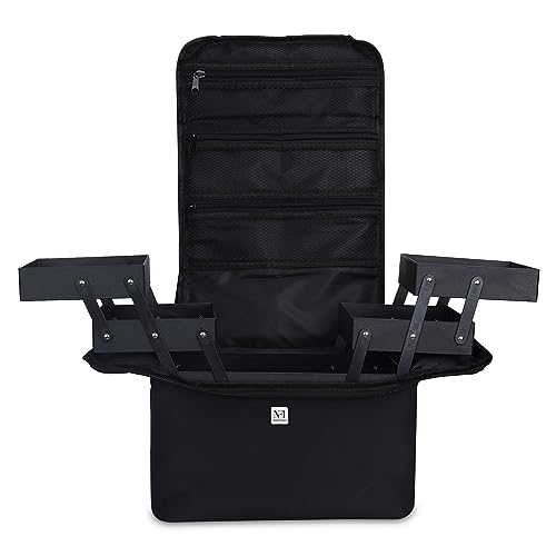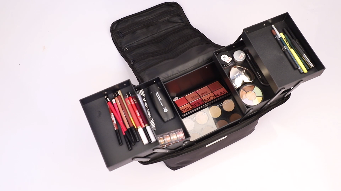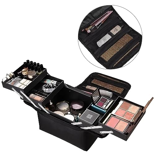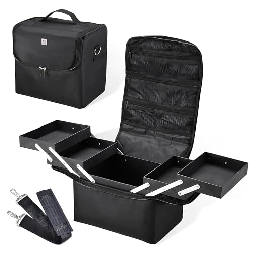 The bottom storage of the vanity bag is suitable for UV lamps creams bottles makeup remover hair dryer crafts DIY tools USB cables chargers. The trays of the cosmetic case are a perfect solution for storing the nail polishes eye-shadows lipsticks nail tools and hairdressing tools. The zipper net pocket on the lid of this large makeup box is a perfect solution for organising the makeup brushes eye-liners and other makeup tools. This makeup travel bag comes with a removable shoulder strap you could carry the box easily during the trip. The thicker handle is comfortable for carrying the vanity case. You could take the makeup organiser case off the bag to clean. Only simply wipe with a paper towel or a damp cloth to clean the stains on the trays.