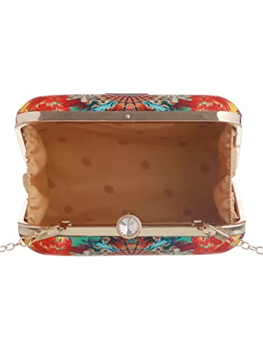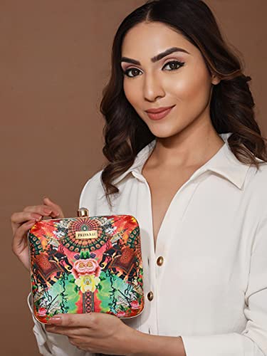 Be the star of the party by styling your outfit with this stunning clutch by Priyaasi. It is crafted in a square-shaped multicolor printed design enclosed with a click closure. It has a detachable chain strap.