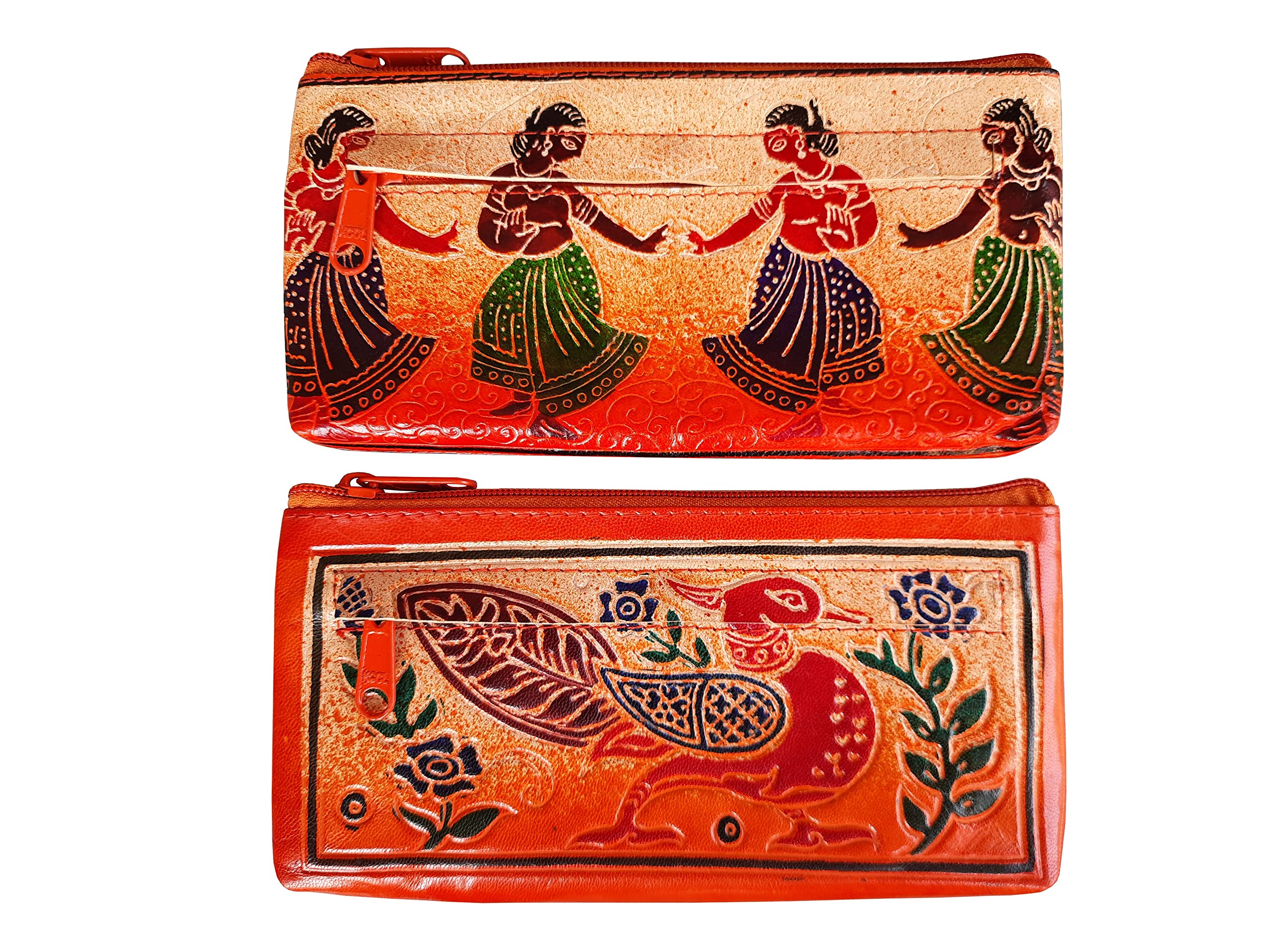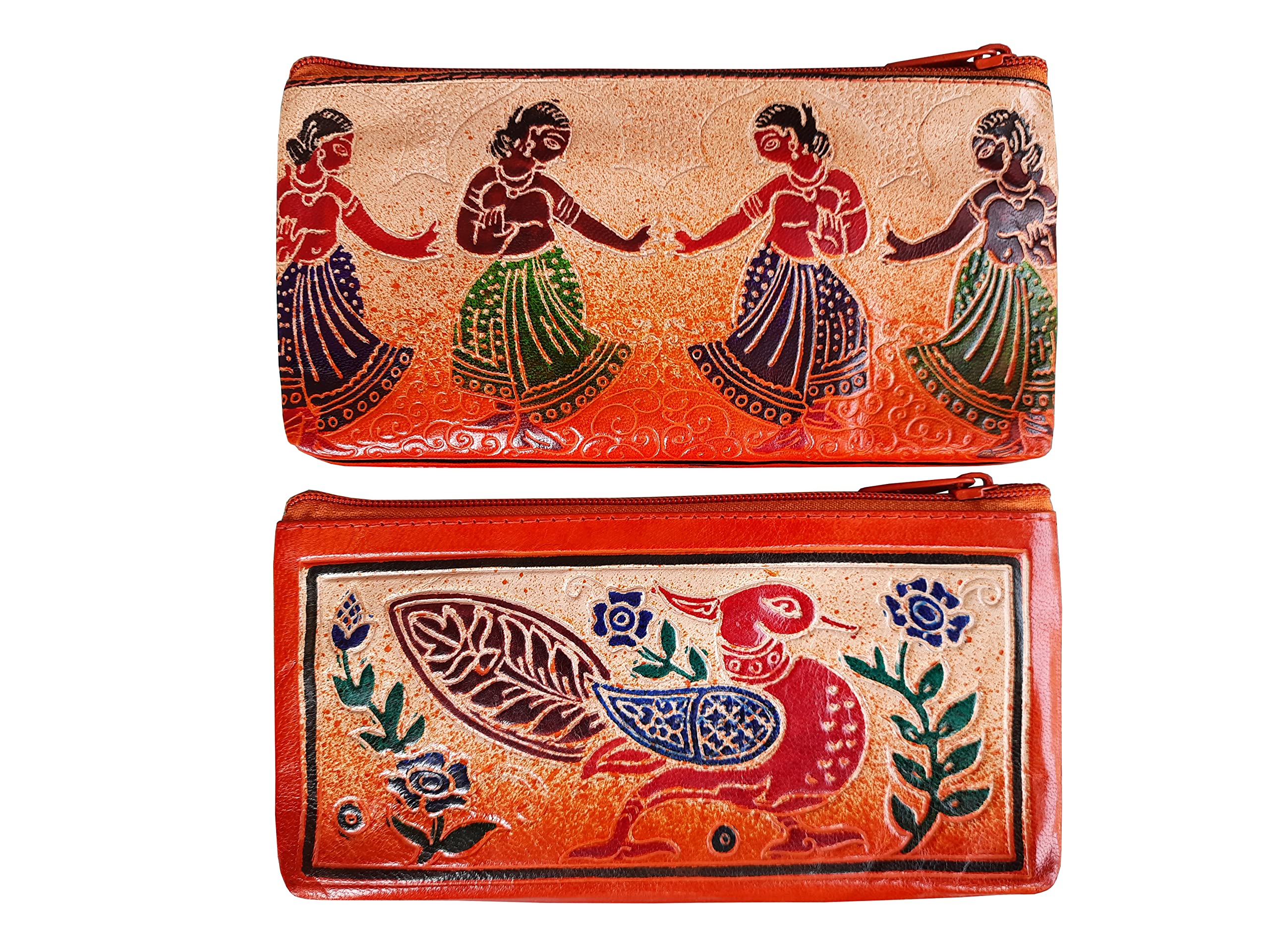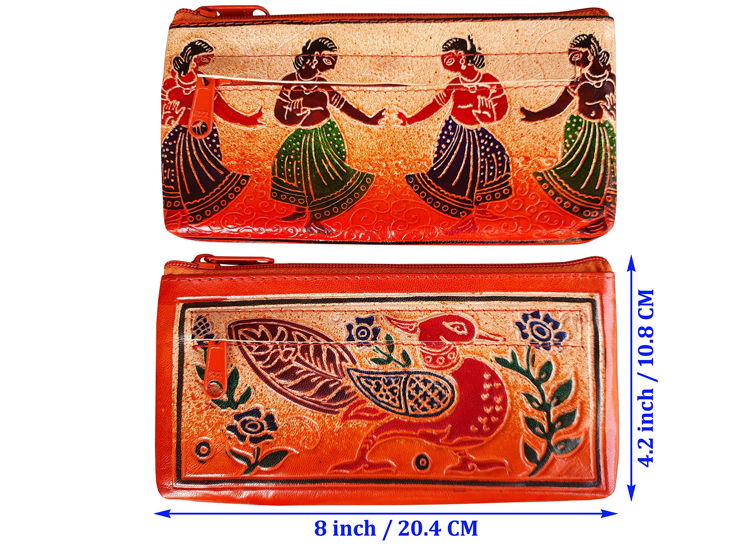 Handcrafted from Genuine Leather a Beautiful Ethnic Art of West Bengal. A Definite Eye-Catcher in any Event and Carries your Essentials Easily. Design on Both Sides One Main Zipper compartment and One Zipper pocket in Back. Traditional Block print. This purse is a classic example of age old Shantiniketan craft which was introduced in West Bengal India during the 1940s. The Shantiniketan style evolved as a result of the Art Movement and these products have now become world famous for their applique batik and embossed craft work. The process of burnishing the leather gives it an elegant sheen and brings out the colors. The major embossing craft is done by hand and is an intricate process. After the final leather made it is then stitched into the desired product coated with a lacquer finish for making the product shiny and long lasting. We are happy for your interest SHANTINIKETAN EMBOSSED LEATHER PRODUCTS and artist of Shantinikan thanks to you.