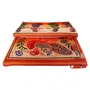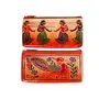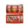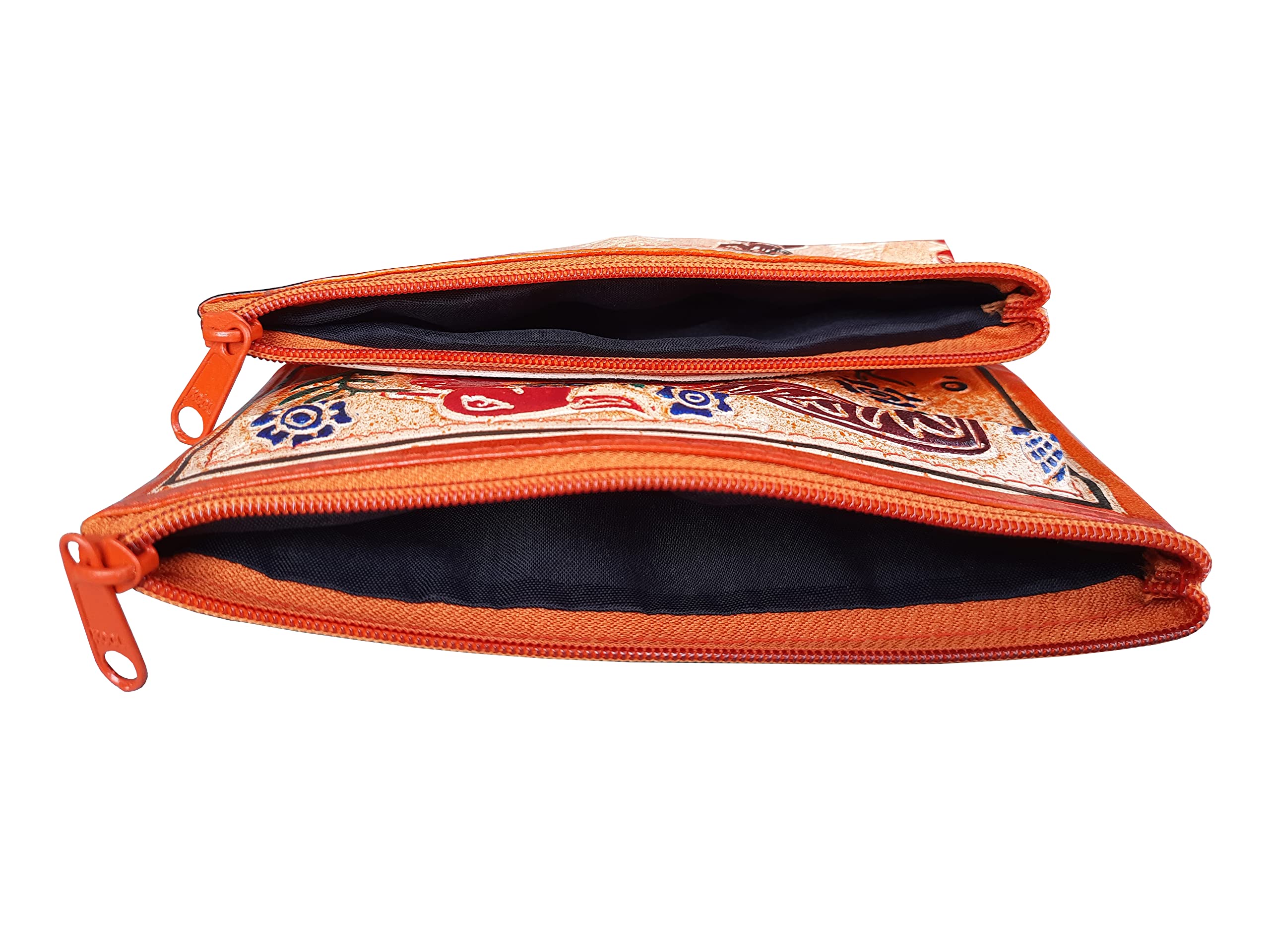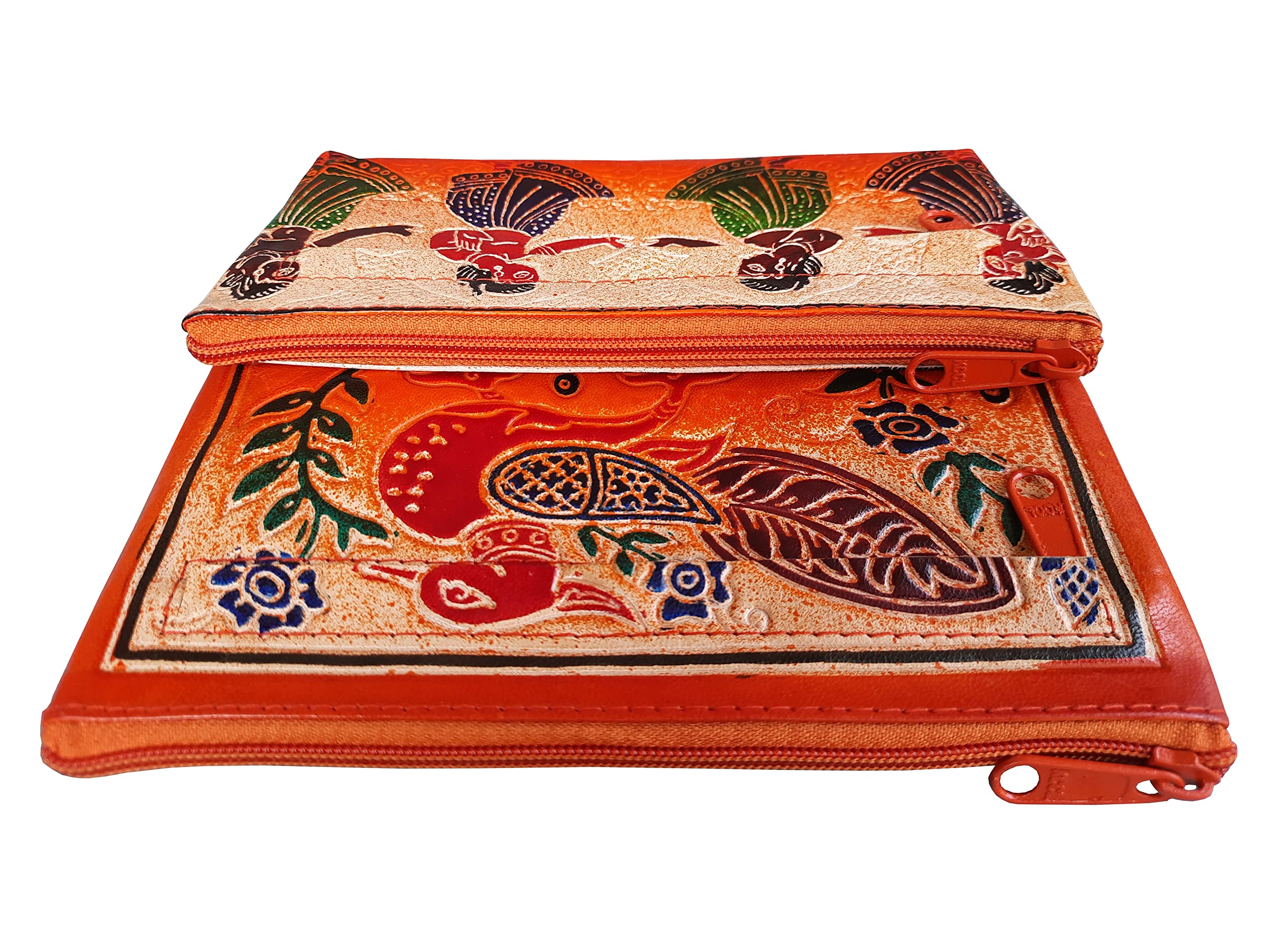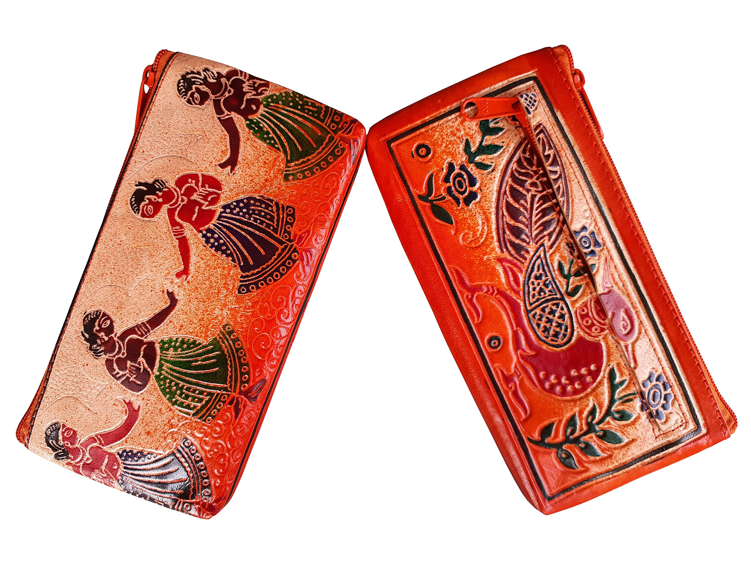 Handcrafted from Genuine Leather a Beautiful Ethnic Art of West Bengal. A Definite Eye-Catcher in any Event and Carries your Essentials Easily. Design on Both Sides One Main Zipper compartment and One Zipper pocket in Back. Traditional Block print. This purse is a classic example of age old Shantiniketan craft which was introduced in West Bengal India during the 1940s. The Shantiniketan style evolved as a result of the Art Movement and these products have now become world famous for their applique batik and embossed craft work. The process of burnishing the leather gives it an elegant sheen and brings out the colors. The major embossing craft is done by hand and is an intricate process. After the final leather made it is then stitched into the desired product coated with a lacquer finish for making the product shiny and long lasting. We are happy for your interest SHANTINIKETAN EMBOSSED LEATHER PRODUCTS and artist of Shantinikan thanks to you.