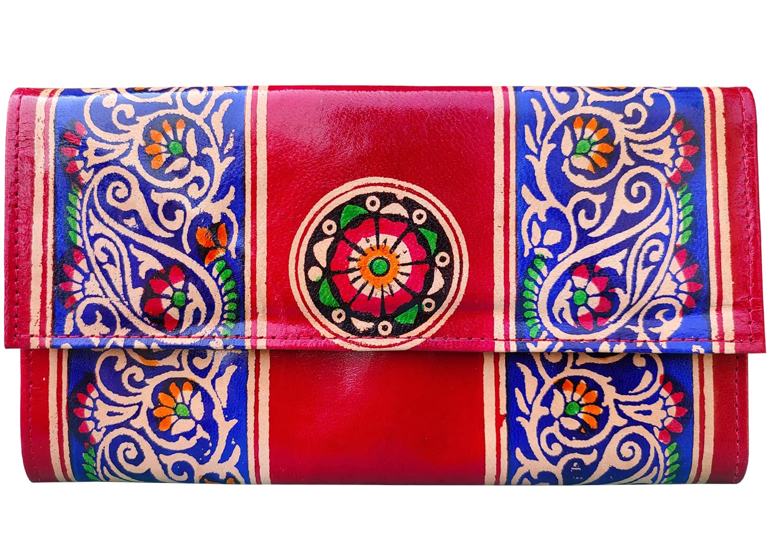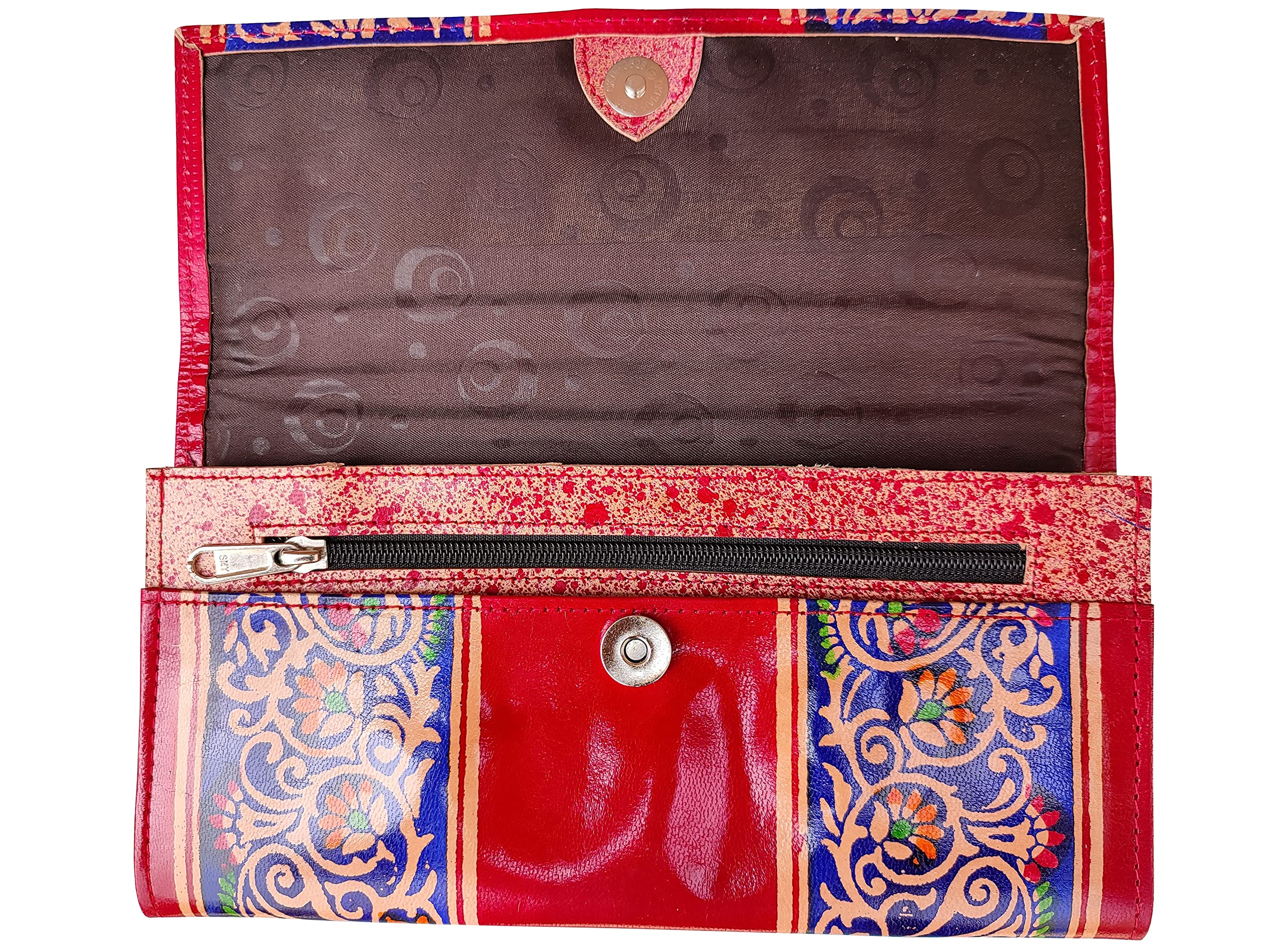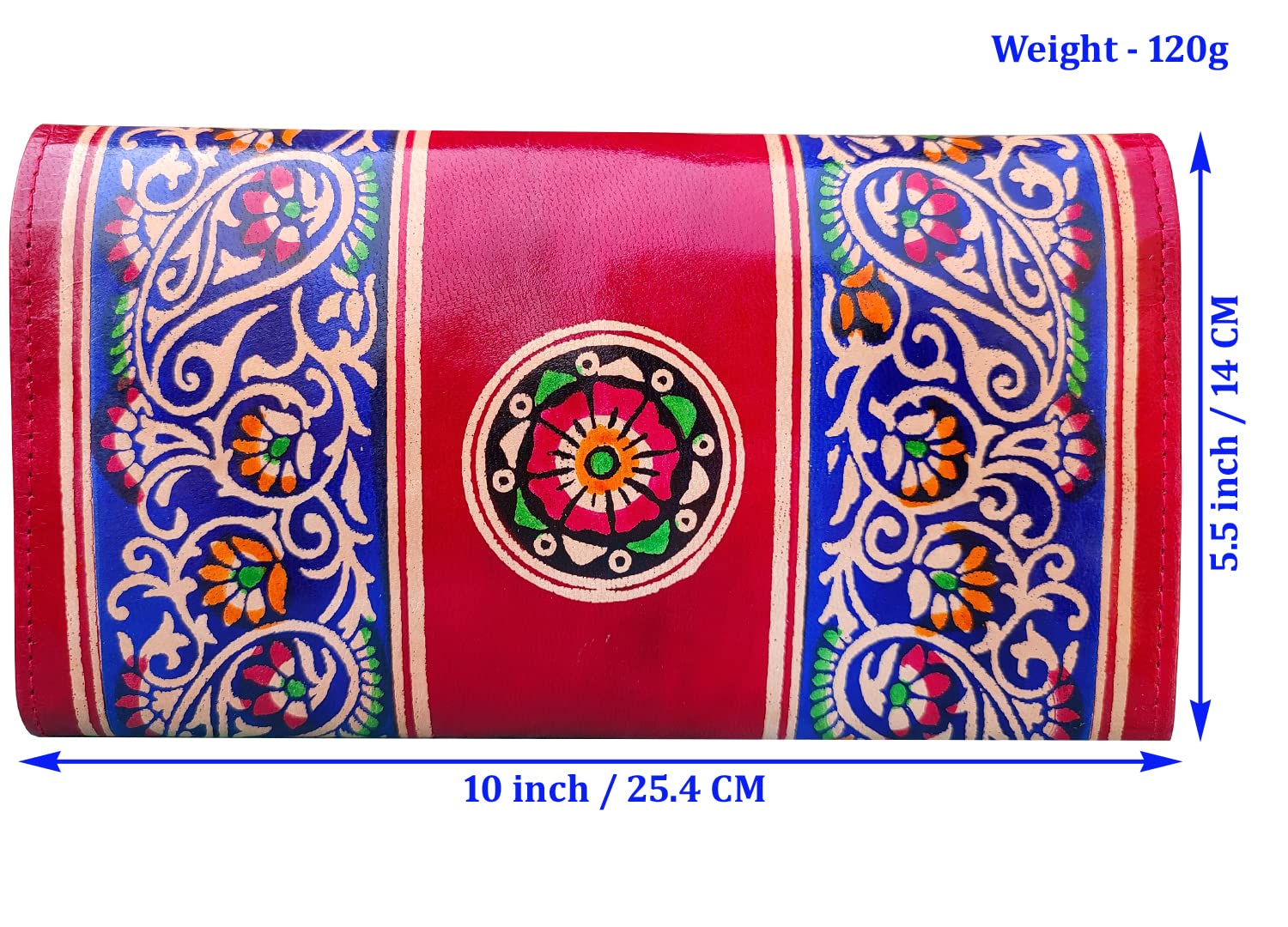 Handcrafted from Genuine Leather a Beautiful Ethnic Art of West Bengal. Design on both sides Multiple Compartments Closure: Zip and Magnetic button. This purse is a classic example of age old Shantiniketan craft which was introduced in West Bengal India during the 1940s. The Shantiniketan style evolved as a result of the Art Movement and these products have now become world famous for their applique batik and embossed craft work. The process of burnishing the leather gives it an elegant sheen and brings out the colors. The major embossing craft is done by hand and is an intricate process. After the final leather made it is then stitched into the desired product coated with a lacquer finish for making the product shiny and long lasting. We are happy for your interest SHANTINIKETAN EMBOSSED LEATHER PRODUCTS and artist of Shantinikan thanks to you.