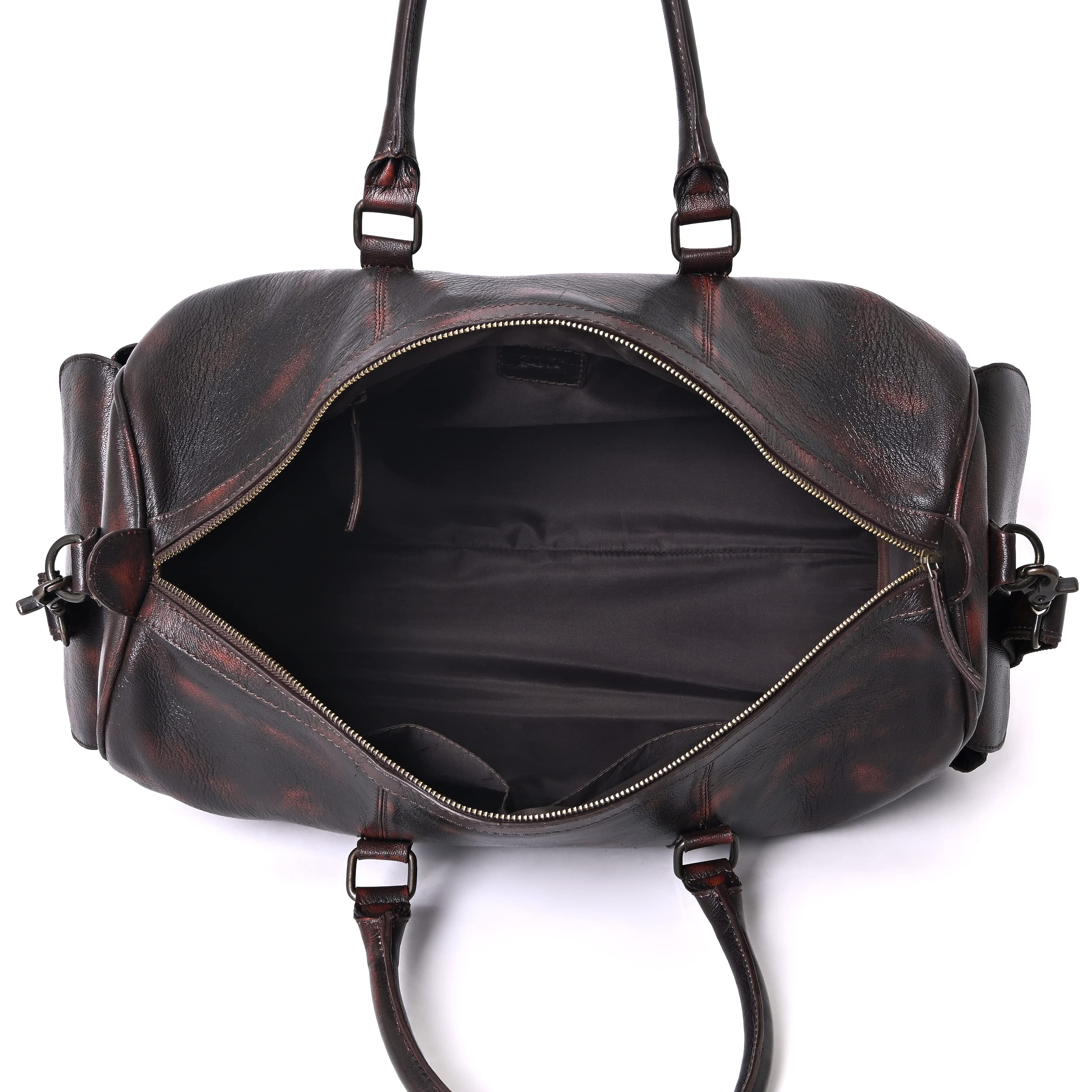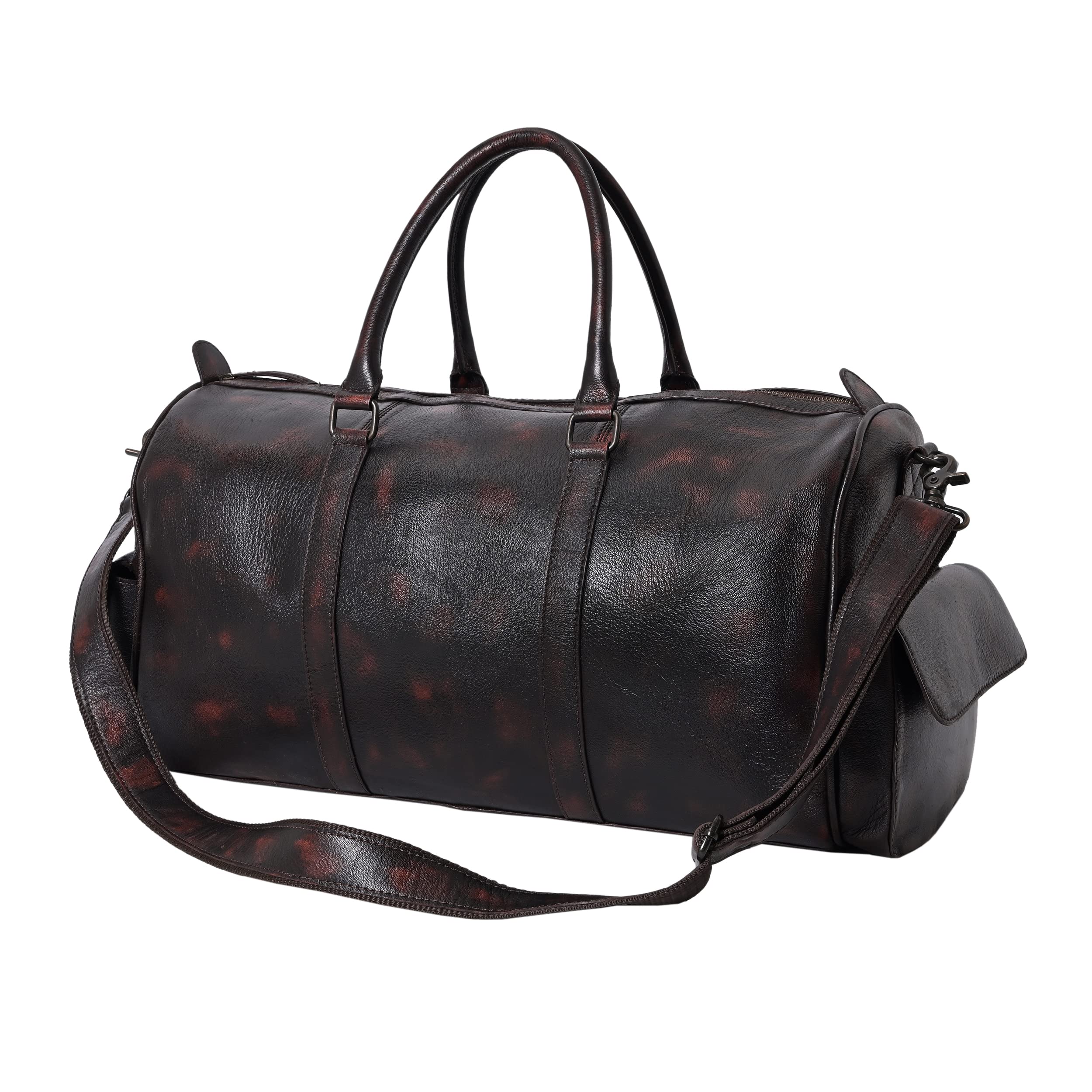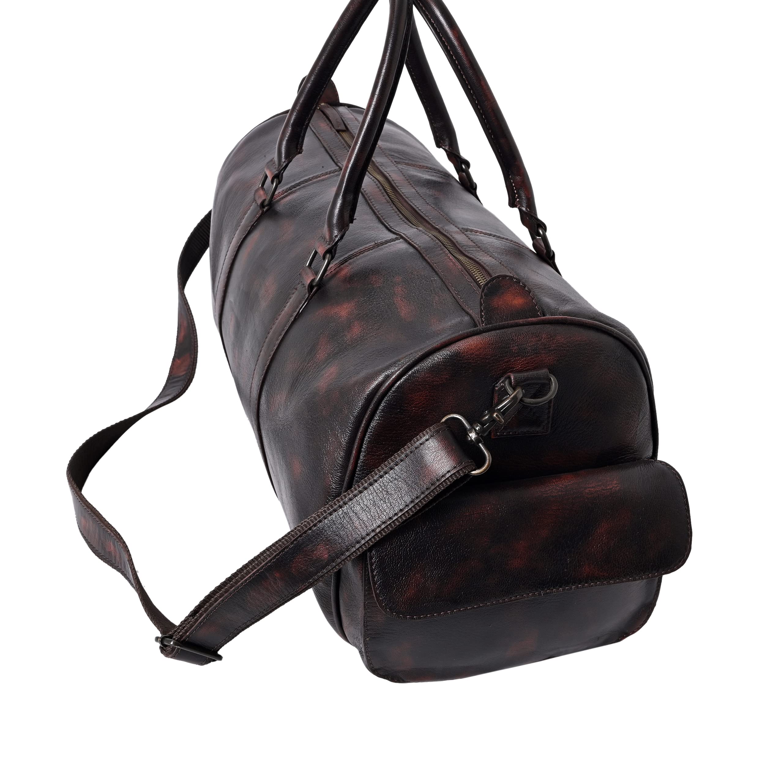 Travel in style with this elegant & durable brown travel duffle luggage bag made from high quality genuine full grain goat vintage brush off leather. Whether jet-setting around the world or going on a weekend trip this premium light-weighted beauty is your perfect pick. It fastens fully with a zipper on top. Very spacious to store all your essentials it has an inner zipper compartment along with two other open compartments inside the bag. Also there are two pockets on the sides for extra storage & convenience that close with a magnetic button. The padded double handles are comfortable to hold & it also comes with an adjustable & detachable shoulder strap. So carry it as a hand-held bag or over your shoulders. The bag has protective feet at the bottom. Dimensions- Length: 18.8 inches H: 13.3 inches W: 7.8 inches Genuine leather bags are well worth the cost especially if they are handmade. With expert craftsmanship and durability of leather they are bound to last for many years and even weather. They get even better with time!
