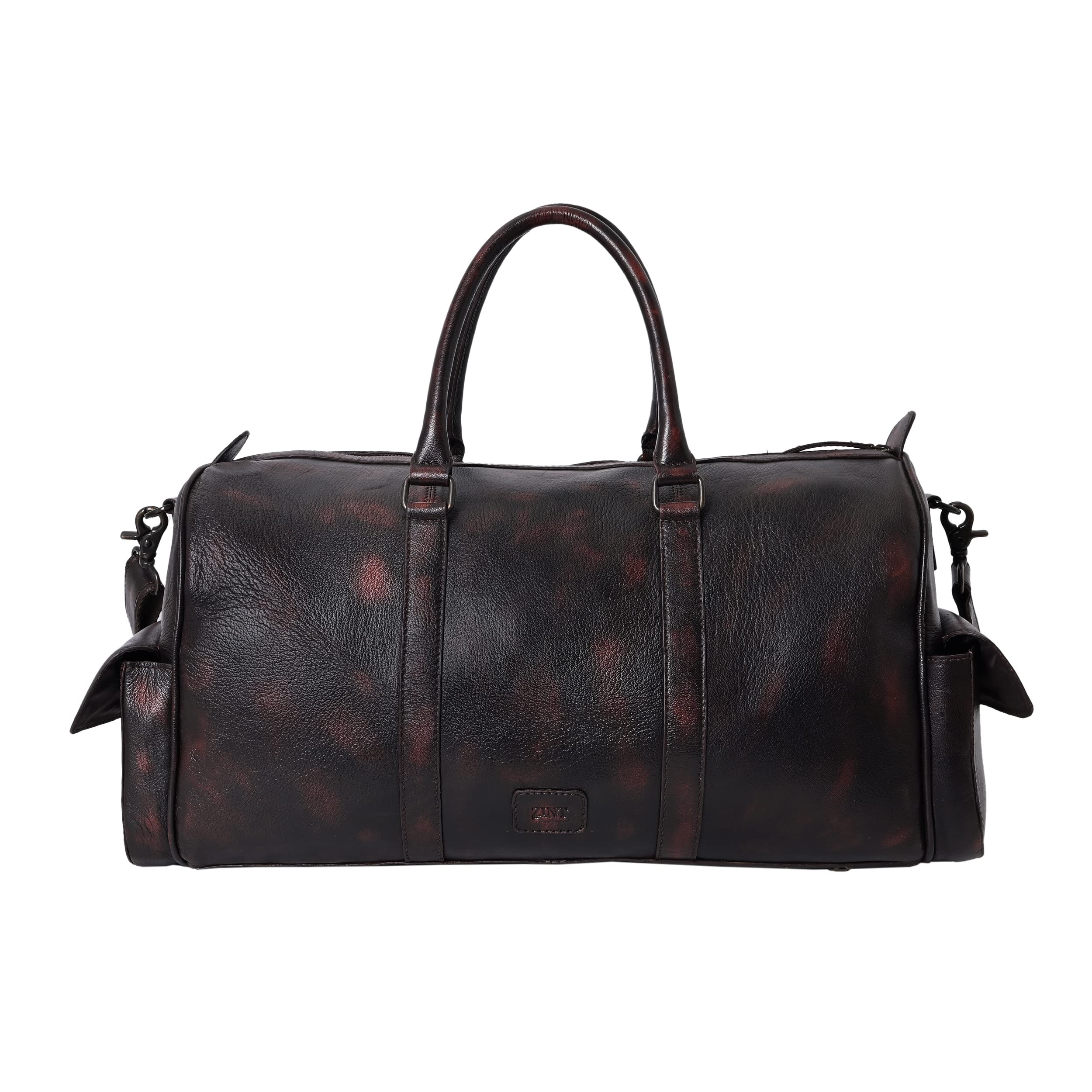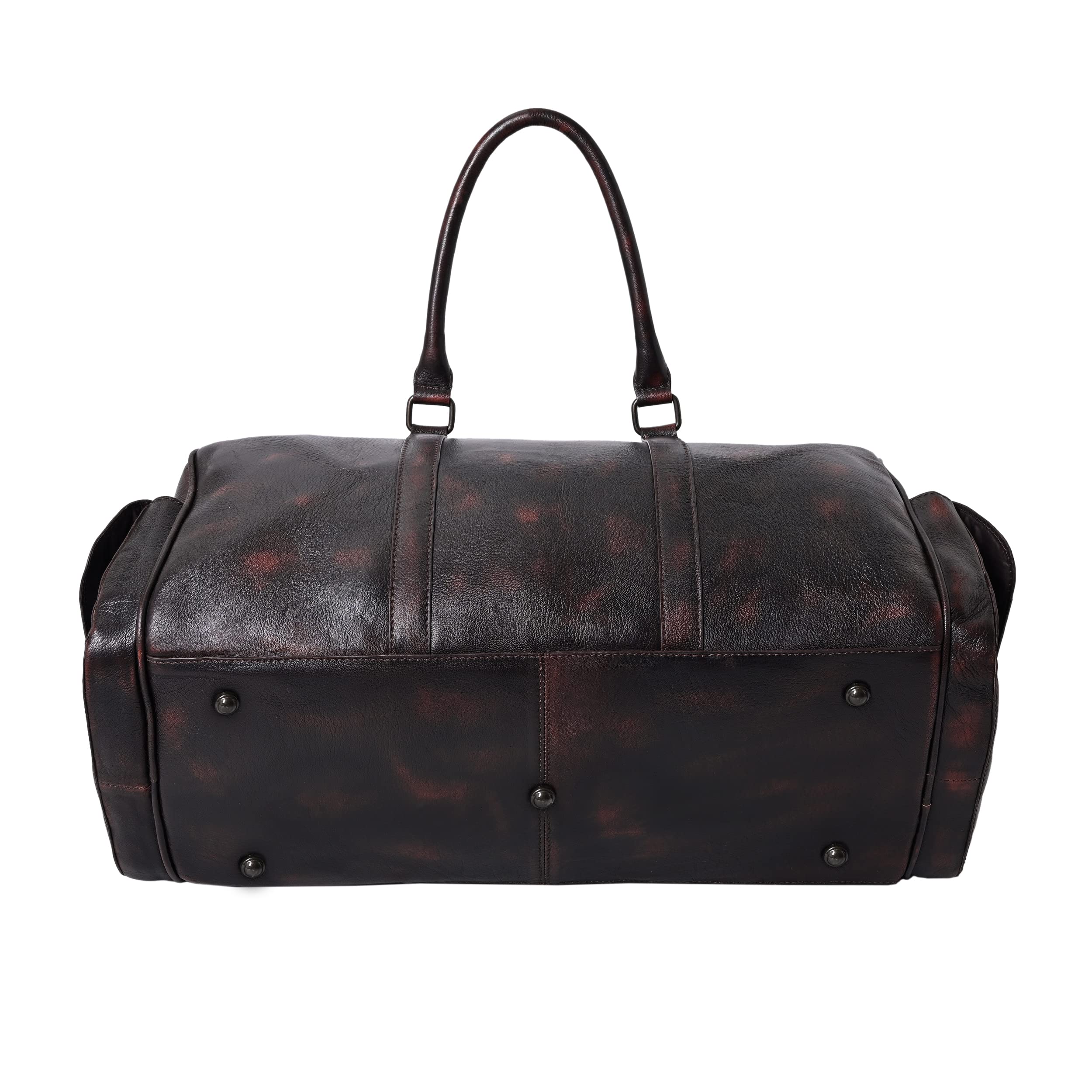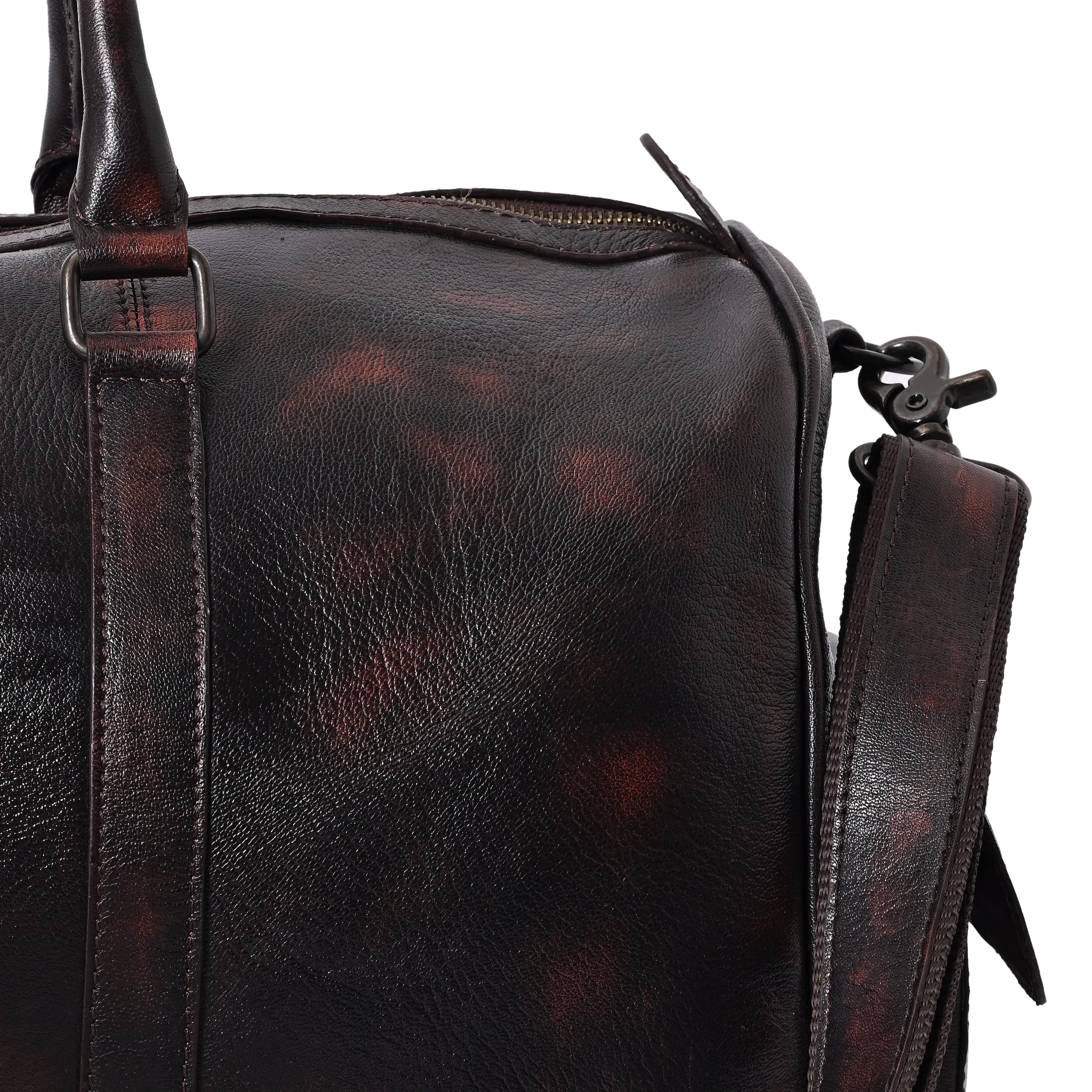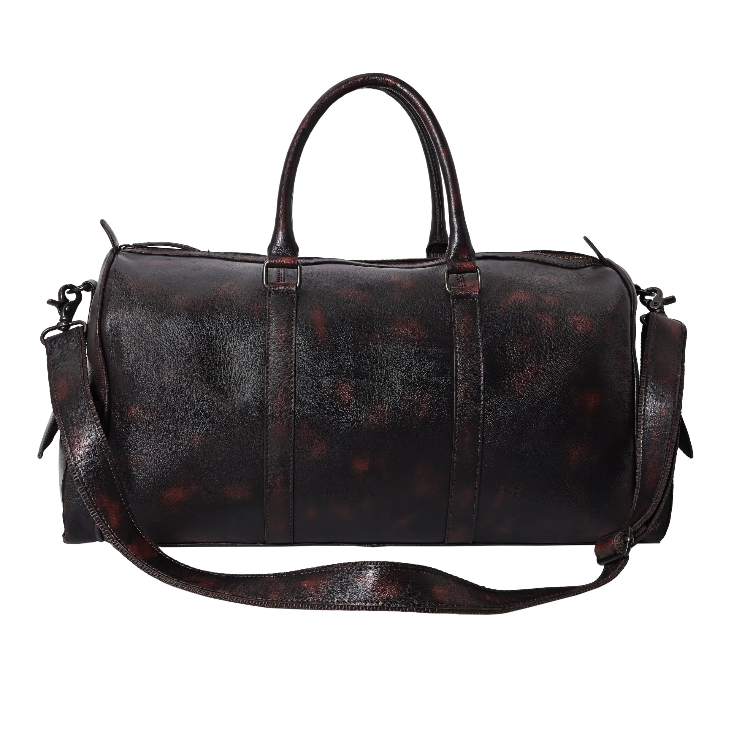 Travel in style with this elegant & durable brown travel duffle luggage bag made from high quality genuine full grain goat vintage brush off leather. Whether jet-setting around the world or going on a weekend trip this premium light-weighted beauty is your perfect pick. It fastens fully with a zipper on top. Very spacious to store all your essentials it has an inner zipper compartment along with two other open compartments inside the bag. Also there are two pockets on the sides for extra storage & convenience that close with a magnetic button. The padded double handles are comfortable to hold & it also comes with an adjustable & detachable shoulder strap. So carry it as a hand-held bag or over your shoulders. The bag has protective feet at the bottom. Dimensions- Length: 18.8 inches H: 13.3 inches W: 7.8 inches Genuine leather bags are well worth the cost especially if they are handmade. With expert craftsmanship and durability of leather they are bound to last for many years and even weather. They get even better with time!