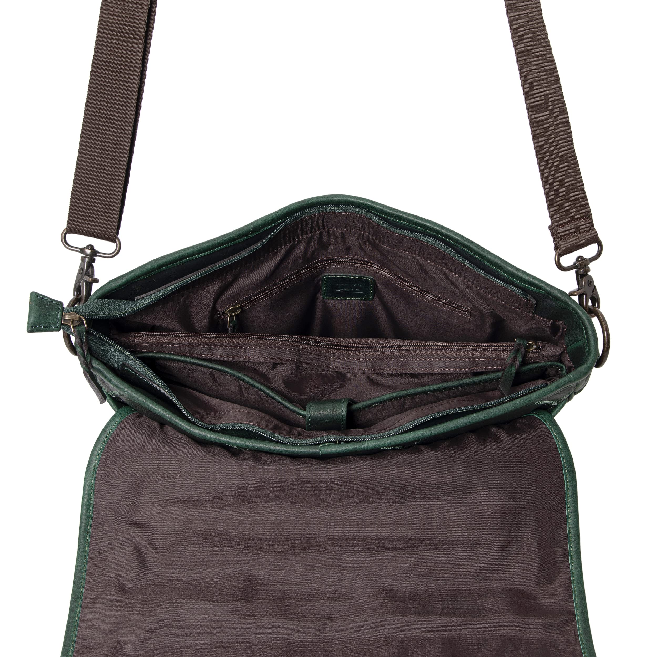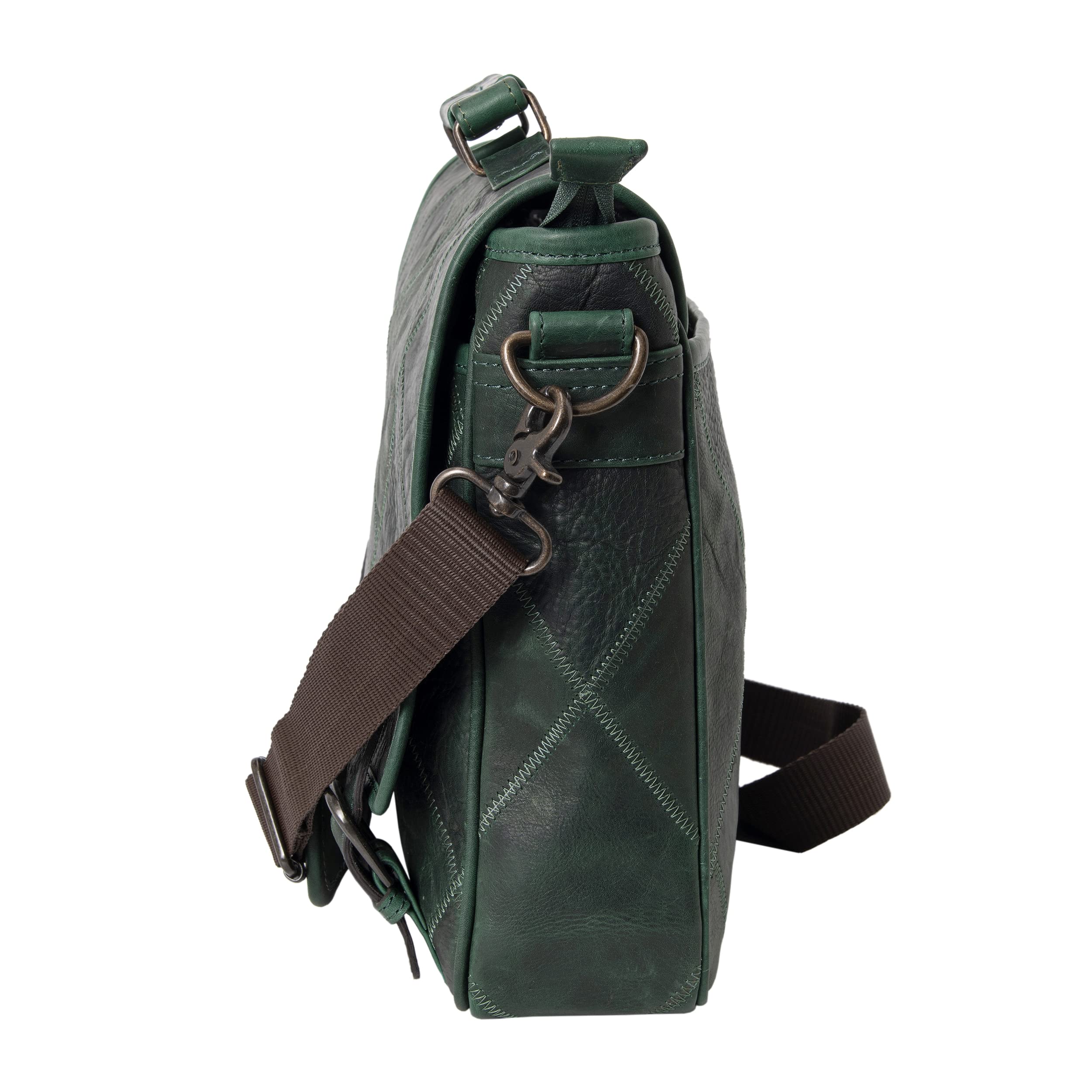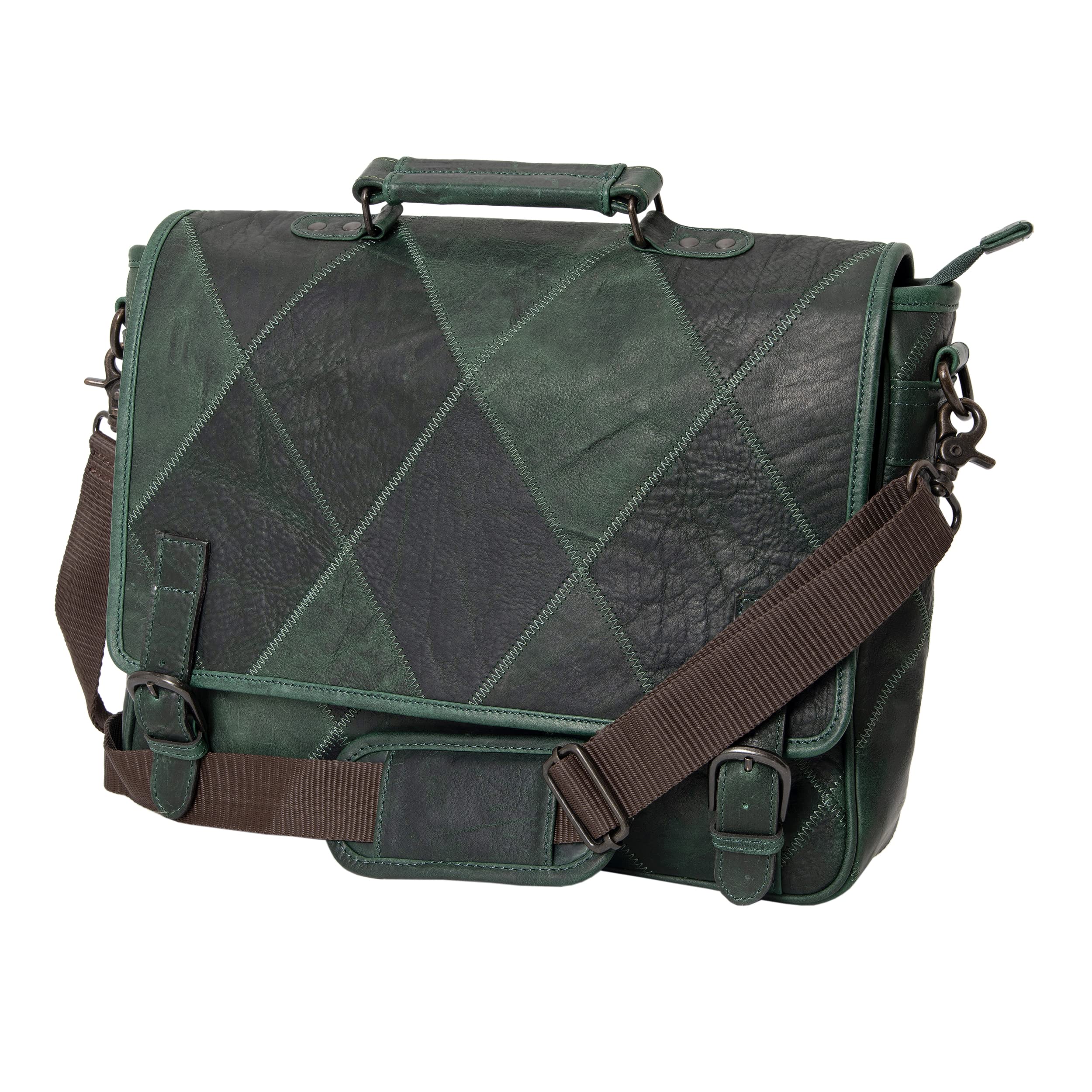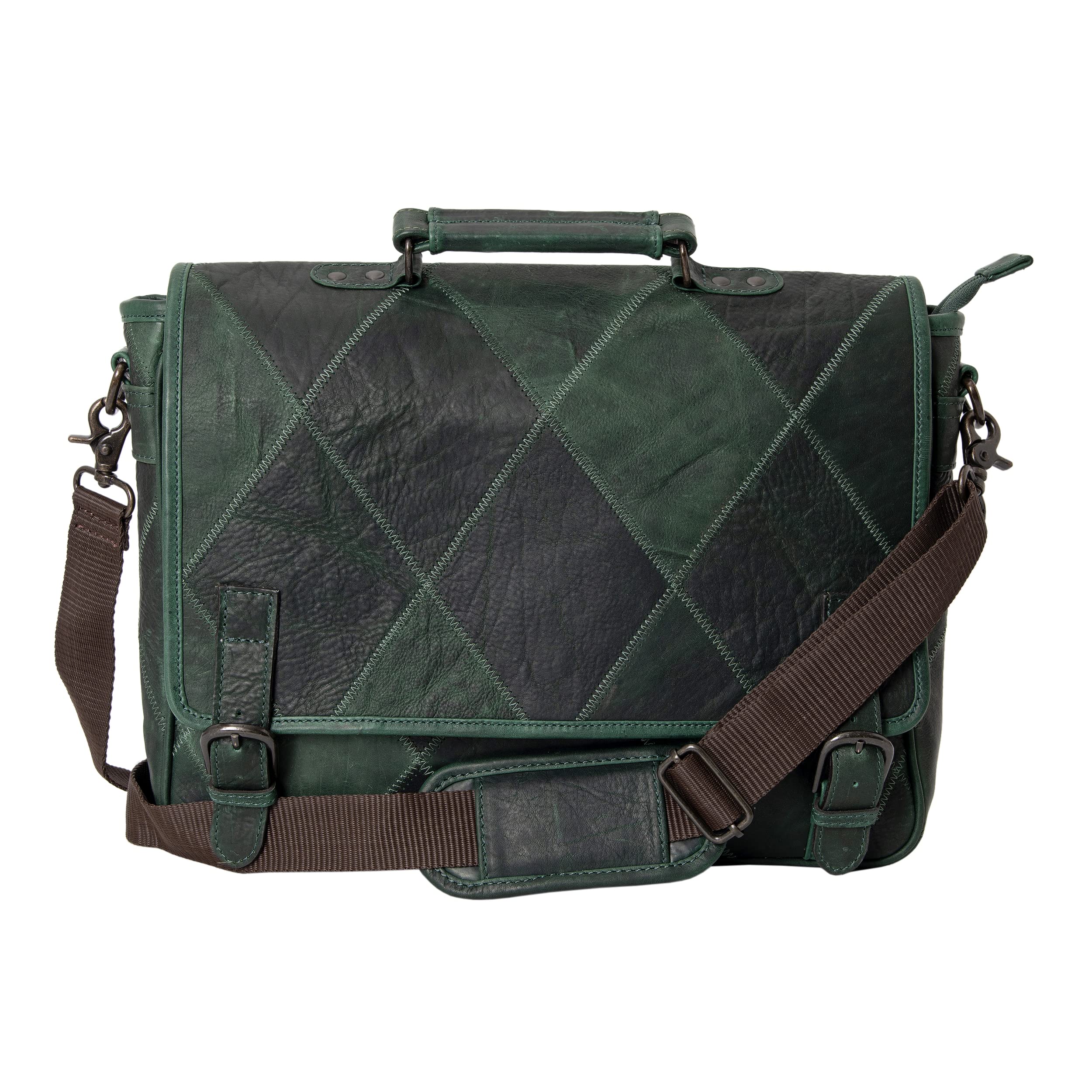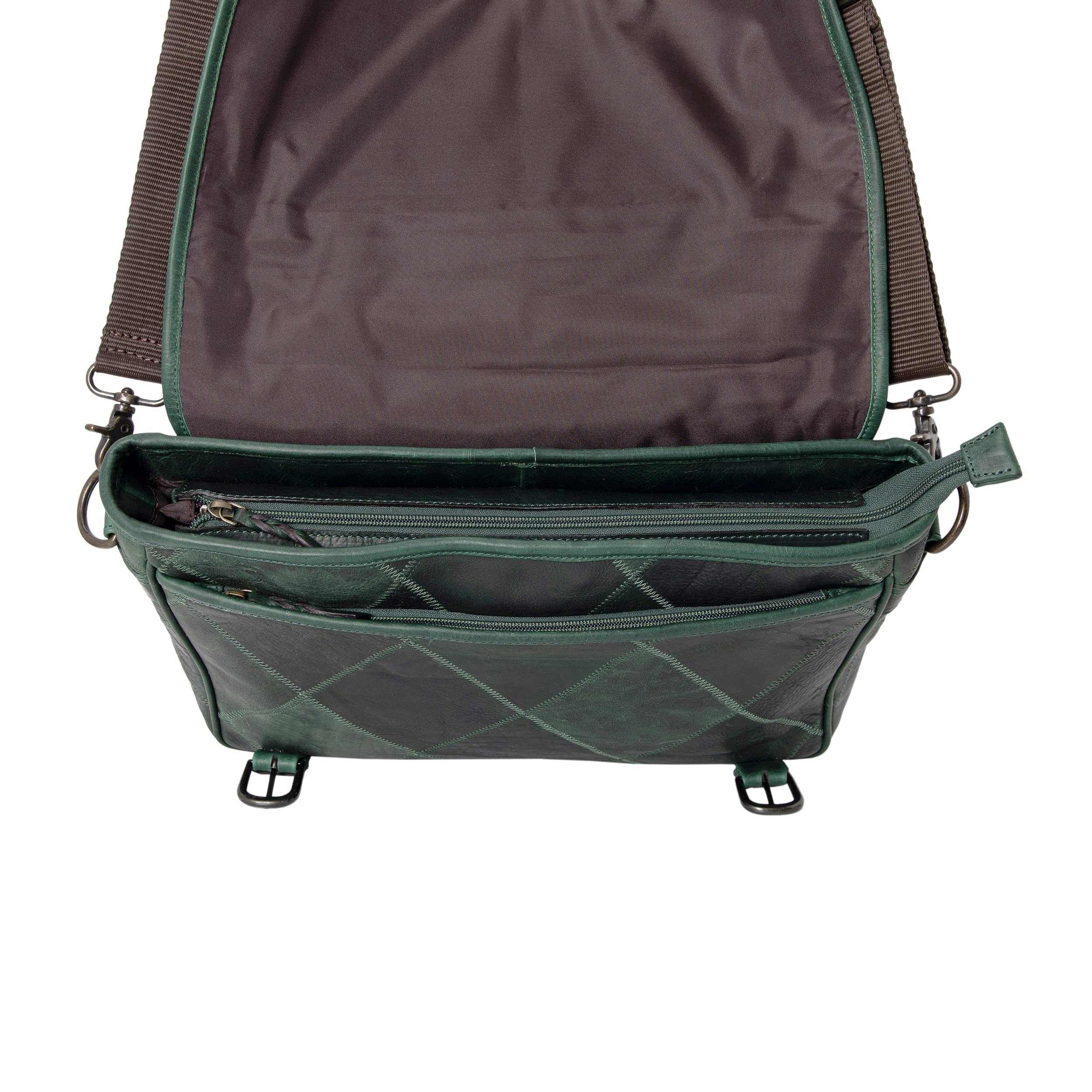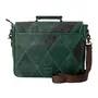 This is a handmade green coloured Portfolio / Office Bag / Laptop Bag / Travel Bag made from 100% waxy genuine full grain leather. Features of the bag: It closes fully with a zipper on top & a flap-over with buckles. It is quite spacious with multiple compartments. Inside the bag there are two large open compartments & one large zipper compartment to carry all your office essentials like files folders documents etc. & a padded laptop compartment that is fastened with a small velcro flap. There is also a small zipper pocket inside & a zipper compartment in front. An open pocket at the back of the bag gives you extra storage that is handy. This bag is suitable for formal business meetings casual outings or college classes. It is also suitable for a weekend getaway as it can accommodate a set of clothes. The bag can be carried in hand or over your shoulder using the comfortable adjustable detachable shoulder strap. Dimensions: Length: 15.35 inches Width (at base): 3.5 inches Height: 11.4 inches