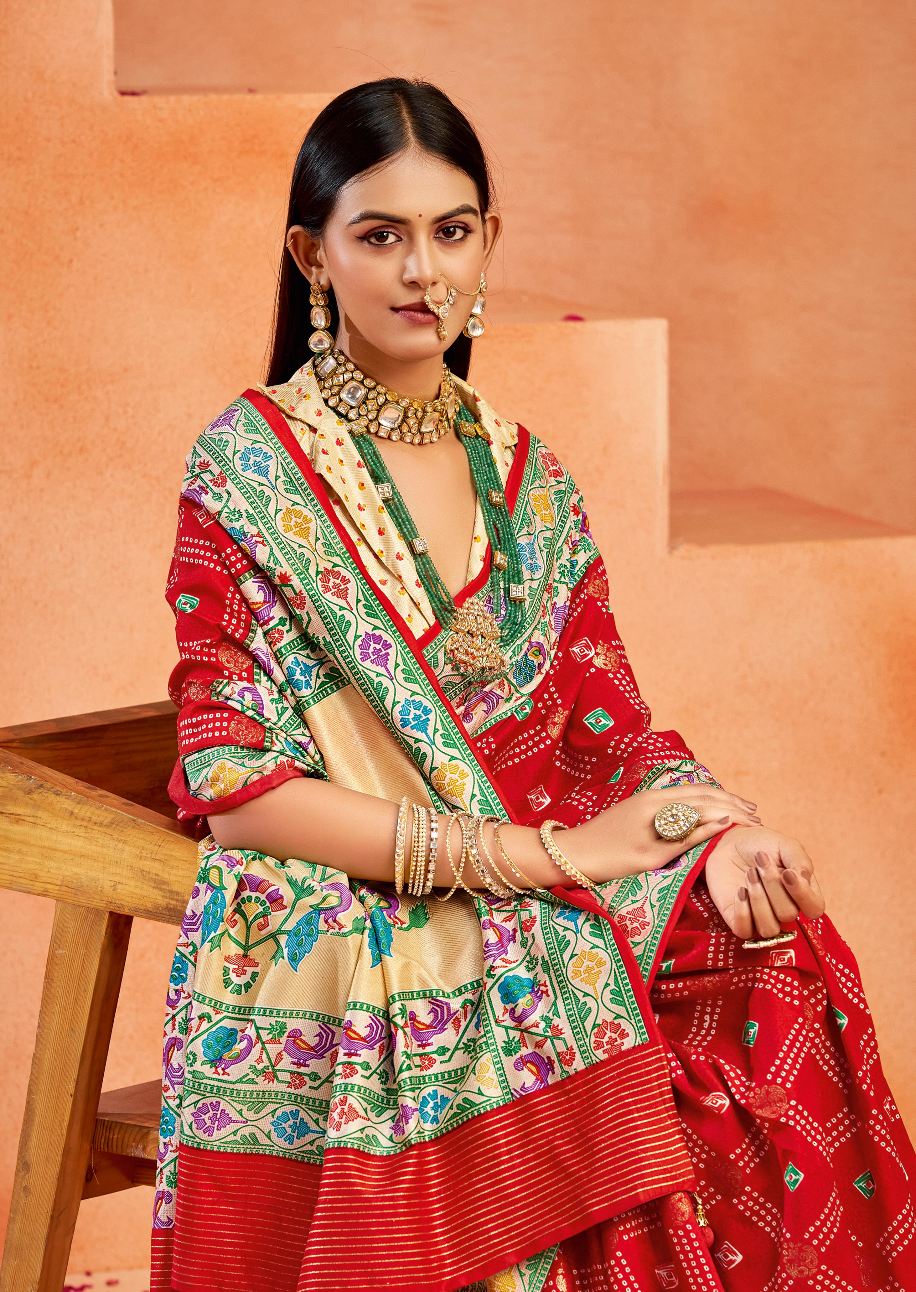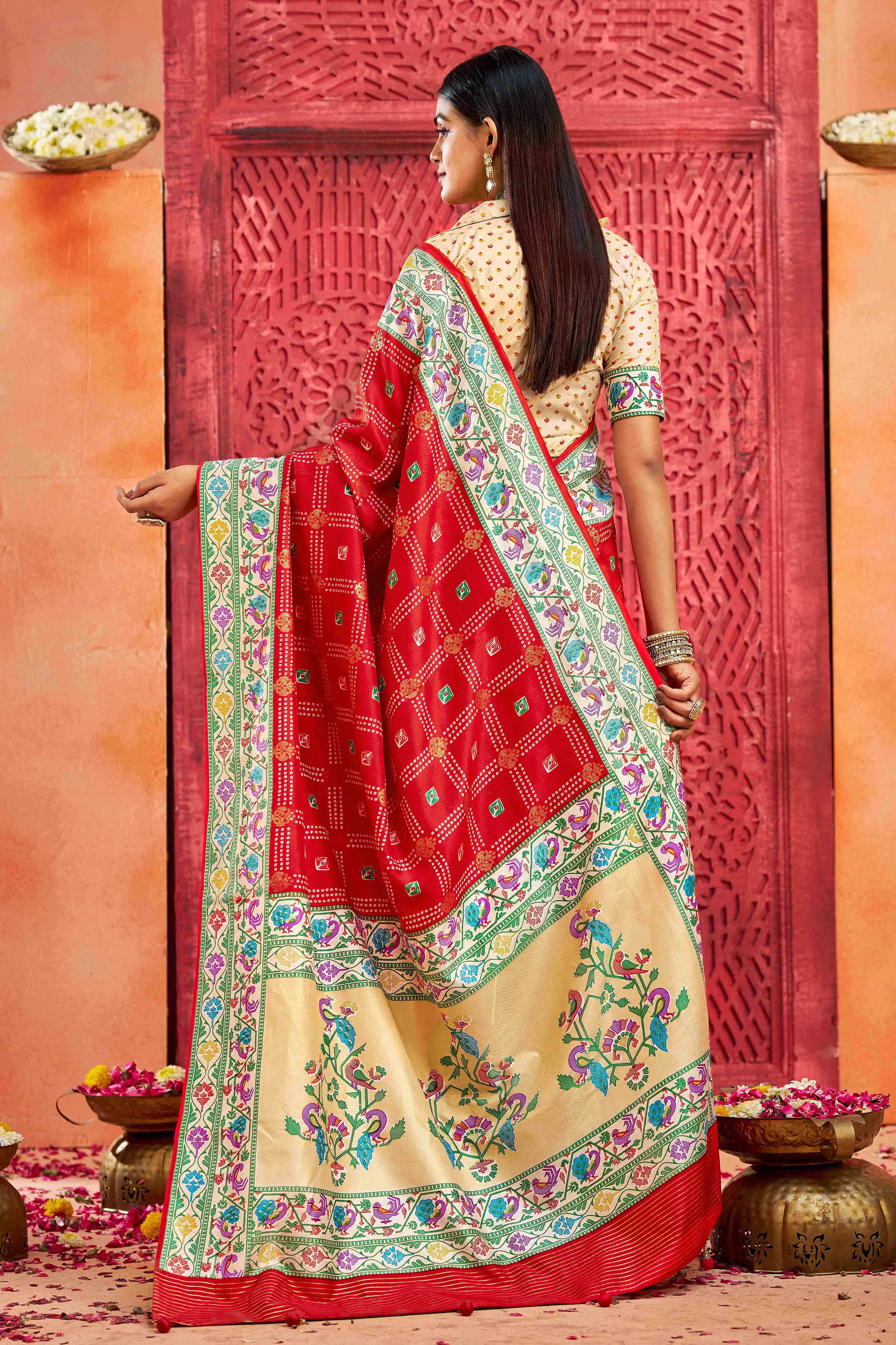 Red Color Velvet Tussar Silk Fabric Partywear Saree With Paithani Pallu And Traditional Ghatchola Print