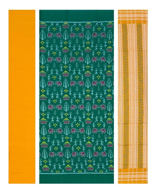 SAMBALPURI BANDHA CRAFT Sambalpuri cotton dress material set(Elephant and terracotta art design in green color base)