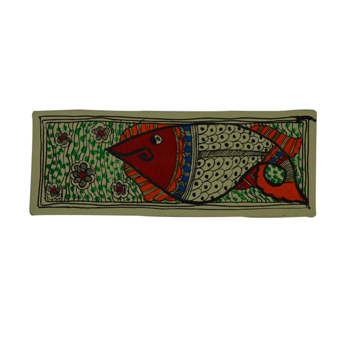 A traditional multi coloured Madhubani painting depicting a fish with ability to entice the boatmen as perceived by the artist. These paintings are inspired by folklore. Only hand made paper cured with cow dung is utilized and is a signature livelihood of the painters of Madhubani, Bihar, India.