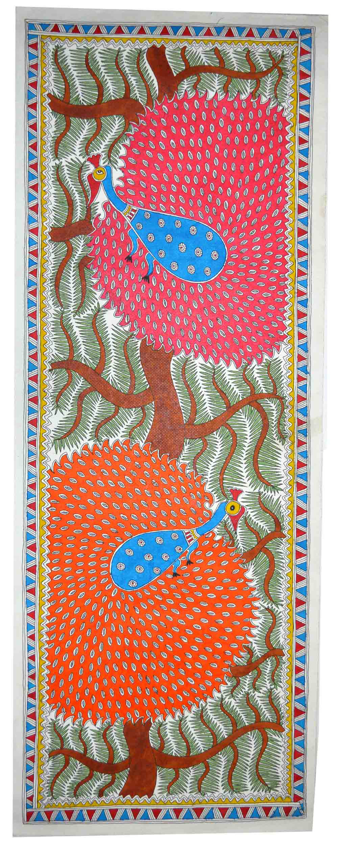 A traditional multi coloured Madhubani painting depicting a peacock couple as a symbol of serenity and peaceful coexistence as perceived by the artist.The strokes of the painting quill are very fine but distinct. These paintings are inspired by folklore. This is a traditional gift for all occasions.This handicraft is made using hand made paper cured with cow dung and is a signature livelihood of the painters of Madhubani, Bihar, India.