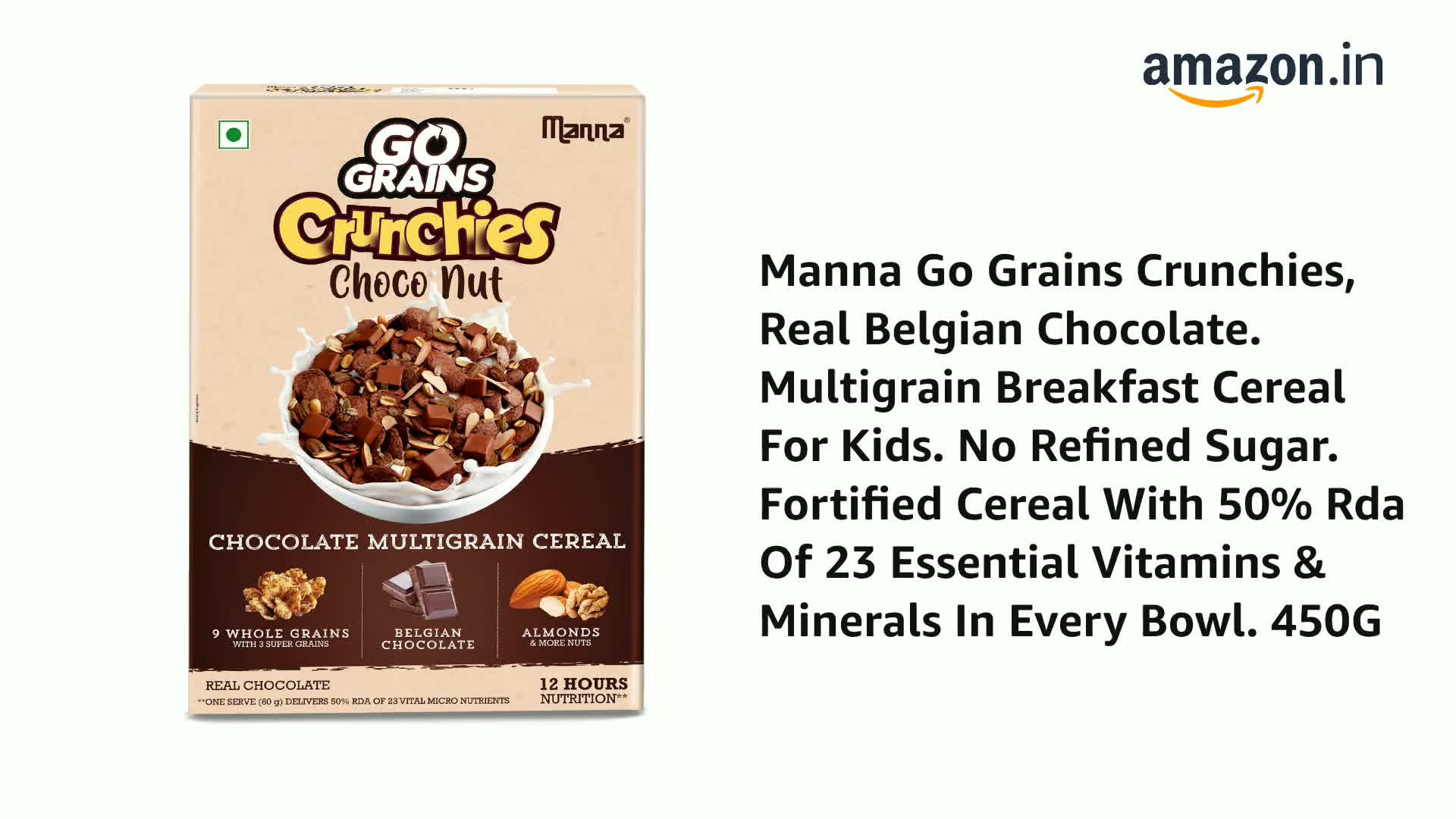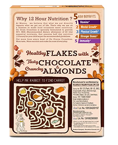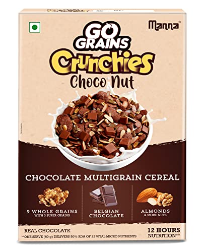 HomeGroceryHealthy BreakfastCereals & PorridgeManna Go Grains Crunchies, Real Belgian Chocolate. Multigrain Breakfast Cereal For Kids. No Refined Sugar. Fortified Cereal With 50% Rda Of 23 Essential Vitamins & Minerals In Every Bowl. 450G