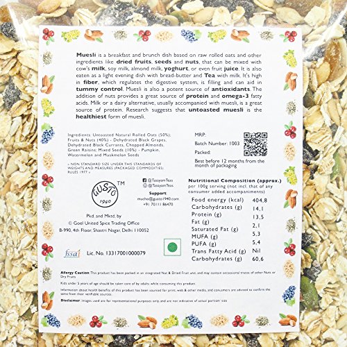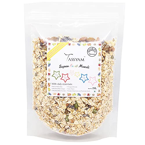 Super Fruit Muesli Cereal 250gms (8.8 oz), Rolled Oats + Dehydrated & Dried Fruits by Tassyam
