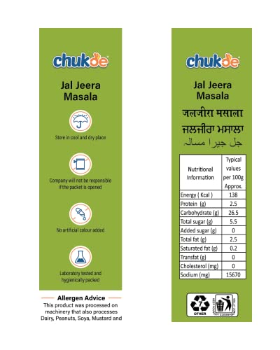 Introducing Jal Jeera Masala by Chukde a popular spice blend in India that is commonly used to flavor drinks snacks and me. This 100 gm pack contains a blend of iodized salt black salt dry mango slices cumin tamarind mint leaves citric acid dry ginger yellow chilli black pepper clove turmeric and asafoetida.One of the advantages of using Jal Jeera Masala is its benefits. It contains cumin coriander ginger and other spices that can help to promote bloating and and alleviate . itionally the cooling effect of Jal Jeera Masala due to the presence of mint and other cooling spices can help to cool the body and making it a popular drink during hot summers.Jal Jeera Masala o s a delicious and unique flavor to drinks snacks and memaking it a popular choice for those who enjoy spicy and tangy flavors. Furthermore some of the spices in Jal Jeera Masala such as cumin and coriander contain antiand other beneficial compounds that can help to improve overall health and well-being.This versatile spice blend can be used in a variety of ways including as a spice blend for cooking a seasoning for snacks or a flavoring for drinks like lemonade and soda. Rest assured that this product is laboratory tested and hygienically packed and contains no artificial colors.
