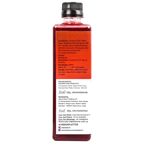 Received cranberry syrup with 2 months expiration left,very old stock. Also contains lots of preservatives (sodium benzoate)A big no no..never expected this from urban platter..Dont get fooled by the tag (made from real fruit)