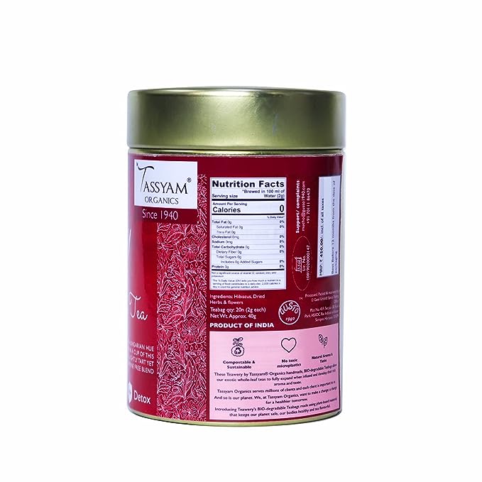 Tassyam Teawery Red Piroska Tea is a caffeine free tea blend of hibiscus, rose petals, which gives a subtle tart flavour with pleasant notes of rose. These pyriamid tea bags are made of 100% BIO-degradable plant based material which are much healthier for the body as well as for the environment.