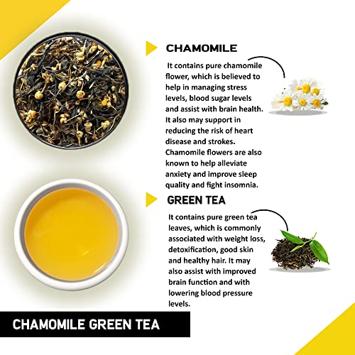 • A sip of Healthy Life with Chamomile Green Tea Loose Leaves - Chamomile Green Tea helps with improving sleep quality and insomnia. It also helps alleviate and . Chamomile Green Tea helps relieve menstrual s and ease bloating in women. also it is known to