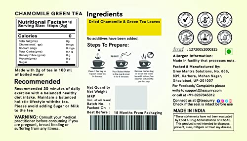 • Freshness and Eco-Conscious Packaging of Chamomile Green Tea Loose Leaves - TeaCurry brings you the freshness of the tea leaves by ensuring we package it garden-fresh. Our teas are heat-sealed with aluminum foil to retain their freshness and aroma at all