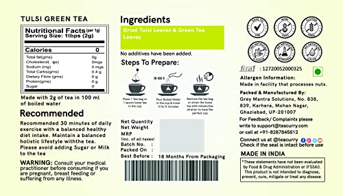 • 100% Natural Tulsi Tea - Teacurry Tulsi green tea consists of pure Tulsi leaves in form of Krishna Tulsi variety from farmlands in Punjab. Handpicked by our highly skilled master tasters over thousands of cups Teacurry Tulsi green tea helps prevent disor