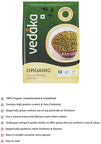 A staple in Indian diet Vedaka brings to you premium quality organic Whole Moong Dal (sabut) which is grown organically without the use of any fertilizers or pesticides. Vedaka Organic Whole Moong Dal is easy to cook and delicious and aromatic in taste. It undergoes a rigorous clean packaging procedure eliminating any kind of dust/foreign particles in the final product. It is hygienically packaged in a HACCP certified (a GFSI recognized Certification Programme) unit to ensure maximum retention of flavour and freshness. To retain freshness we recommend storing the dal in an airtight container once opened. Enjoy a delicious meal every time with Vedaka Organic Whole Moong Dal.