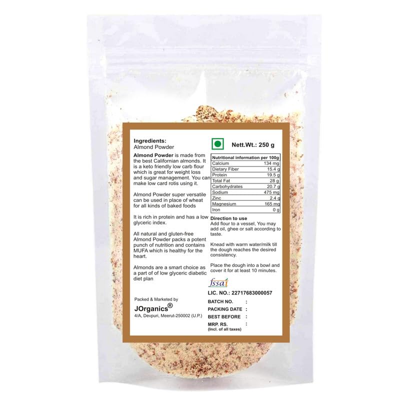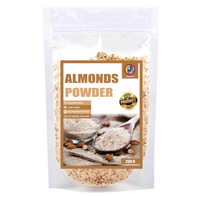JOrganics Almond Flour Un-blanched | Almond Powder | Low Carb - Gluten-Free | 227 gAlmond flour is a gluten-free nut flour that consists of nothing but ground blanched (no skin) almonds. It's often used as a low-carb substitute for wheat flour in bread and other baked goods.LOW CARB ALMOND FLOUR CAKEAn incredibly moist almond flour cake with a velvety mascarpone frosting and topped with fresh berries. Gluten-free sugar-free low carb and so nutritious you could eat it for breakfast.AMAZING HEALTH BENEFITSHealth-wise almond flour is a good bang for your buck and the ideal alternative for a gluten-free diet. This flour is high in protein (21% by weight) manganese vitamin E and monounsaturated fats low in carbohydrates and contains fiber.Lovely light little French almond meringue.Macarons made with almonds are an excellent source of protein. See macarons are healthy!*24x7 service available