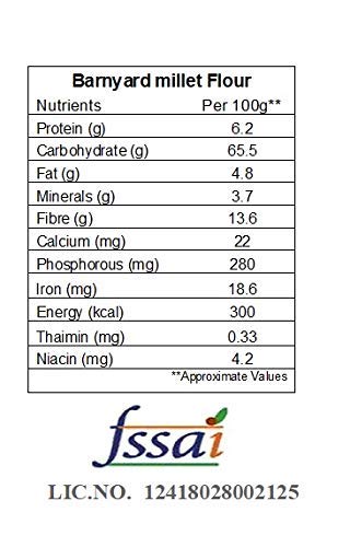 Lab test: B&B Organics procure their products from certified farmers B&B Organics periodically lab test their organic products to maintain its high quality and to prevent contamination.This barnyard millet flour is from the house of B&B Organics. It is organic and has shelf life up to 6 months. It comes in a heat sealed container. Health Benefits (Imprecise) :High in fiber.Good source of zinc and manganese helps to maintain body temperature. It has the lowest carbohydrates content and energy value among all the varieties of millets. Nutritional Value:100gms of barnyard millet has Protein-11.2 gFat-3.9gFiber-10.1gMinerals- 4.4gIron- 15.2 mgCalcium- 11 mgCalories -342 kcal.