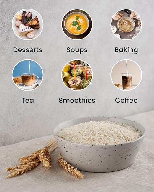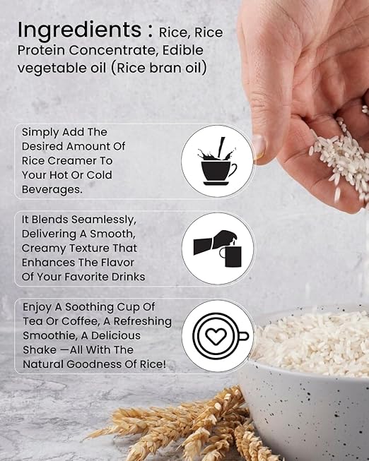 Discover the creamy, plant-based goodness of Rice Creamer, a dairy-free alternative perfect for enhancing your coffee, tea, smoothies, and desserts. Made from rice and rice protein concentrate, it blends effortlessly into hot and cold beverages, offering a smooth texture and mild, naturally sweet flavor. Whether youre using it for baking, cooking, or everyday drinks, this creamer is a versatile and nutritious choice for your kitchen. Rice Creamer is a lactose-free, dairy-free, and plant-based creamer designed for those seeking a natural alternative to traditional dairy products. Its mild sweetness and creamy consistency make it perfect for various recipes, ensuring a delicious experience with every sip.