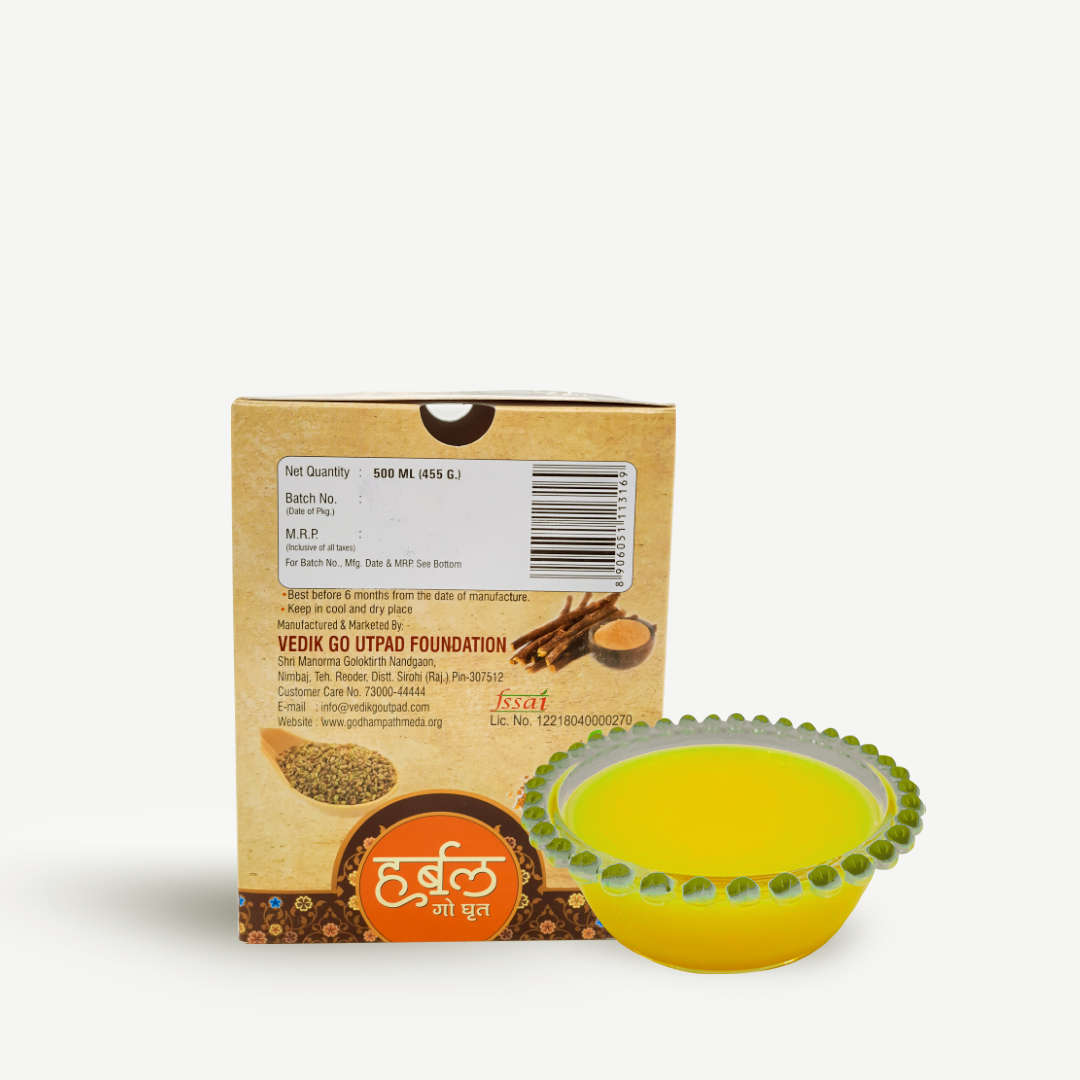 Our Desi Herbal Bilona Ghrit is made using traditional methods. Hand-picked gaushala provide fresh and pure cow milk, preserved before being converted into curd. The curd is then slowly churned clockwise & anti-clockwise to produce butter, which is subsequently heated to produce the highest quality pure cow ghee. This Vedic Herbal Ghrit contains Asparagus, Ashwagandha, Mulethi, Fenugreek, Turmeric, Ajwain, etc. thats aids in the lubrication of joints, is beneficial to ones health related to the musculoskeletal disorder, bile, and cough. The best to take is to mix it with warm milk and drink it.