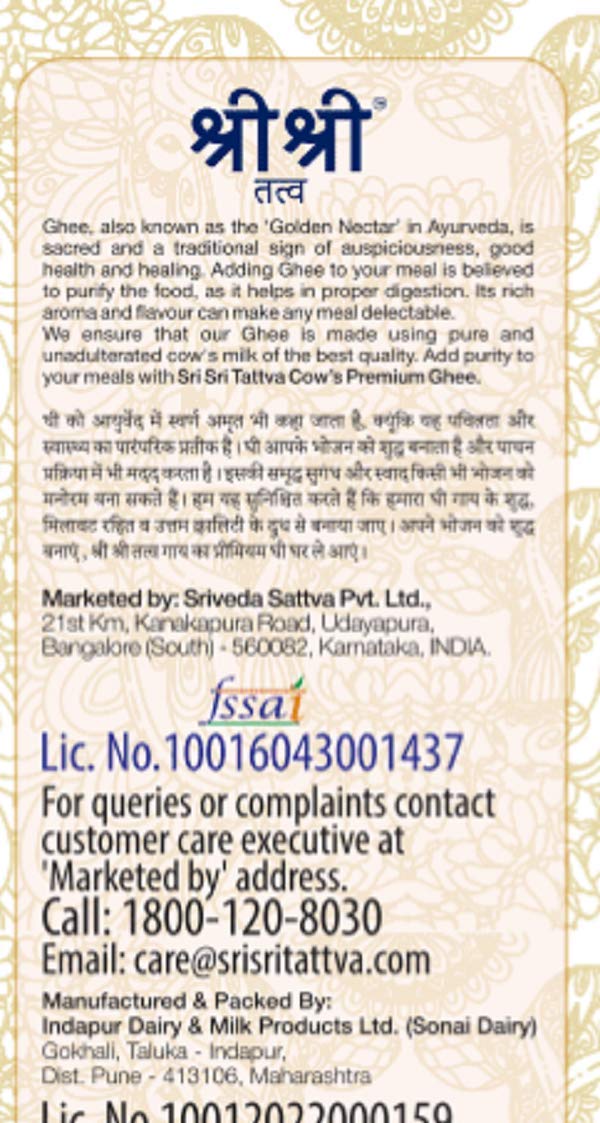 Sri Sri TATTVA shuddhta ka naam Sri Sri Tattva Premium Cow Ghee For Better Digestion&Immunity 1 Litre (Pack Of 1)