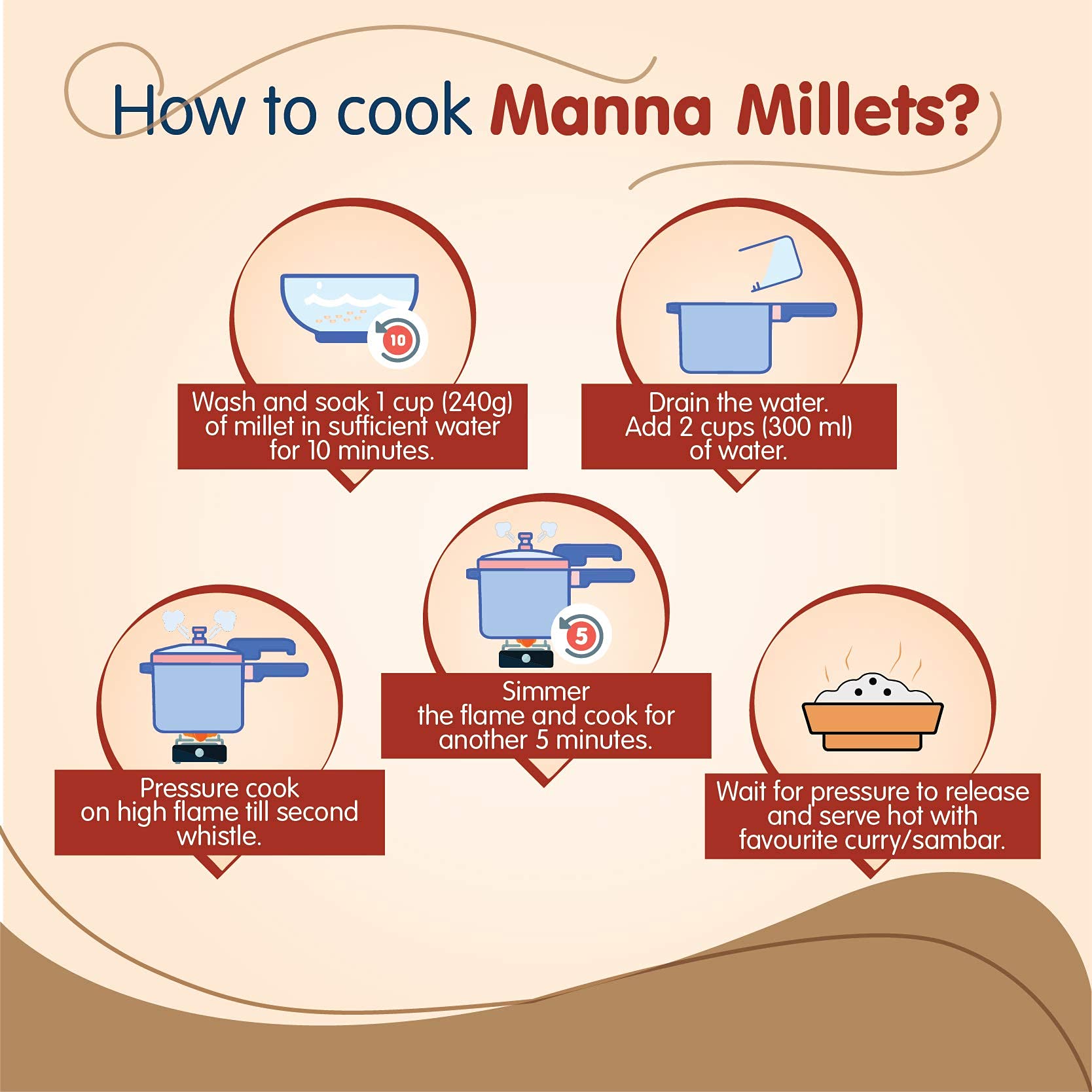 Manna Millets can be directly cooked and cooks like rice in 6-8 Mins. However it is recommended that its soaked since soaking removes the anti nutrients like phytic acid which reduces the absorption of nutrients to the body.