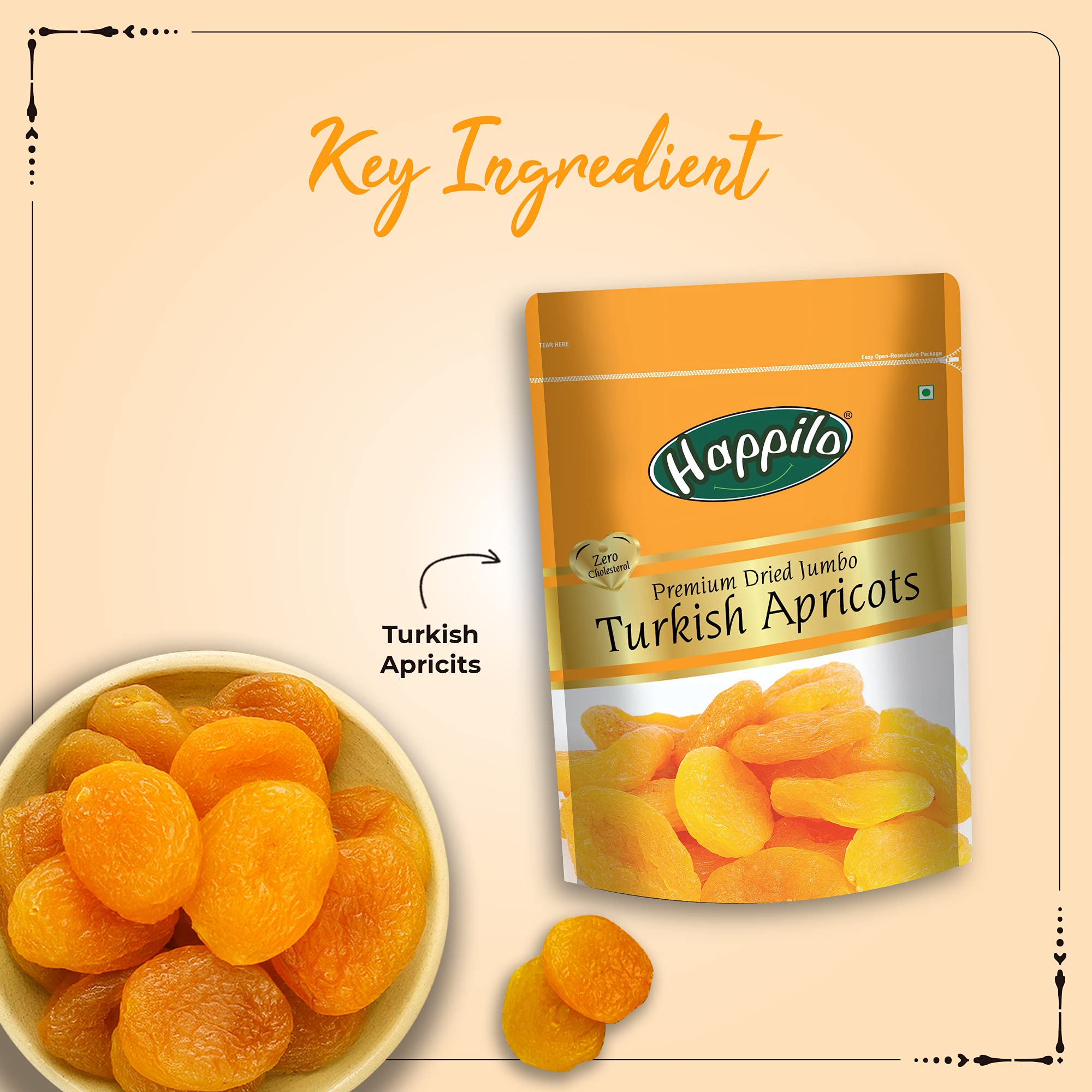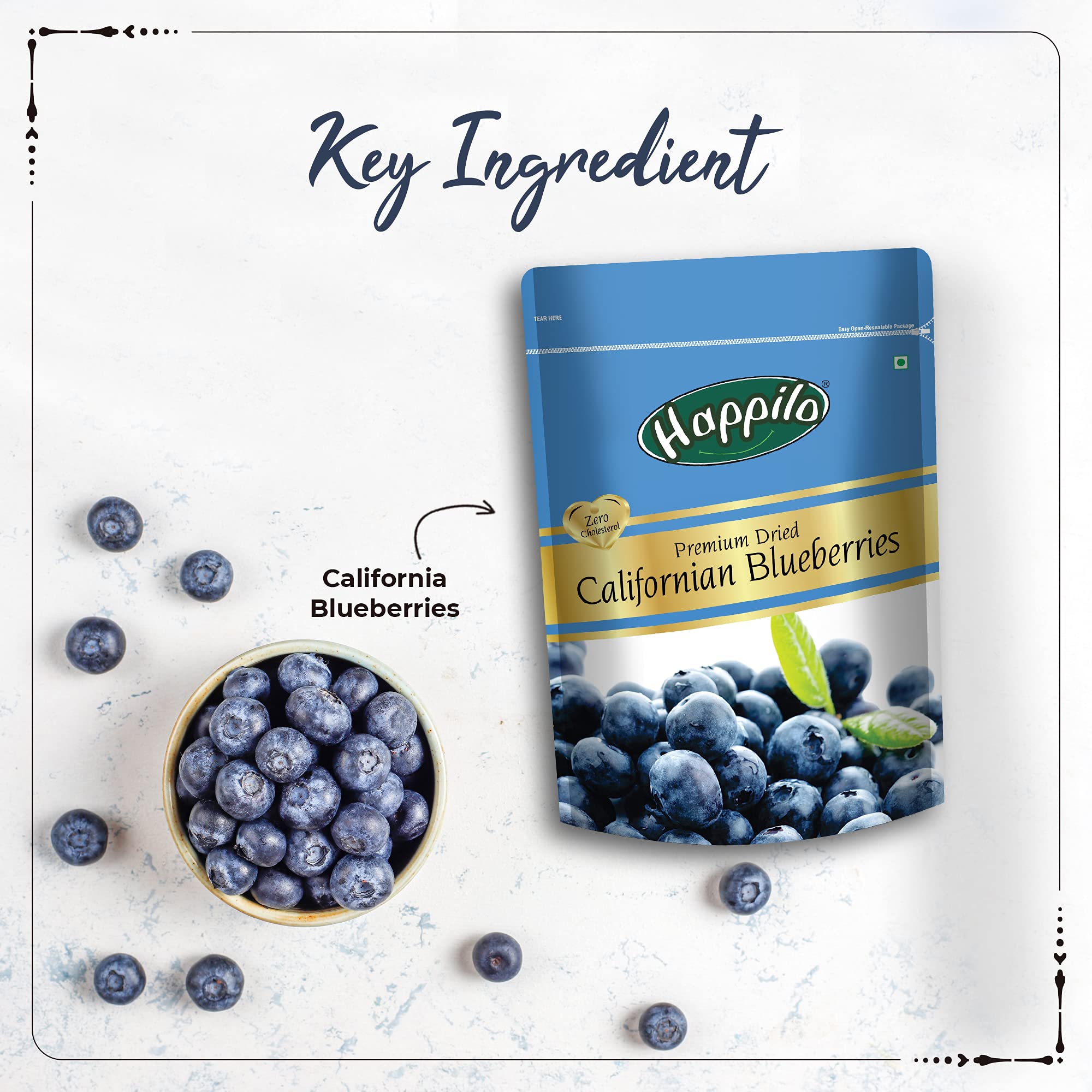 Happilo Premium Dried Californian Blueberries 150 g (Pack of 1)Happilo has travelled the world to get the finest gourmet dry fruits Dried Blueberries are the original candy- nature's candy. They are one of the most nutritious dried fruits in the world. famous for their sweetness so they're a yummy healthy snack. They have double the deliciousness of ordinary dried blueberries. Great for Snacking adding to Cereal Cooking and Baking. High Antioxidants Dietary Fiber No Gluten Non GMO Zero Trans Fat & Zero Cholesterol. Daily need products for a healthy and energetic life. Happilo Zip Lock Pouch with airtight seal to ensure the product is protected and fresh. Quality assured - Happilo products are rigorously tested against the industry's best quality standards.Happilo Premium Jumbo Turkish Apricots 200g (Pack of 2)Happilo has travelled the world to get the finest gourmet dry fruits. They are one of the most nutritious dried fruits in the world they're a yummy healthy snack. Great for Snacking adding to Cereal Cooking and Baking. High Antioxidants Dietary Fiber No Gluten Non GMO Zero Trans Fat & Zero Cholesterol. Daily need products for a healthy and energetic life. Happilo Zip Lock Pouch with airtight seal to ensure the product is protected and fresh. Quality assured - Happilo products are rigorously tested against the industry's best quality standards.