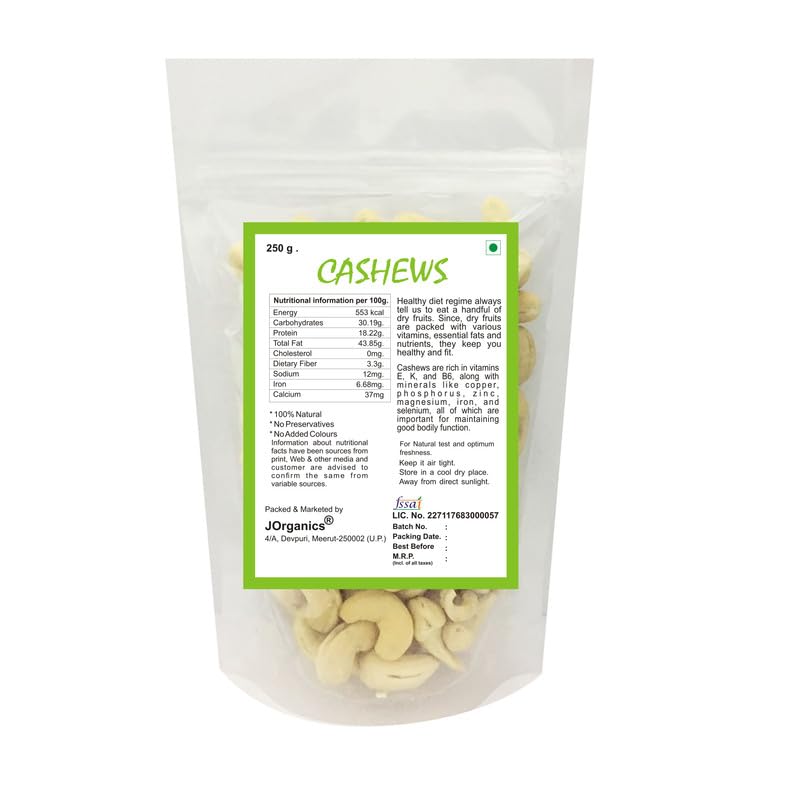 JOrganics Cashew Nuts 250gm Dry Fruits Nuts & Seeds | Healthy Natural Snack | Rich in Protein Fiber & Antioxidants | Boost Energy & Immunity | 100% Pure & Fresh