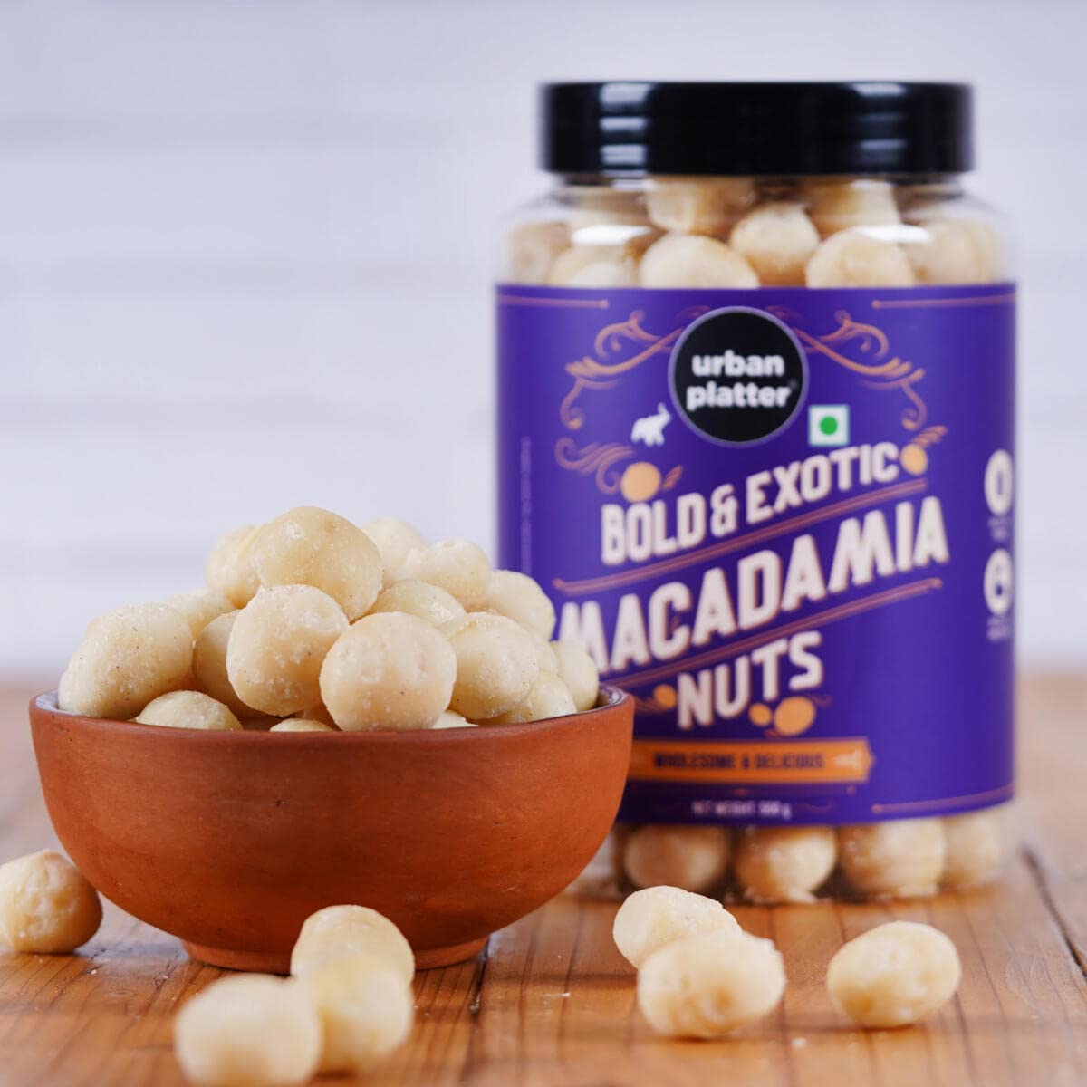 Urban Platter Bold and Exotic Macadamia Nuts 1kg (Grade A Premium Quality Crunchy perfect for guilt-free snacking)These nuts can be consumed as they are or with tea/ coffeeCan be roasted and salted to give oneself a delightful treat They have the highest amount of beneficial mono unsaturated fats of any known nut. Thus they are considered great for patients with hyperemia and You can dip them in chocolate sauce and freeze to get yummy chocolate flavored macadamia nuts Once opened refrigerate and use macadamia nuts within two months