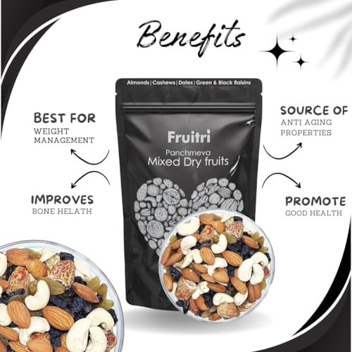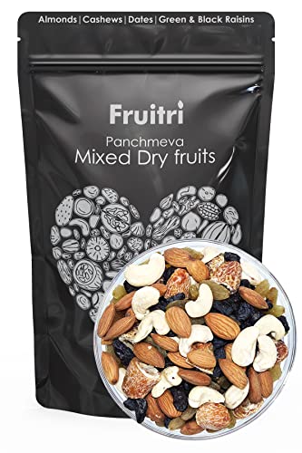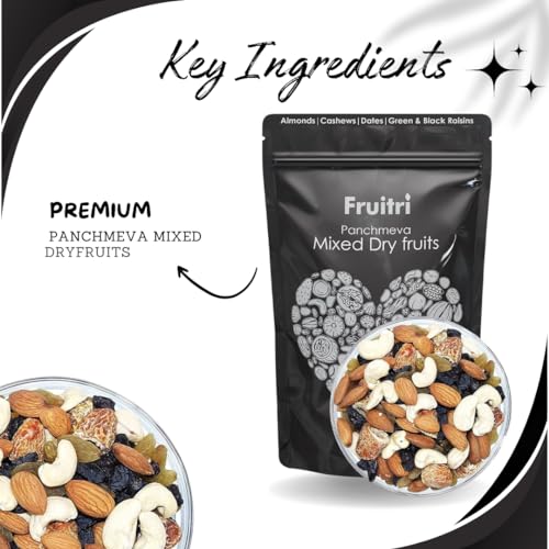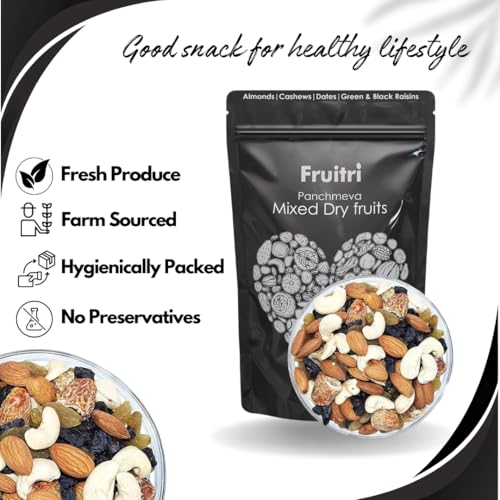 PREMIUM SELECTION: Fruitri Panch Meva Mixed Dry Fruits are made from a carefully selected blend of high-quality almonds cashews dates green and black raisins.