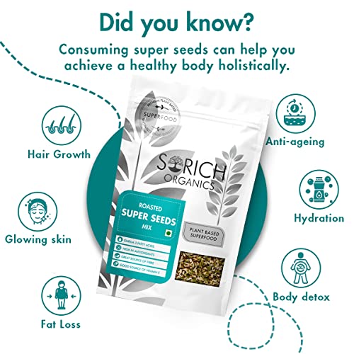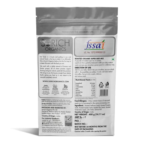 A specially formulated 5 in 1 organic roasted seed mix that is perfectly balanced to give you daily dose of nutrition in a delicious way. This roasted seed mix consists of pumpkin seeds sunflower seeds roasted flaxseeds chia seeds and seeds which provide this product a of nutrients. The crunchy and delicious combination of seeds offers a number of benefits. It is high in antiand loads of dietary fiber which means that you will stay full for longer. organic Seed mix is high in omega-3 fatty acids and is essential in providing nutrition to both the body and the brain. One can it to raitas blend it into smoothies or top salads with it - the possibilities are countless. Sorich sources each of its seeds from tried and tested Indian farmers and assures that the product contains zero itives and is completely natural.