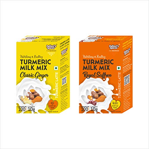 Turmeric Milk Mixes has 1 Royal Saffron and 1 Classic Ginger pack of 50g. One 50g pack each contains 5 sachets of 10g. One sachet is good for 20 cups of 100 ml milk. Quantity can differ according to taste. Popularly known as Haldi-Dudh (Turmeric Latte in West) this is a traditional Indian mix of turmeric ginger Saffron/Ginger & select added in hot milk offering many health benefits You may add jaggery/honey to your taste. Add 1tbsp Desi Ghee in the hot milk (optional). Stir well & serve. Note: Jaggery/honey is not added while boiling the milk. Add it later before serving.