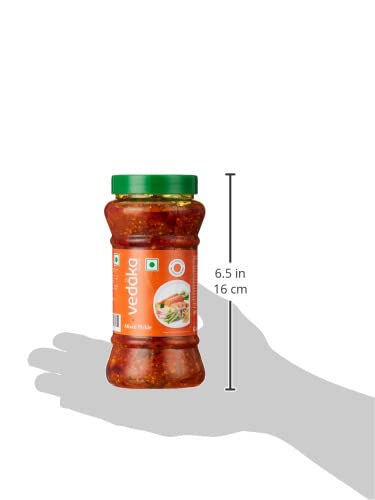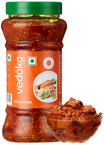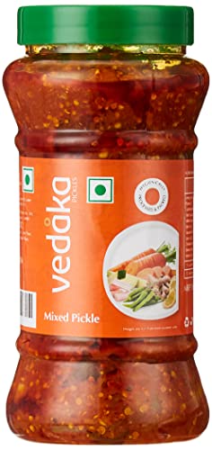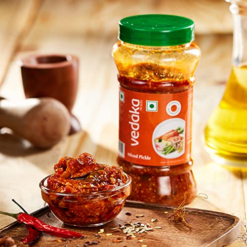 Introducing Vedaka Mixed Vegetable Pickle. Made with high quality fresh vegetables this traditional home-style pickle packs in a mouth-watering combination of spicy and tangy flavors. The ideal balance of skillfully curated spices aromatic oil and garden-fresh vegetables adds a lip-smacking punch to your daily meals. The mustard oil used to pickle the vegetables adds to the robust taste texture and aroma of the product. The Vedaka Mixed Vegetables pickle is a flavorsome condiment that enhances the taste of idli dosa samosa paratha khichdi khakra etc. and adds a tangy punch to almost every Indian dish out there. Relish the taste of crunchy carrots spicy chillis delectable tomatoes and more with this mixed vegetable pickle that tastes like home- made pickle. The product is hygienically packed in PET jars to keep the freshness and flaD4vor intact. The packaging is certified by HACCP (a GFSI recognized certification programme).