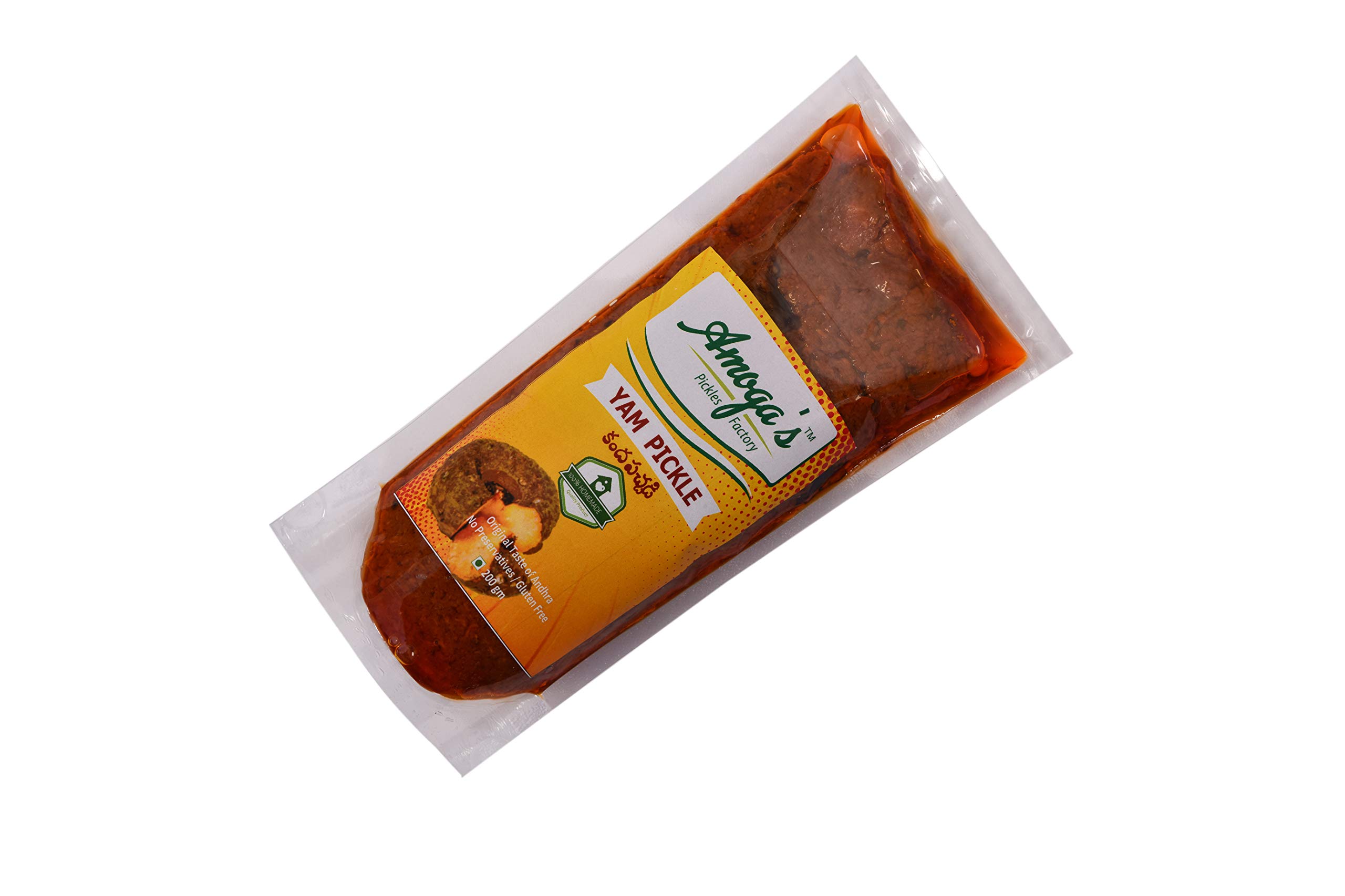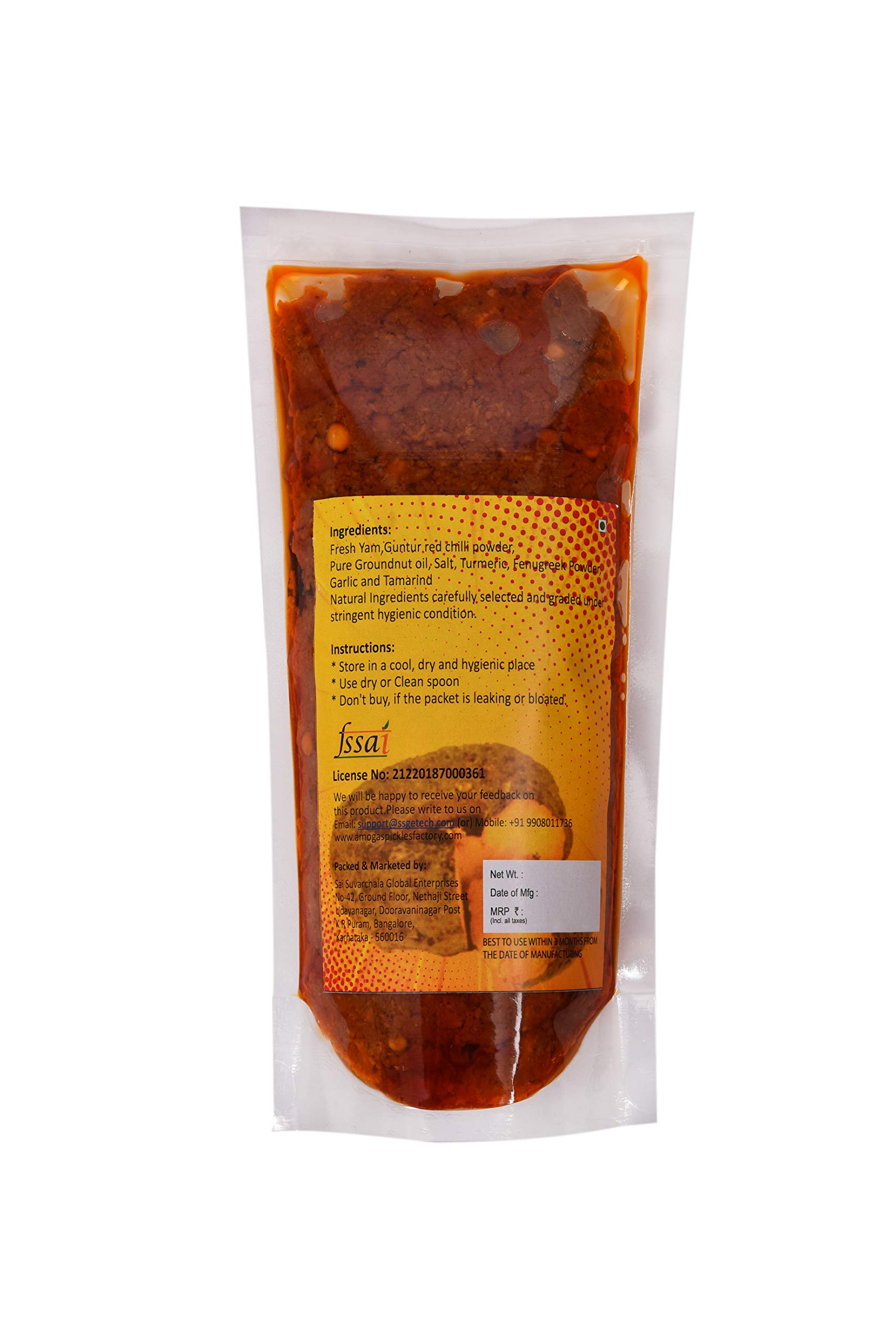 Elephant foot yam commonly known as Suran is a tuber crop that is also raised as a cash crop. It is scientifically known as Amorphophallus paeoniifolius and belongs to the family Araceae. It grows mostly around monsoon season. This vegetable is rich in fibre and is grown largely in Indian states of West Bengal Bihar Andhra Pradesh Odisha and Karnataka.Elephantâs foot yam also includes carbohydrates and protein equivalent and hence provides you with immediate energy. Regular intake of this vegetable keeps you fit and healthy.Elephant foot yam is rich in vitamin C Mango pickle is one of the most commonly made condiment in indian homes. Avakaya is a popular pickle variety from andhra cuisine a cuisine well-known for its hot & spicy foods.100% handmade by the women. No artificial preservatives Gluten Free. Preserved traditionally in earthen jars