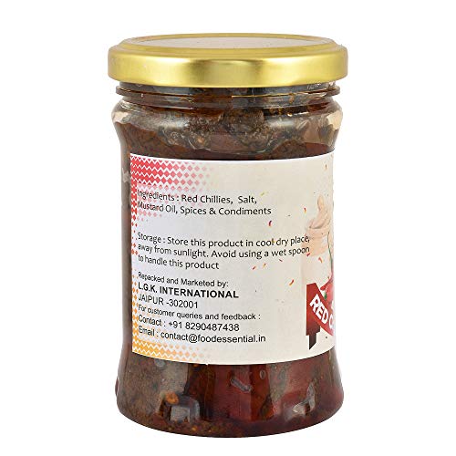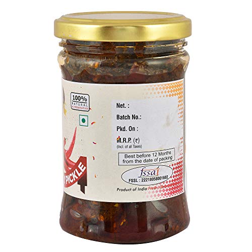 "A traditional Pickle made Red Chillies and freshly-mixed spices. This pickle is prepared with the traditional recipe which has been passed over generations which ensures the homemade taste. It has got a tangy and spicy flavour. It can be enjoyed and relished with Parantha Roti Thepla Puri or any snacks or curd. This pickle is naturally matured and preserved using edible oil only. Just remove the excess oil while eating and enjoy the rich flavours."
