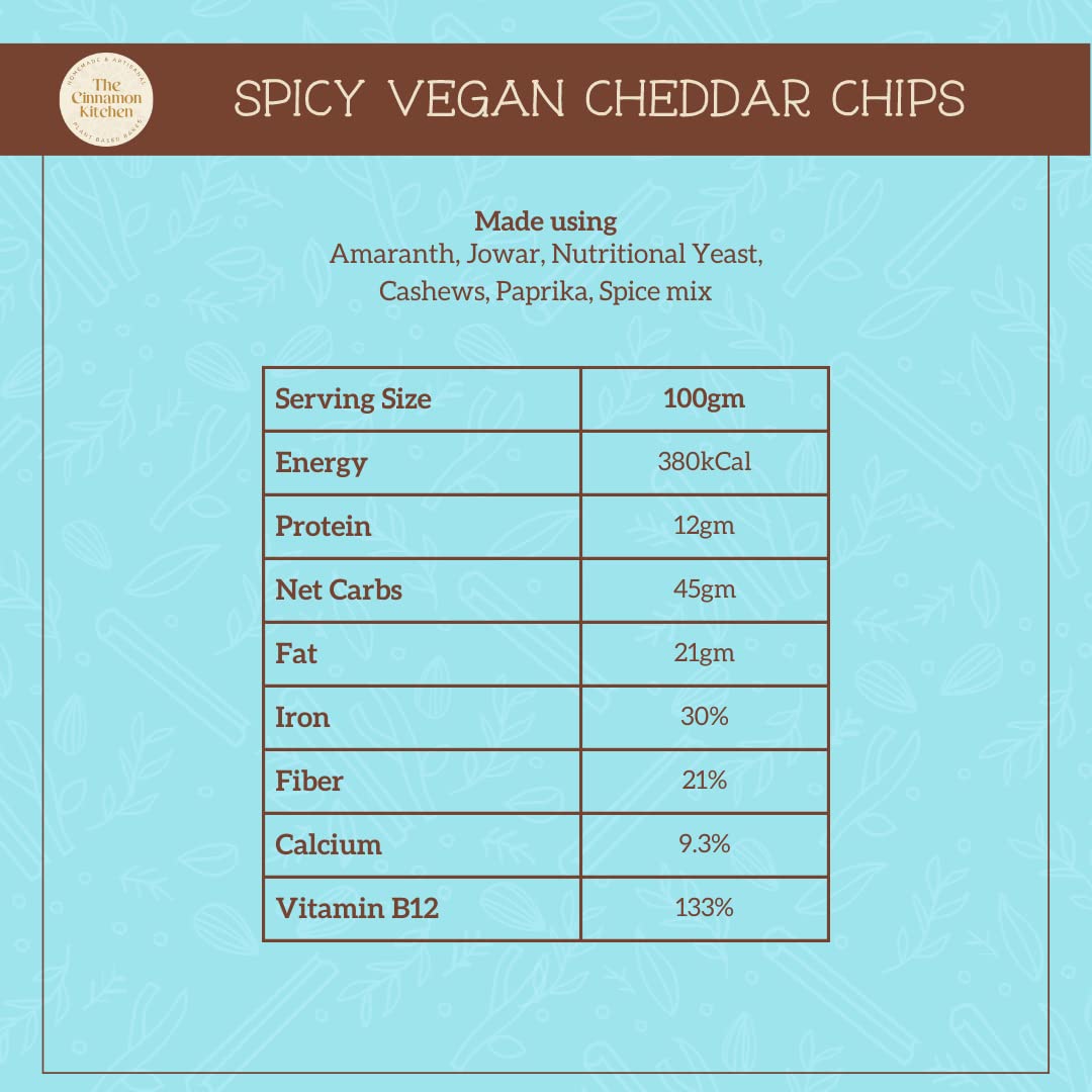 SPICY AND VEGAN CHEDDAR CHIPS Our Vegan Spicy Cheddar Chips are a perfect healthy alternative when youâre craving for for chips. Theyâre dairy free made using our inhouse cheddar spice mix high in vitamin B12 (which weâre all generally deficient in)